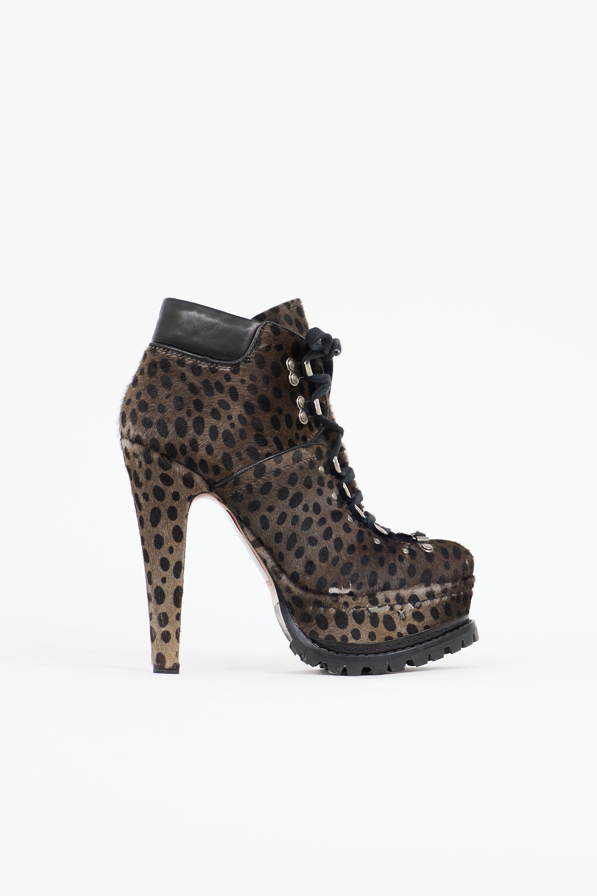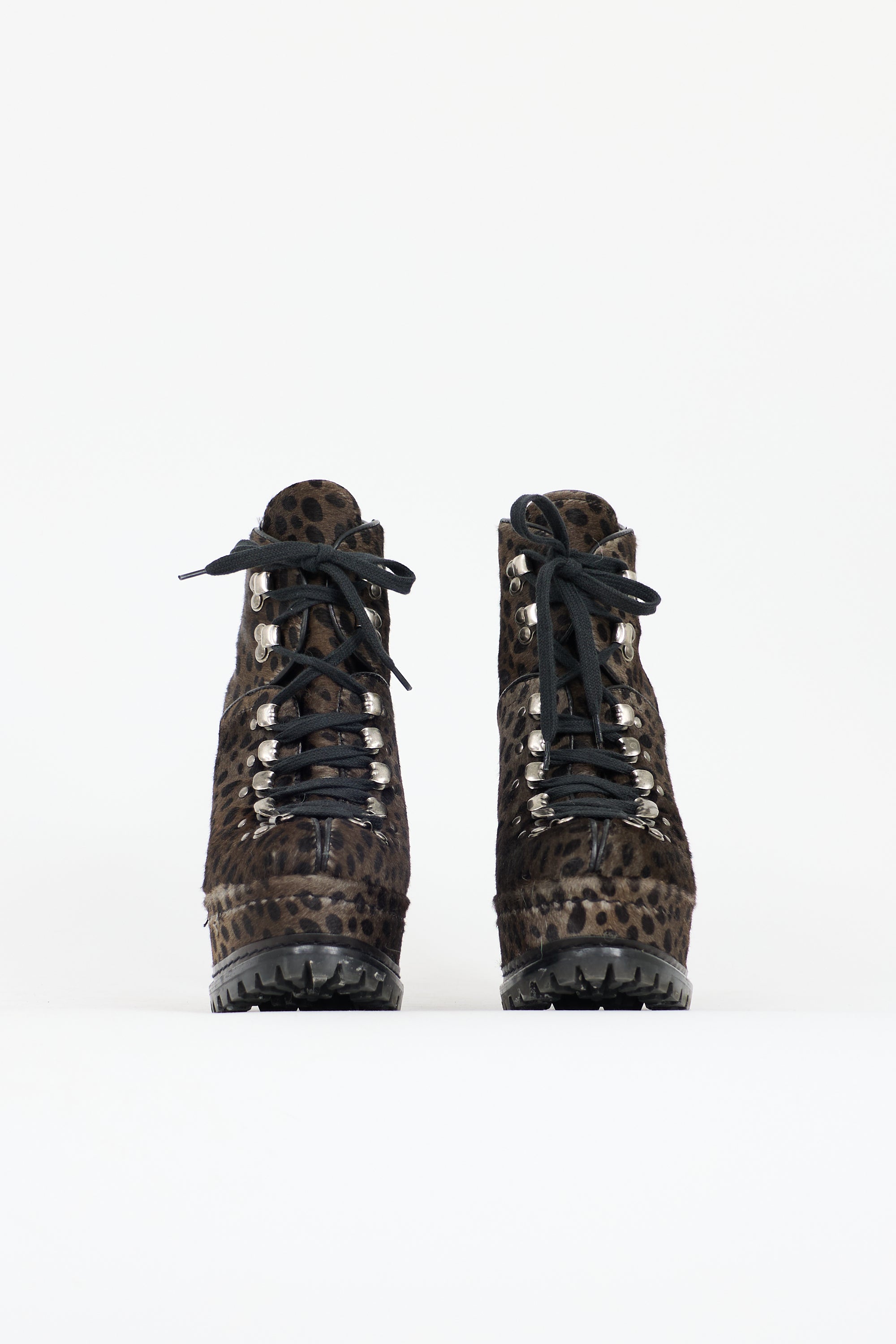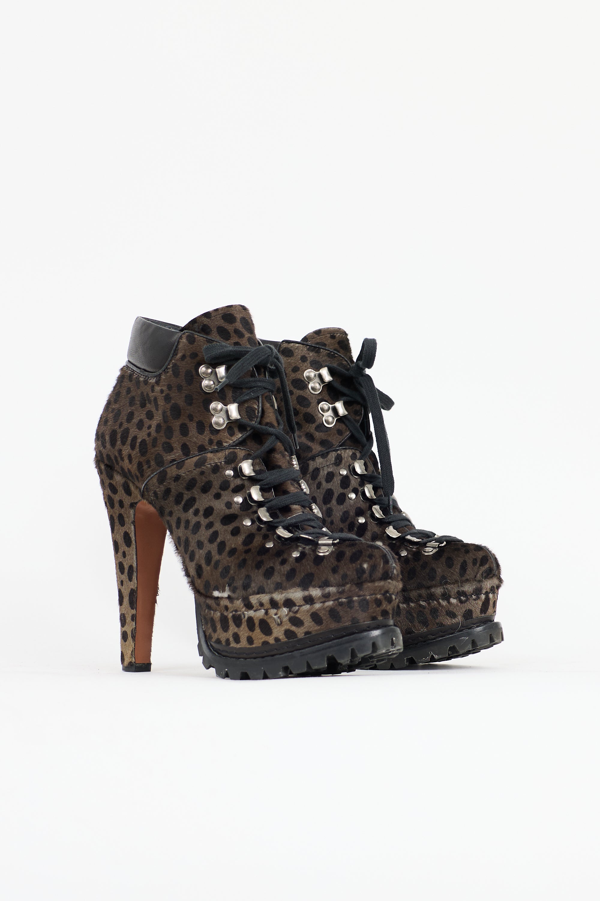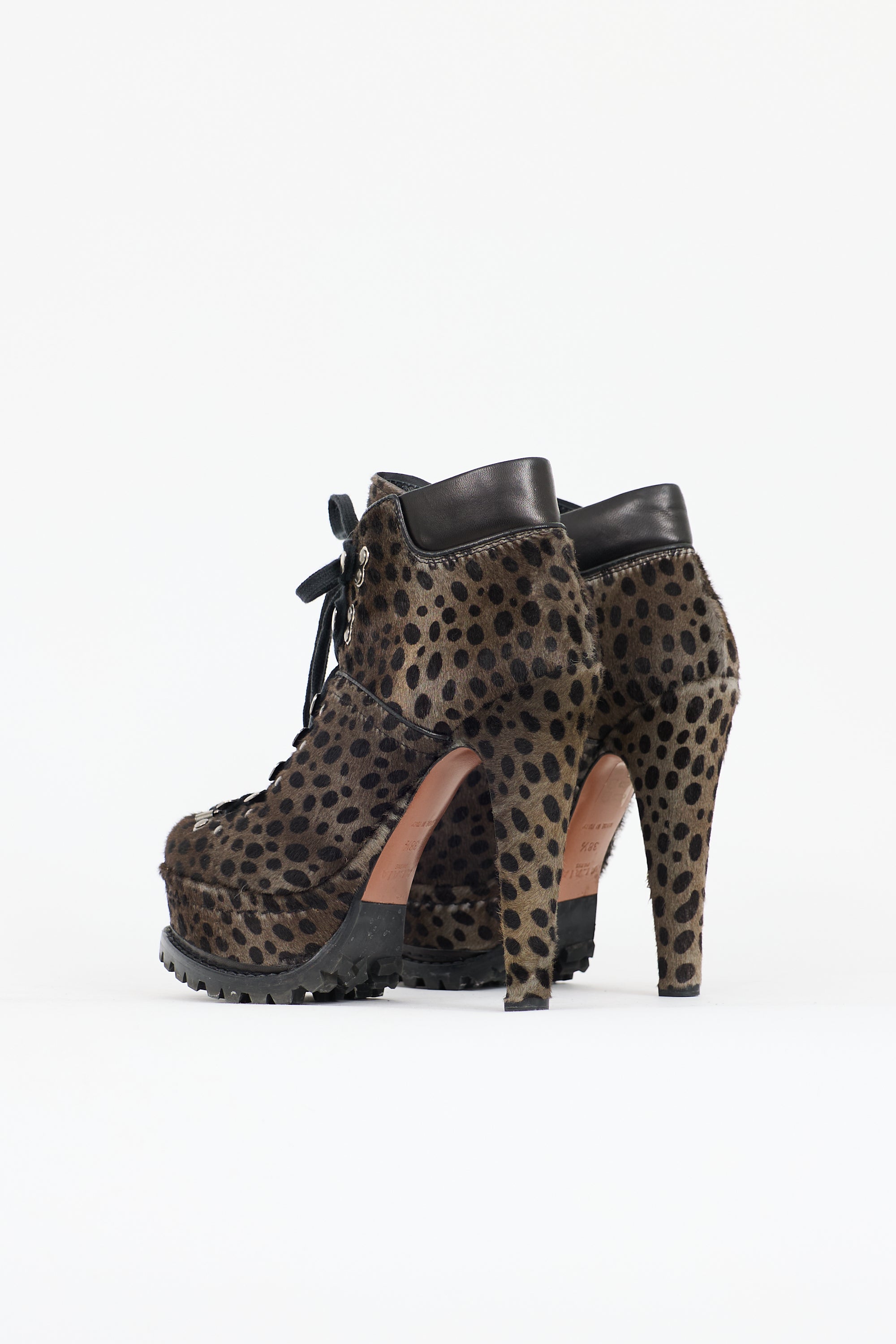 Pre-owned Alaïa brown and grey pony hair platform boots featuring an animal print throughout, almond toe, lace up front, black leather padded collar, covered platform and heel, and a treaded rubber outsole.