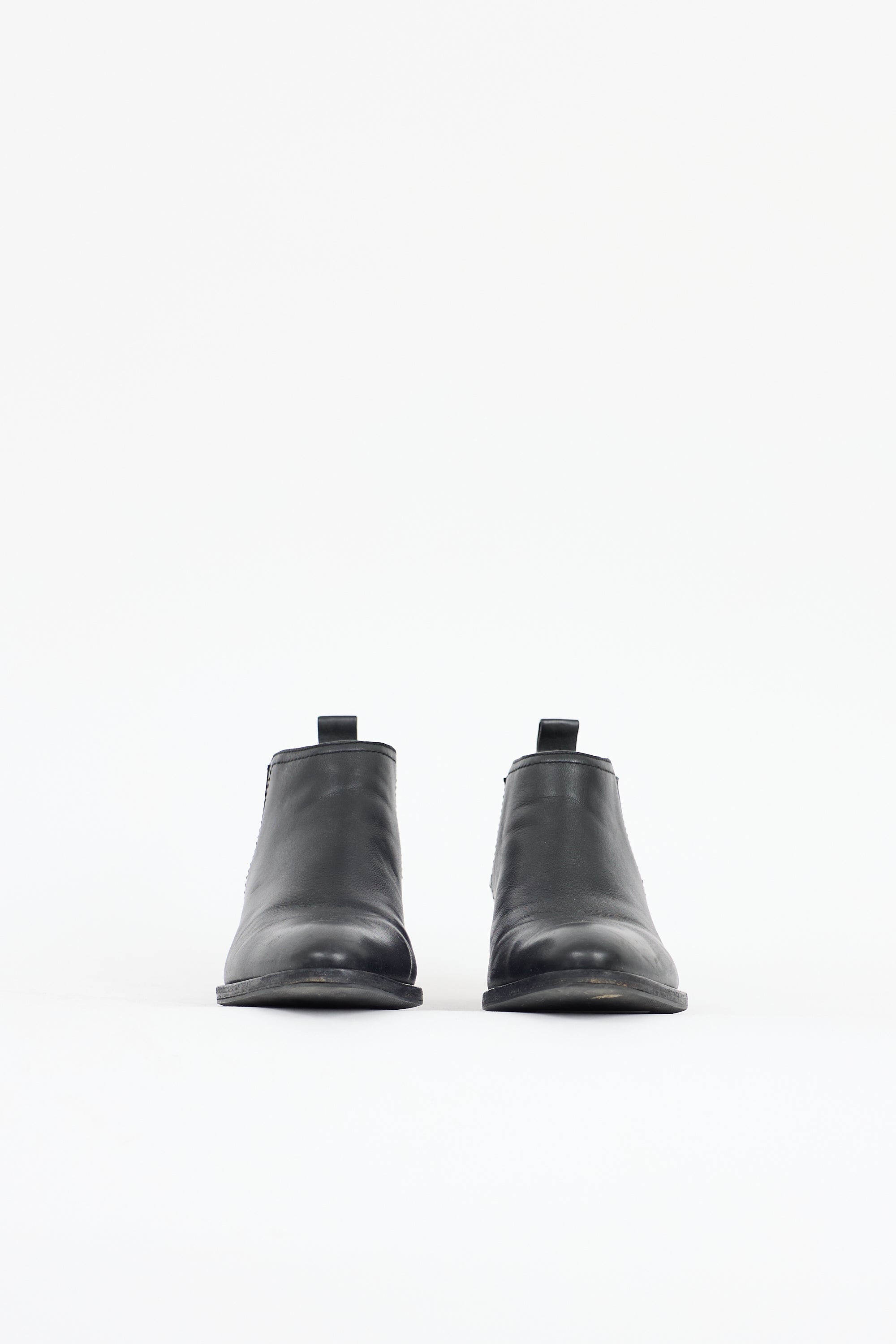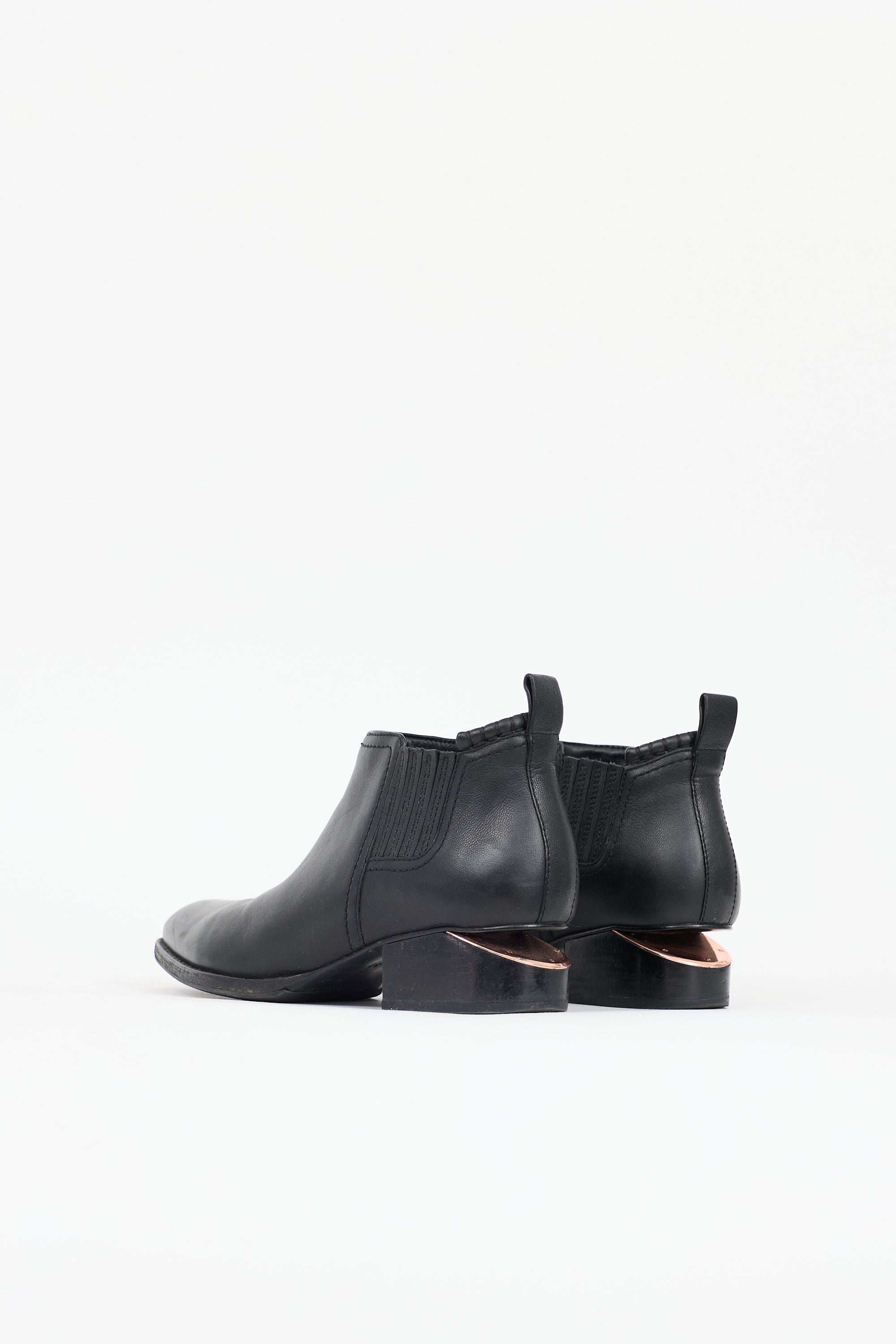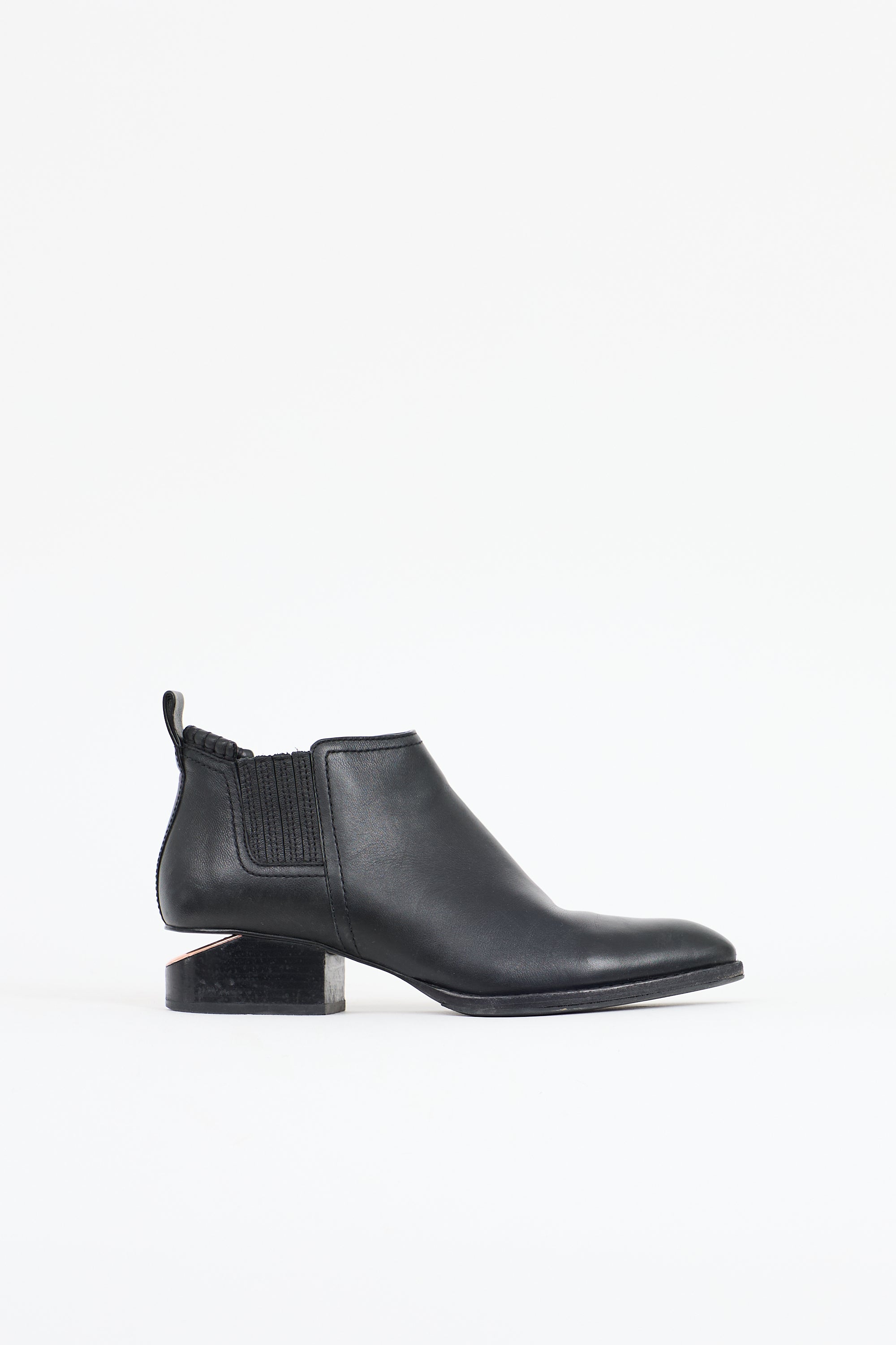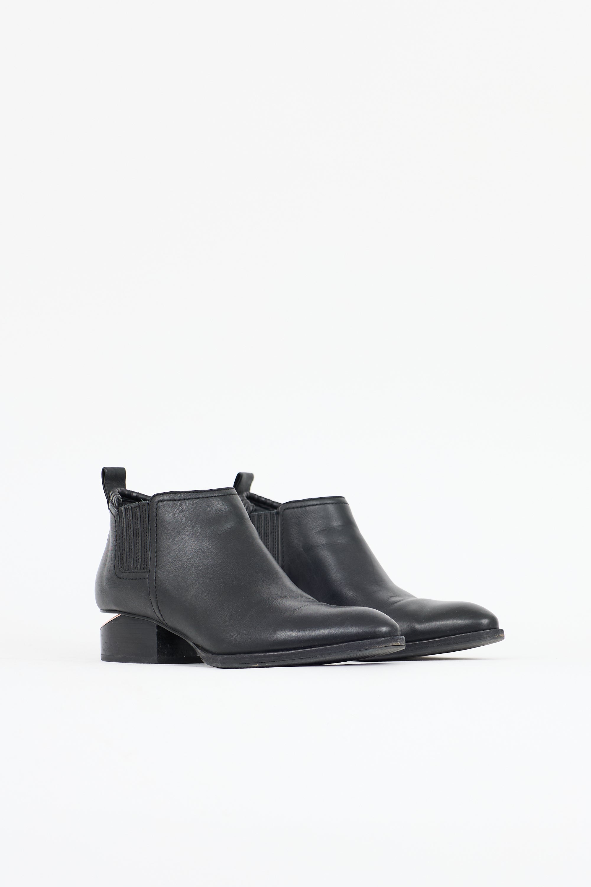 Pre-owned Alexander Wang black leather Kori ankle boots featuring an almond toe, pleated elastic gore at sides, pull tab at counter, and a cutout stacked heel with rose gold tone metal plate.