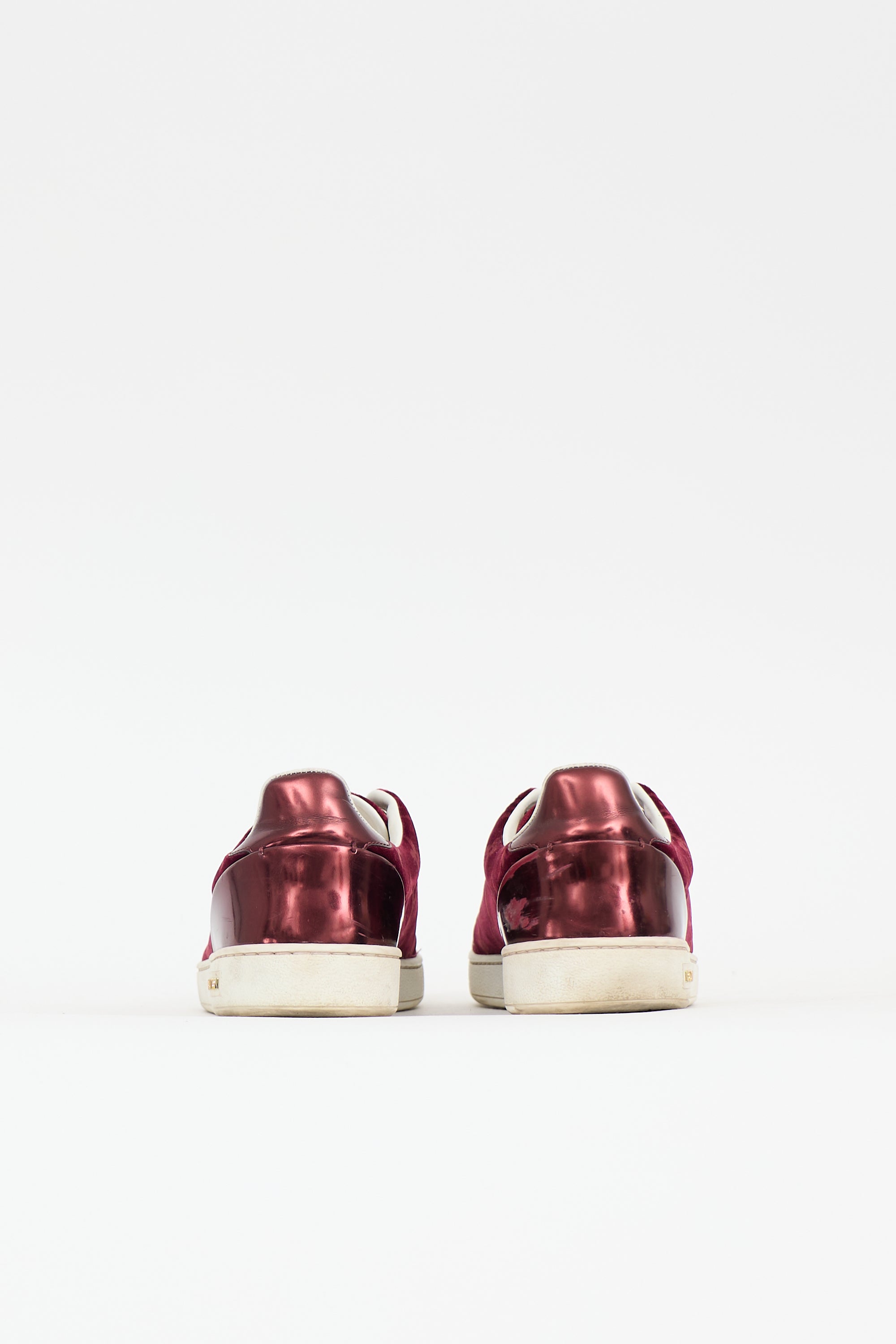 Pre-owned Louis Vuitton burgundy velvet Time Out sneakers featuring rounded toe, lace up front, monogram upper, metallic leather heel counter, and gold tone logo hardware at side midsole.