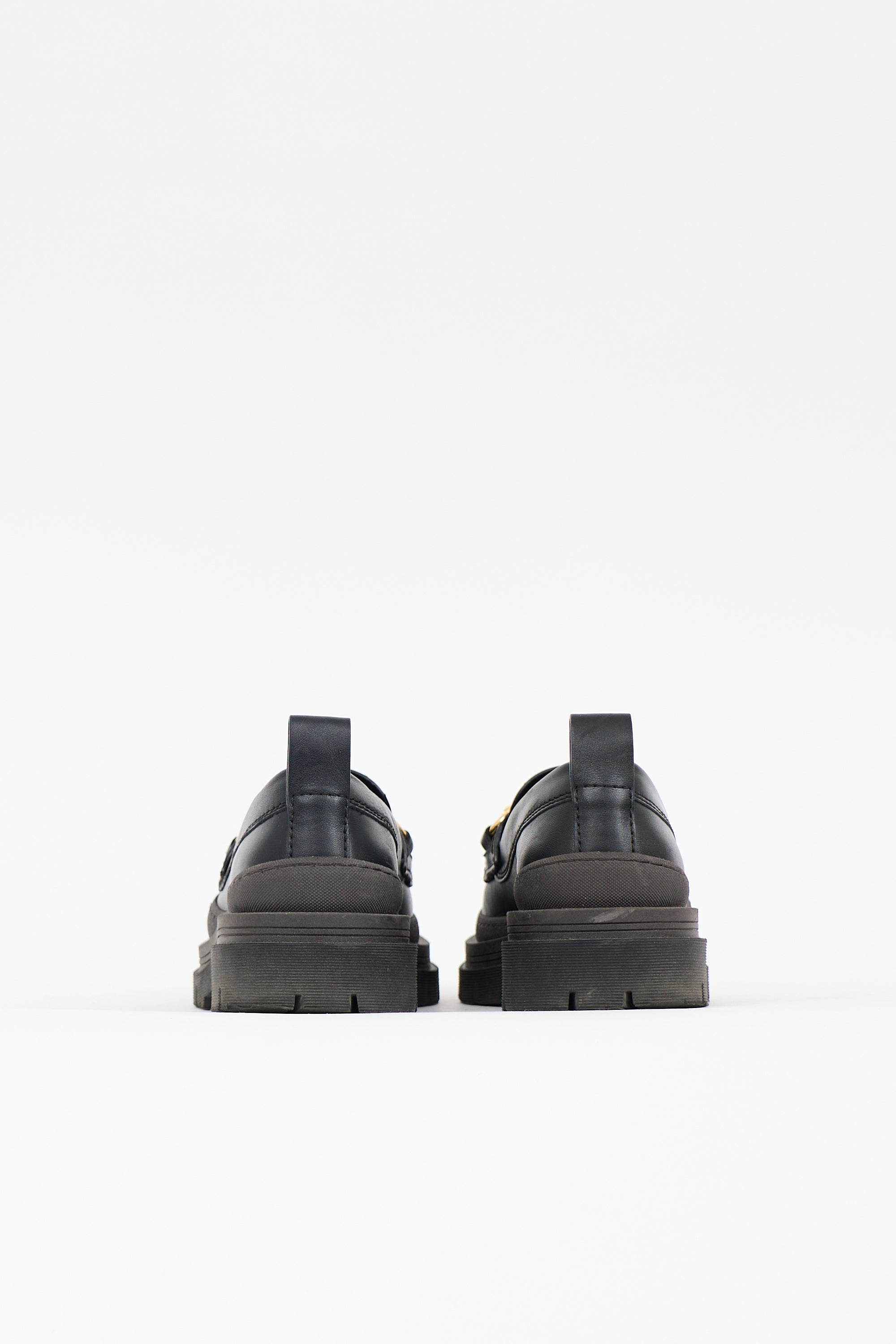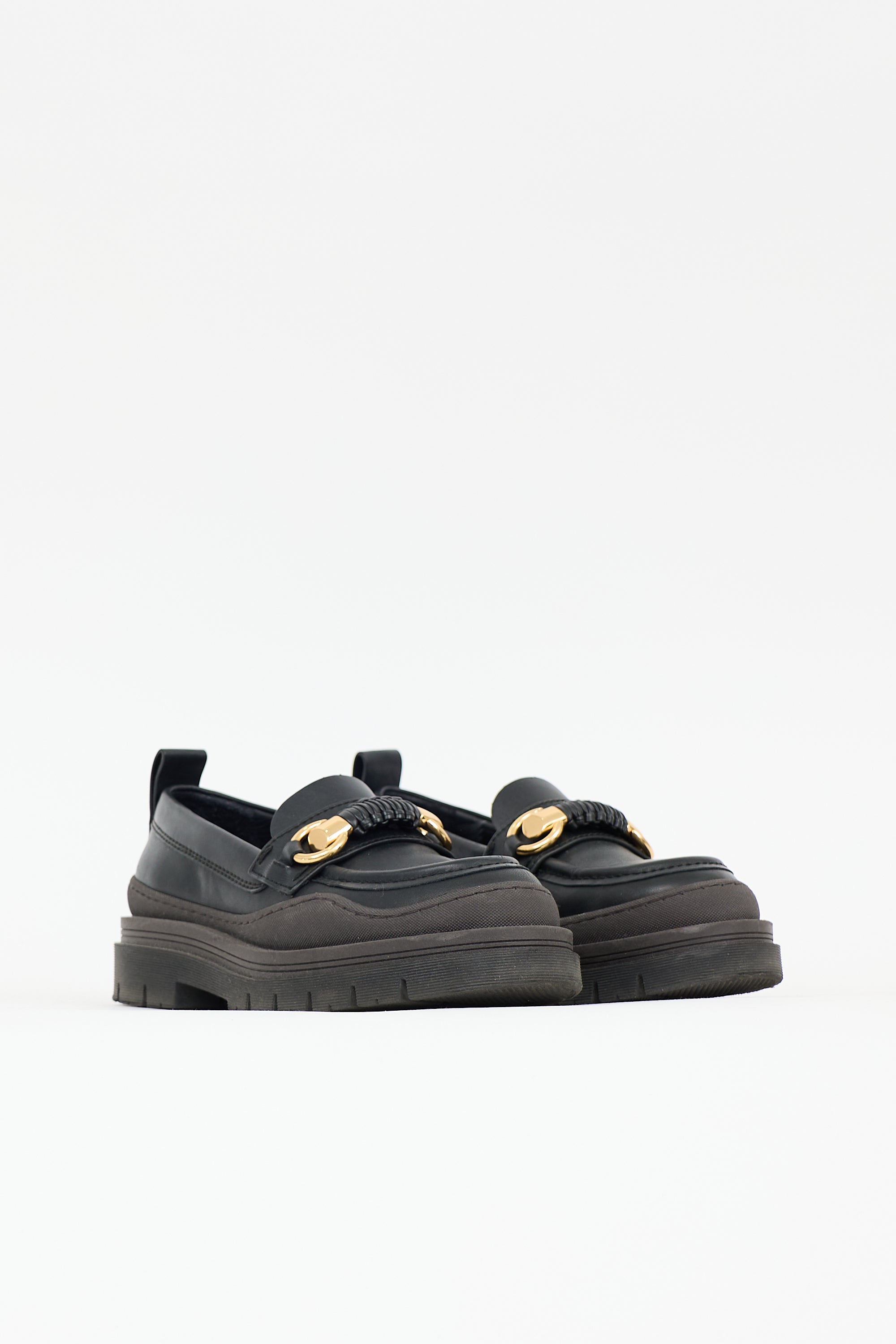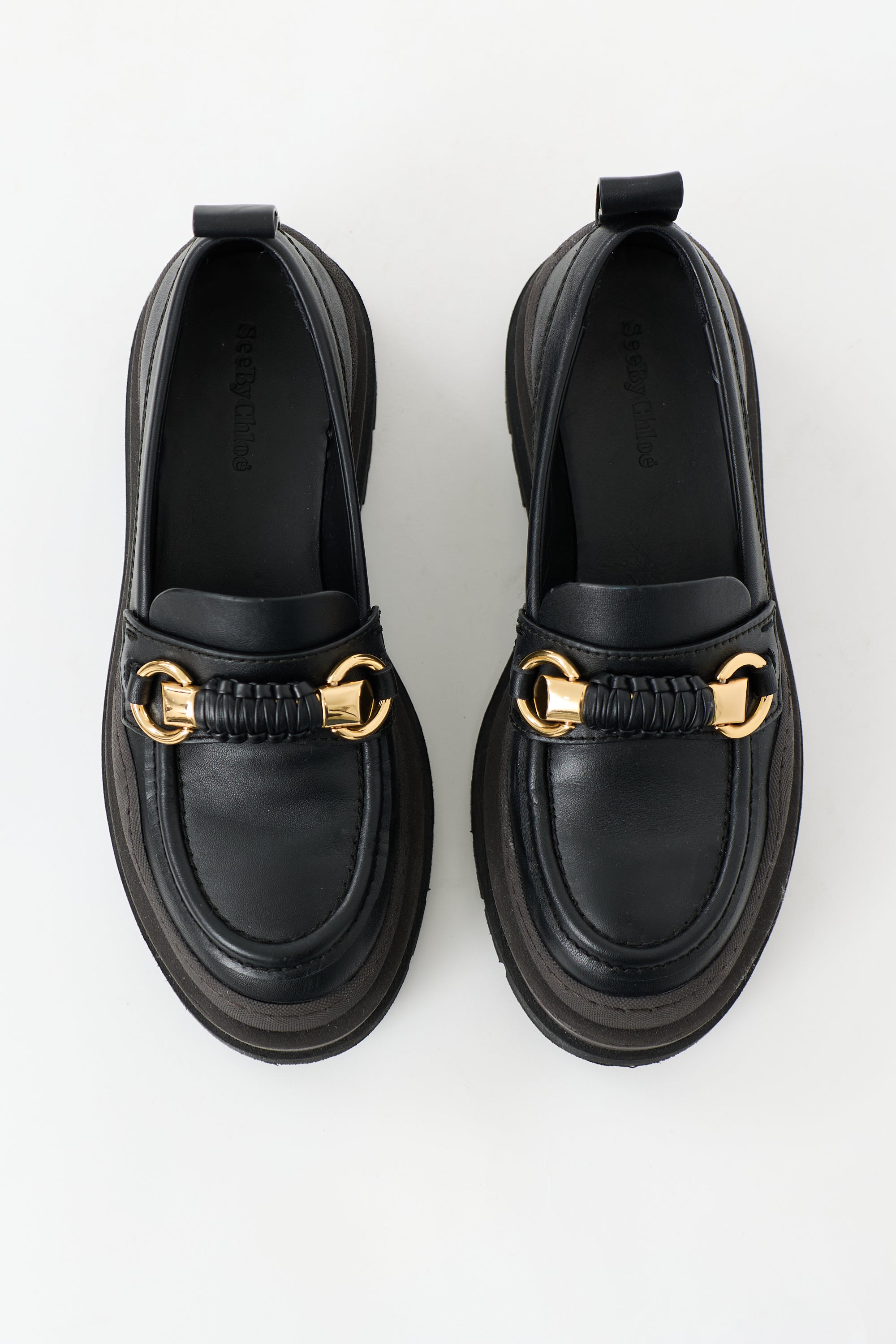 Pre-owned See by Chloé black leather Lilya loafers featuring rounded toe, gold tone hardware at front, brown rubber midsole, and lug sole.