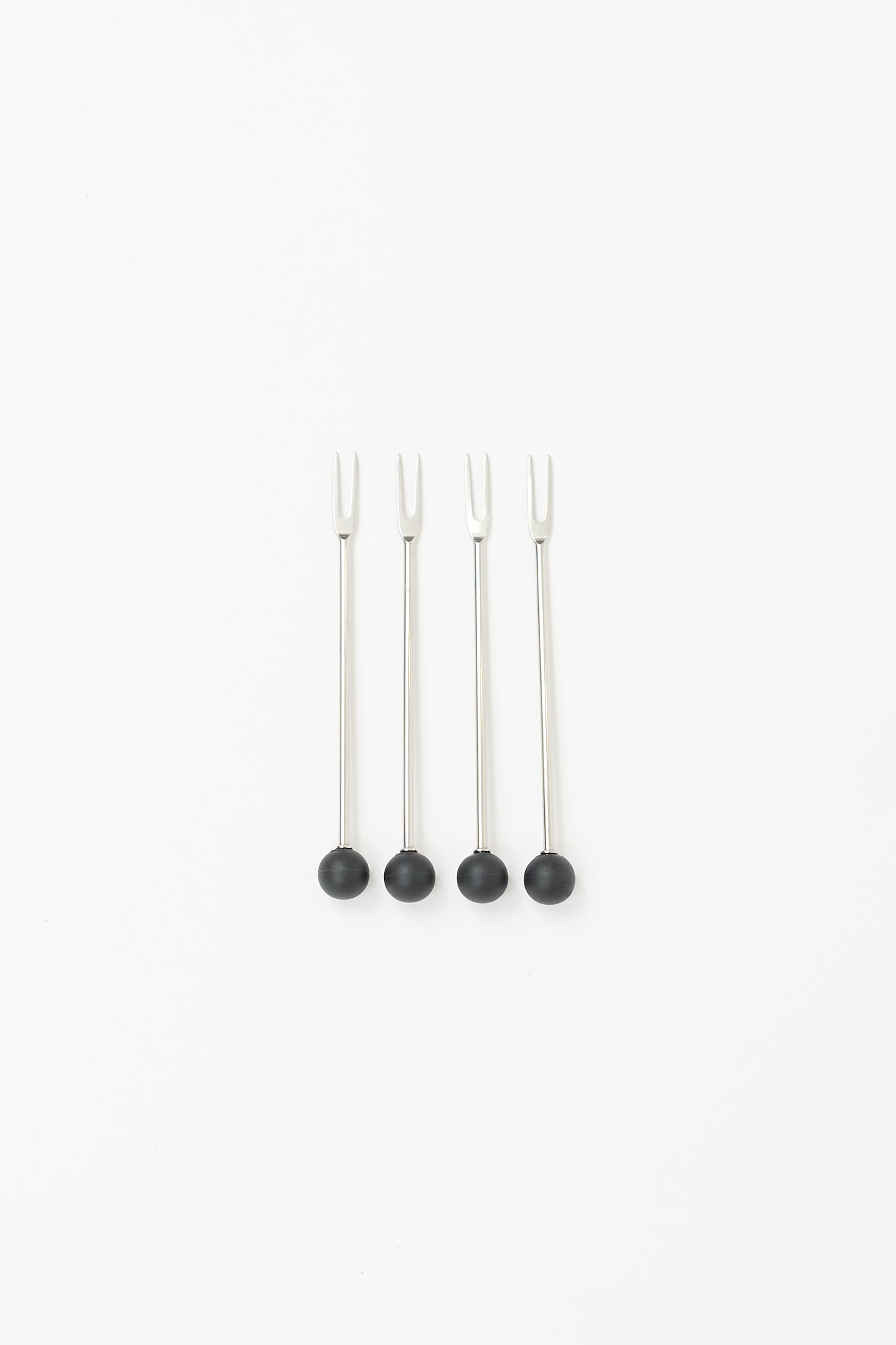 Pre-owned Alessi set of four 4.75" small stainless steel forks featuring two prongs and black spherical accent at handle tip. Designed by Michael Graves. Comes with original box.