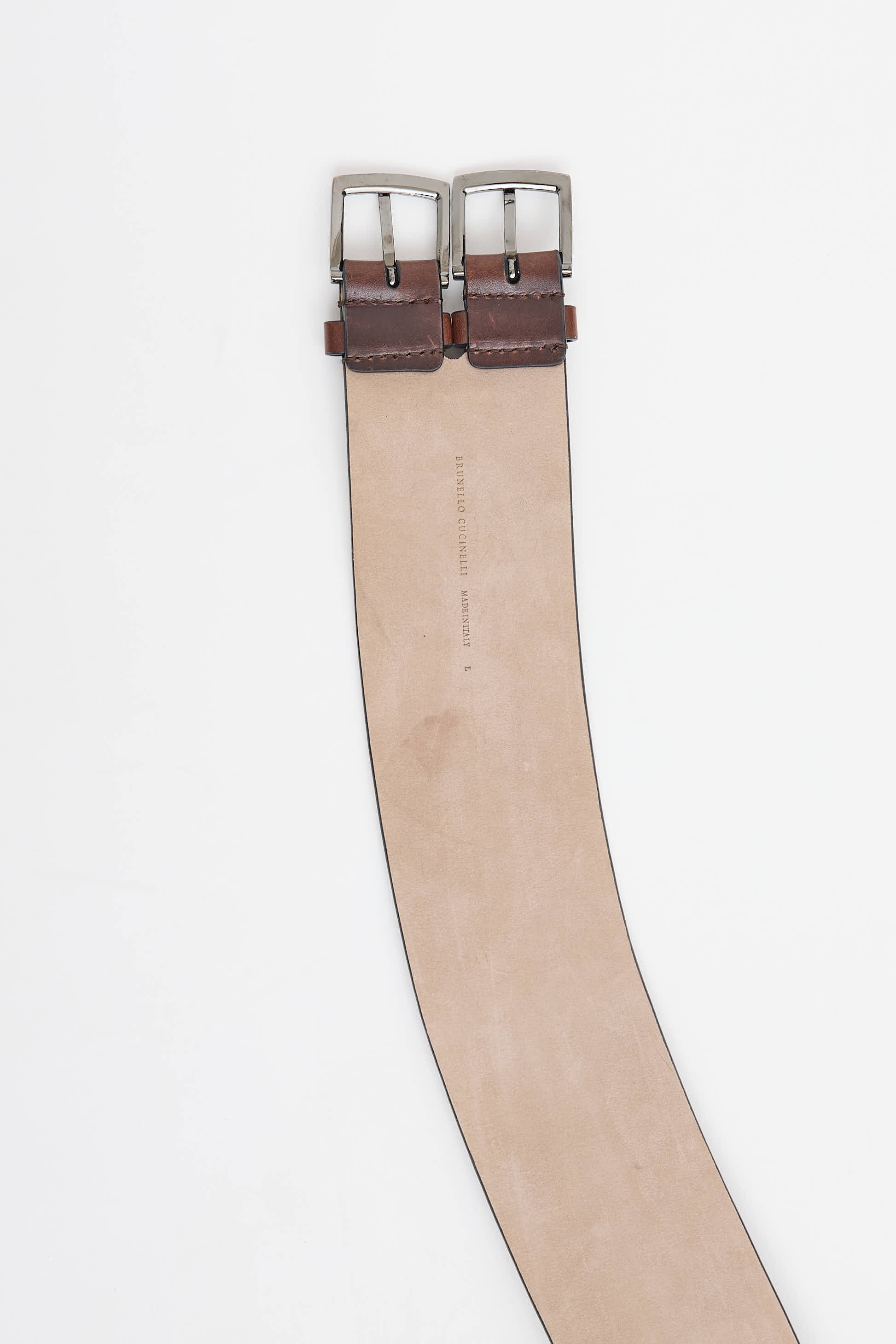 Pre-owned Brunello Cucinelli brown leather wide belt featuring ajustable double buckle front with push peg closures, gunmetal hardware, and Monili trim throughout.