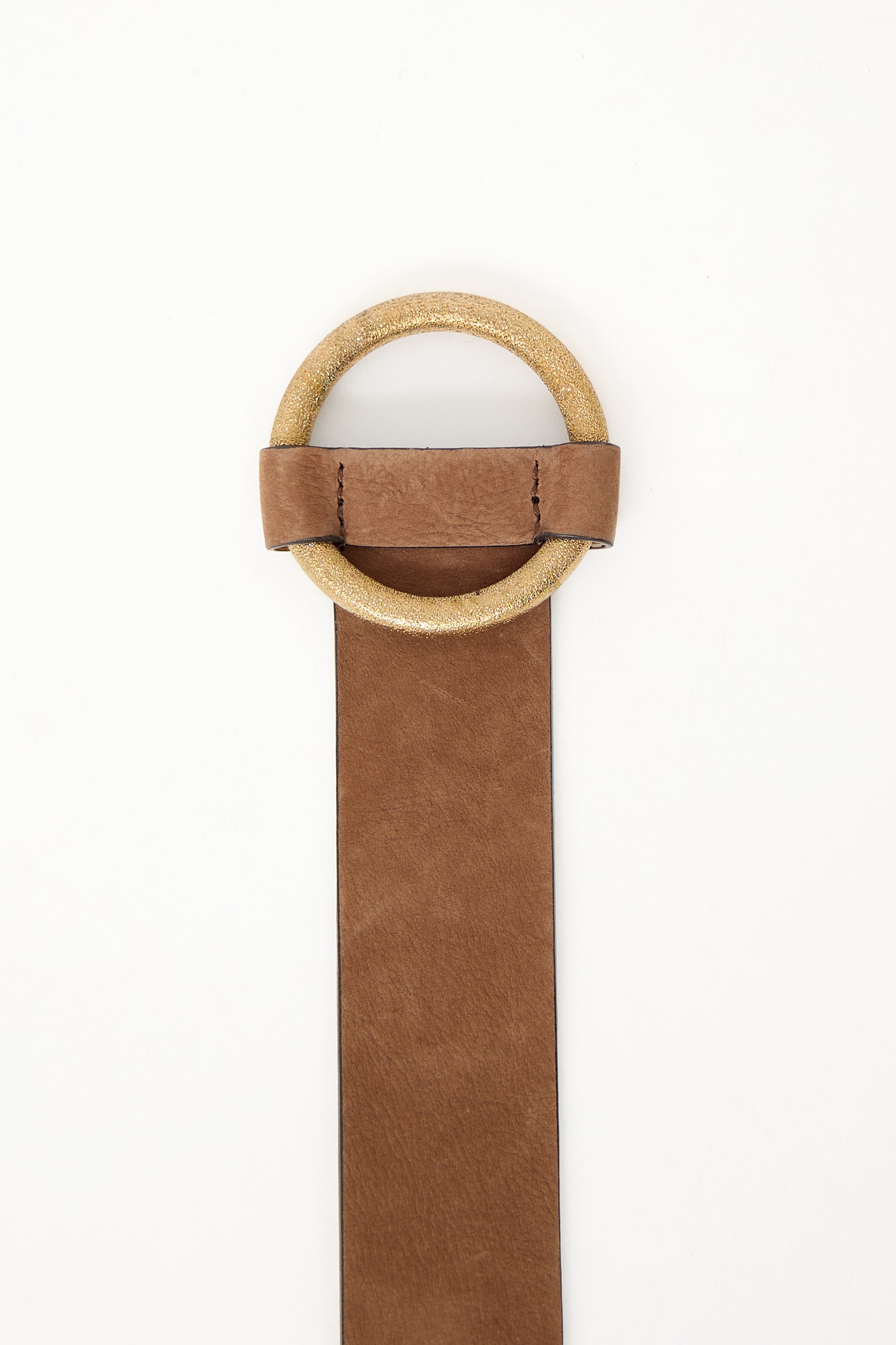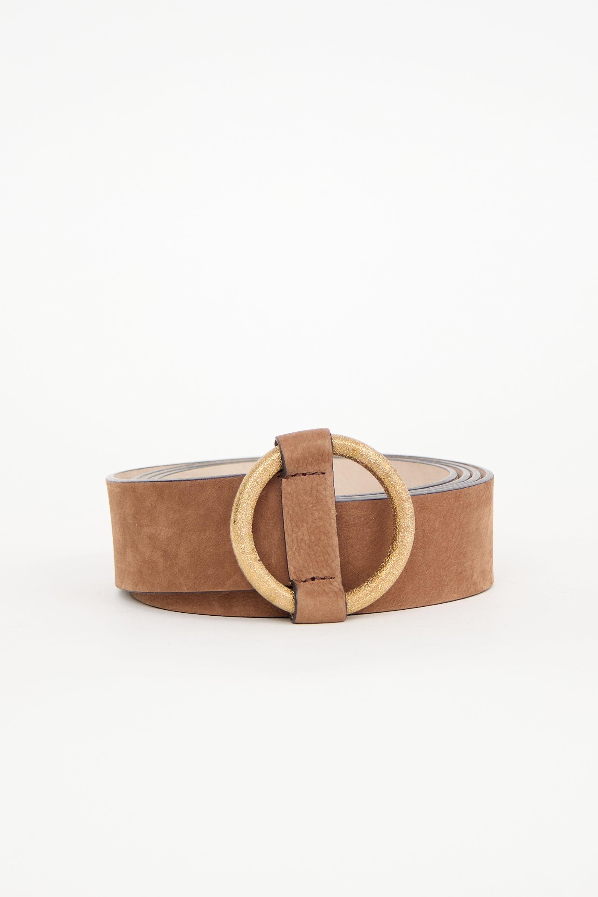 Pre-owned Brunello Cucinelli brown suede belt featuring gold tone stone blasted hardware with sparkle detail, circular buckle with pull through closure, and debossed logo at interior.