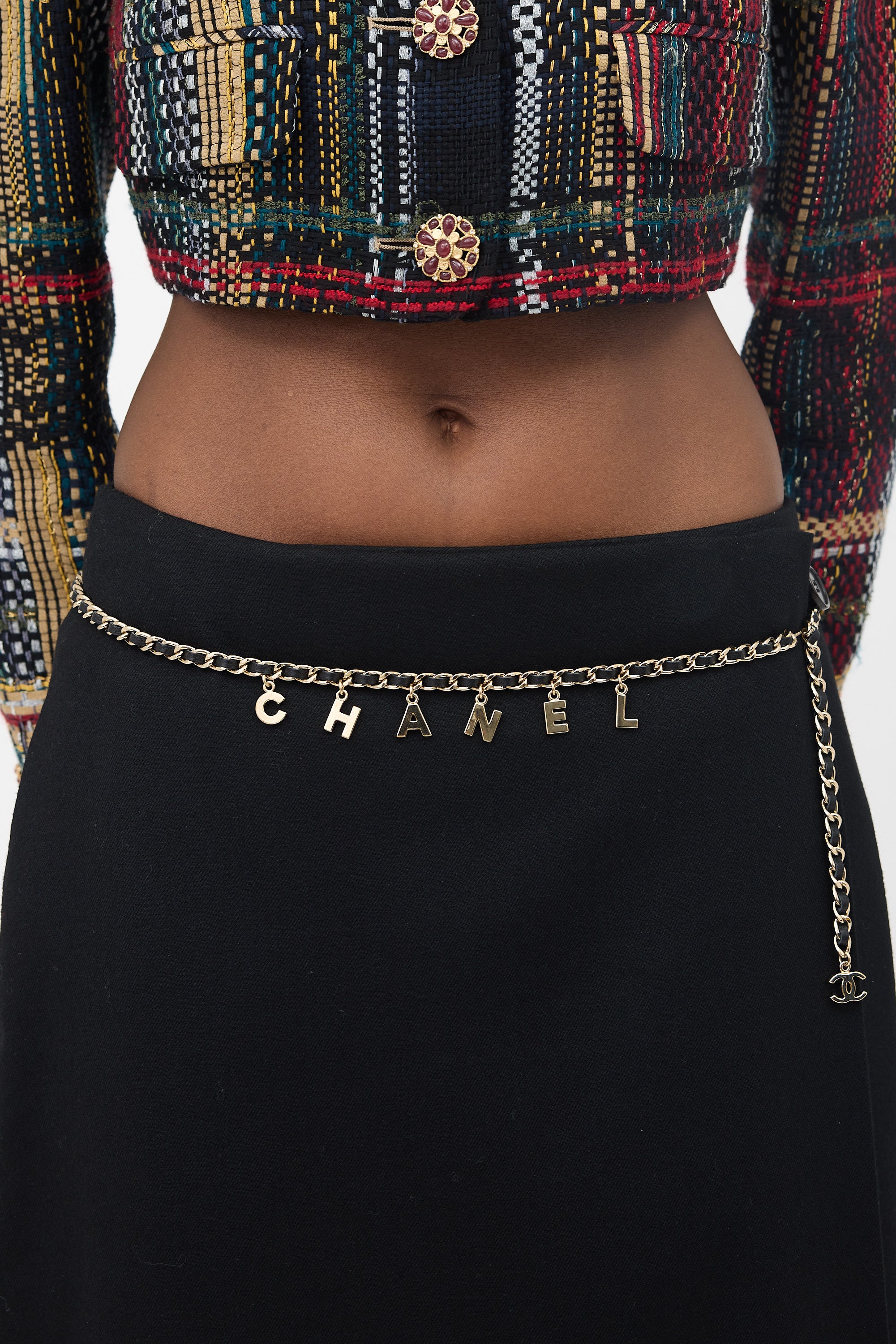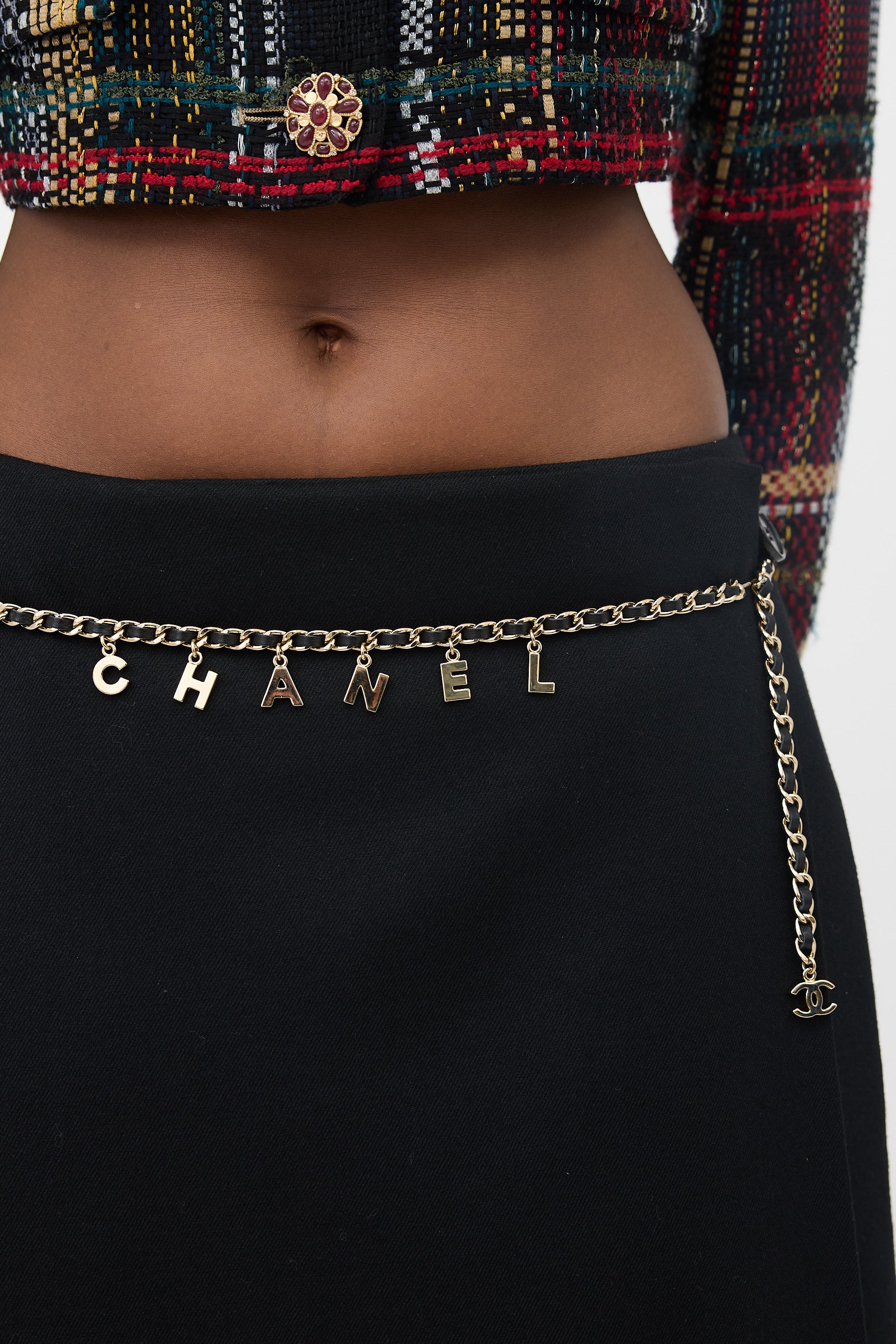 Pre-owned Chanel 2004 belt featuring a black leather and gold tone braided chain strap, C.H.A.N.E.L. logo letter charms, hook fastening, and CC logo charm at end. Comes with original dust bag.