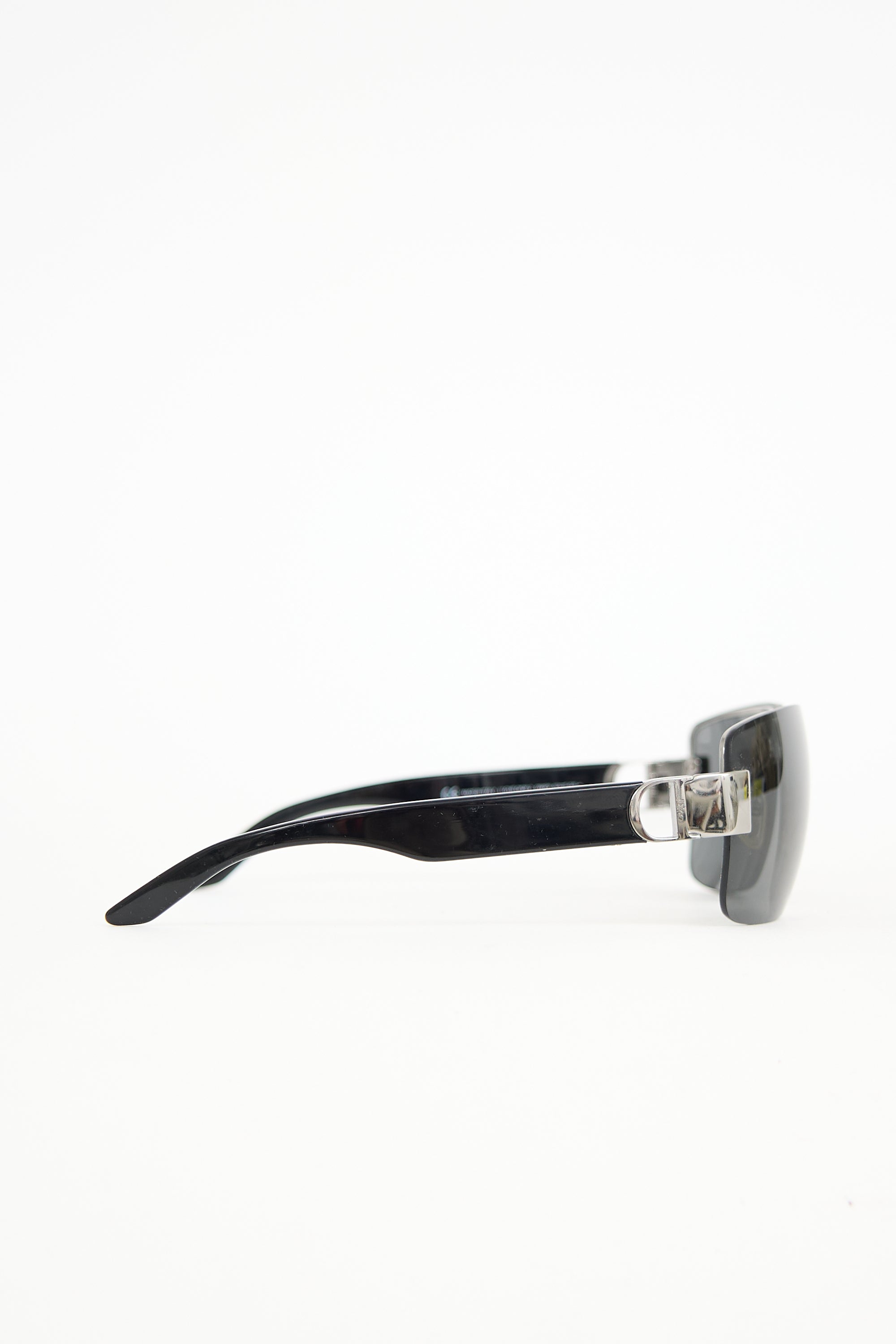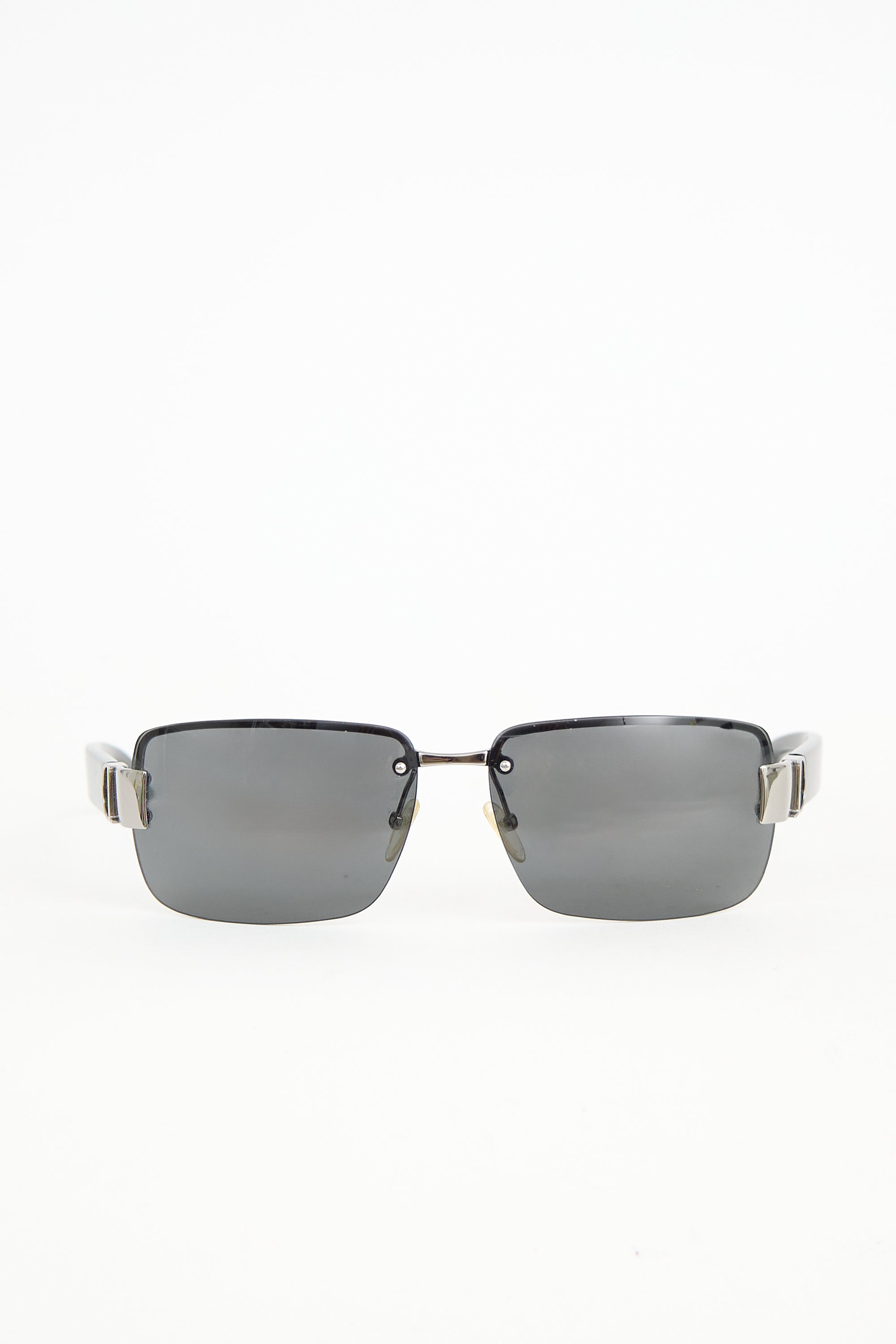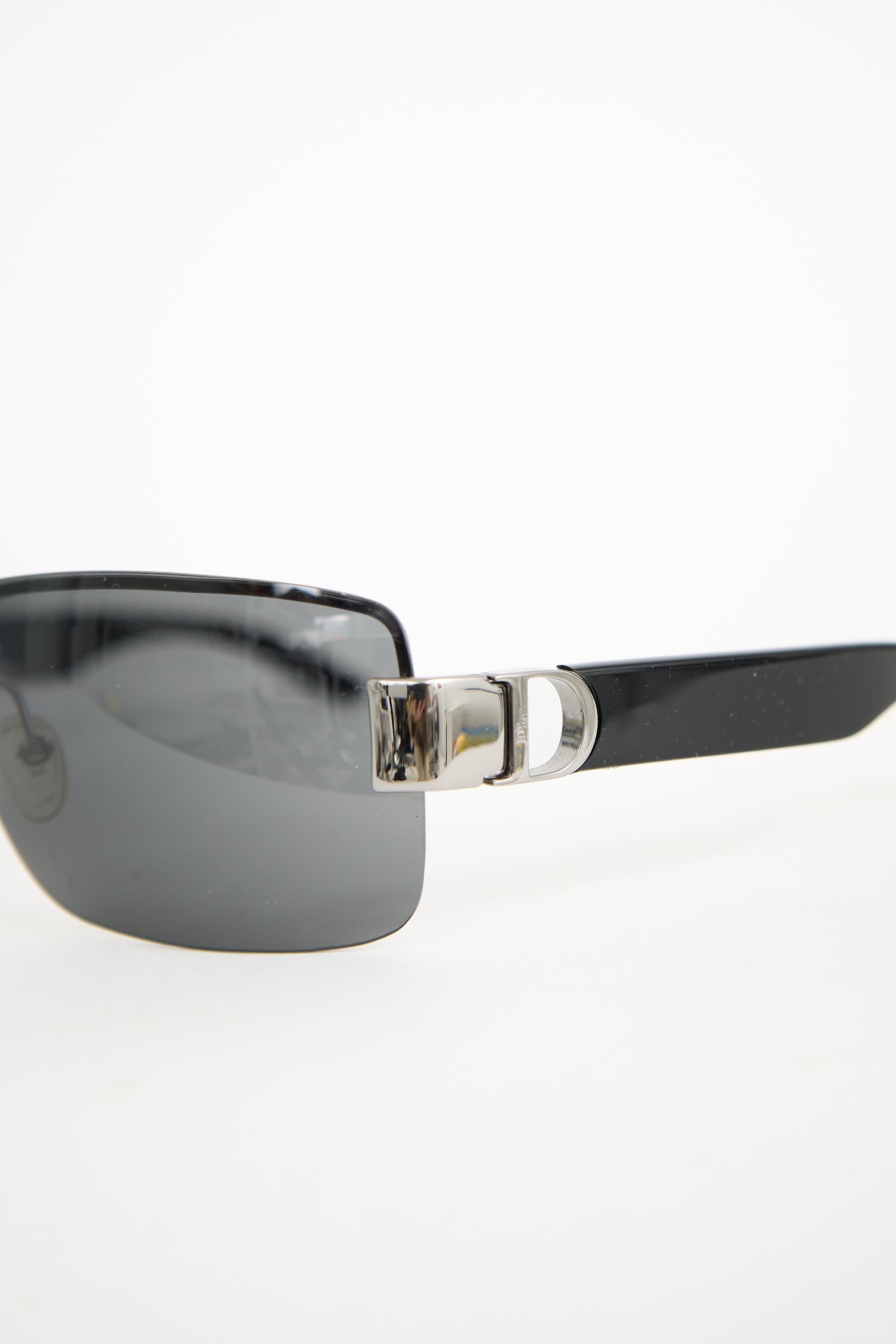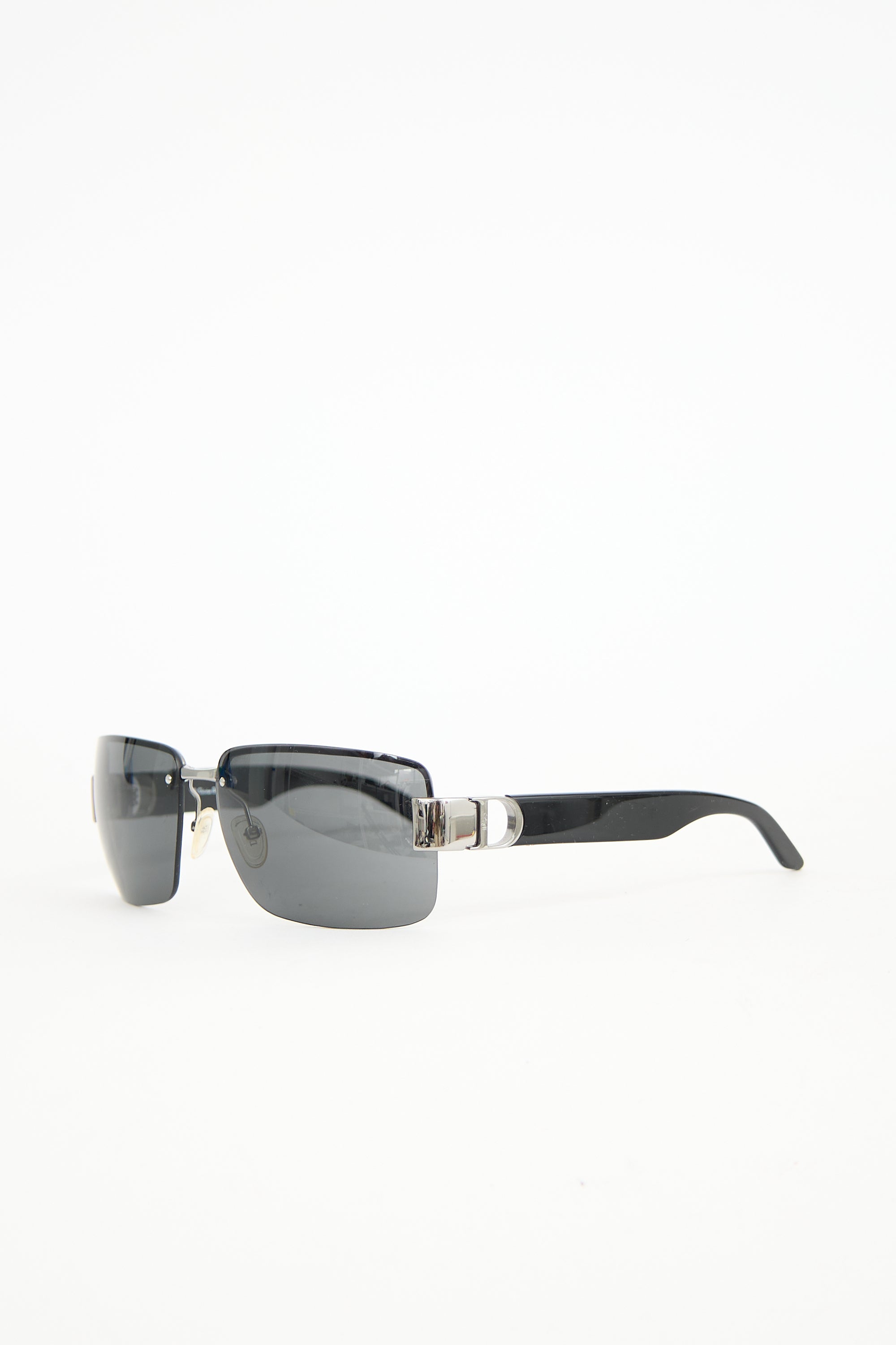 Pre-owned Dior I Love Dior 2 sunglasses featuring grey tinted rimless rectangle lenses, black acetate arms, and gunmetal accents with logo at temples. Comes with original case, pouch, wipe cloth, and care guide.