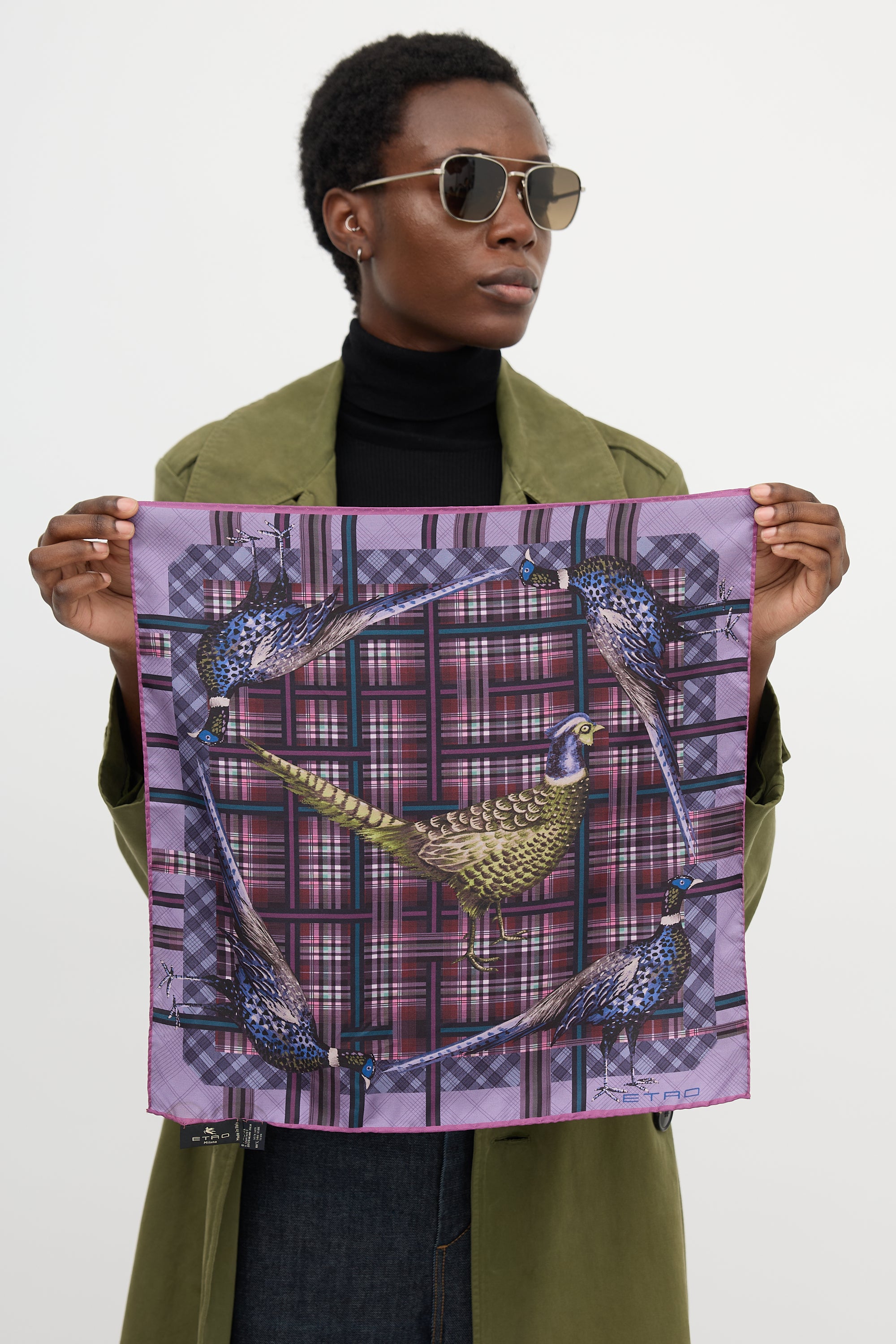 Pre-owned Etro silk square scarf featuring mixed multicolour bird and plaid prints, printed logo at bottom right corner, and hand rolled edges.