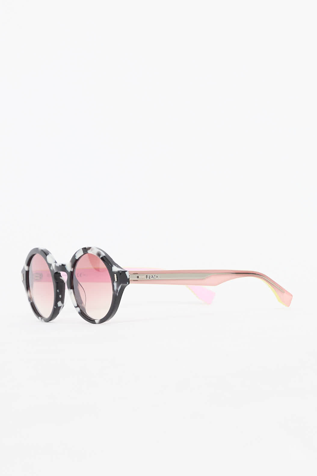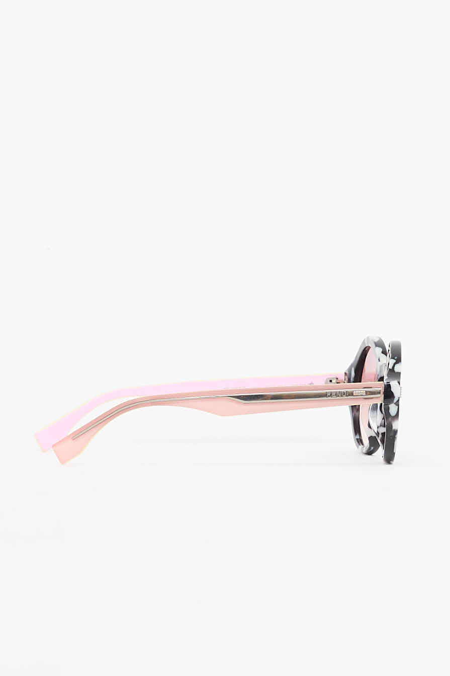 Pre-owned Fendi black, white, and pink FF0153/S sunglasses featuring round marbled frames, pink tinted lenses, and logo at temples.