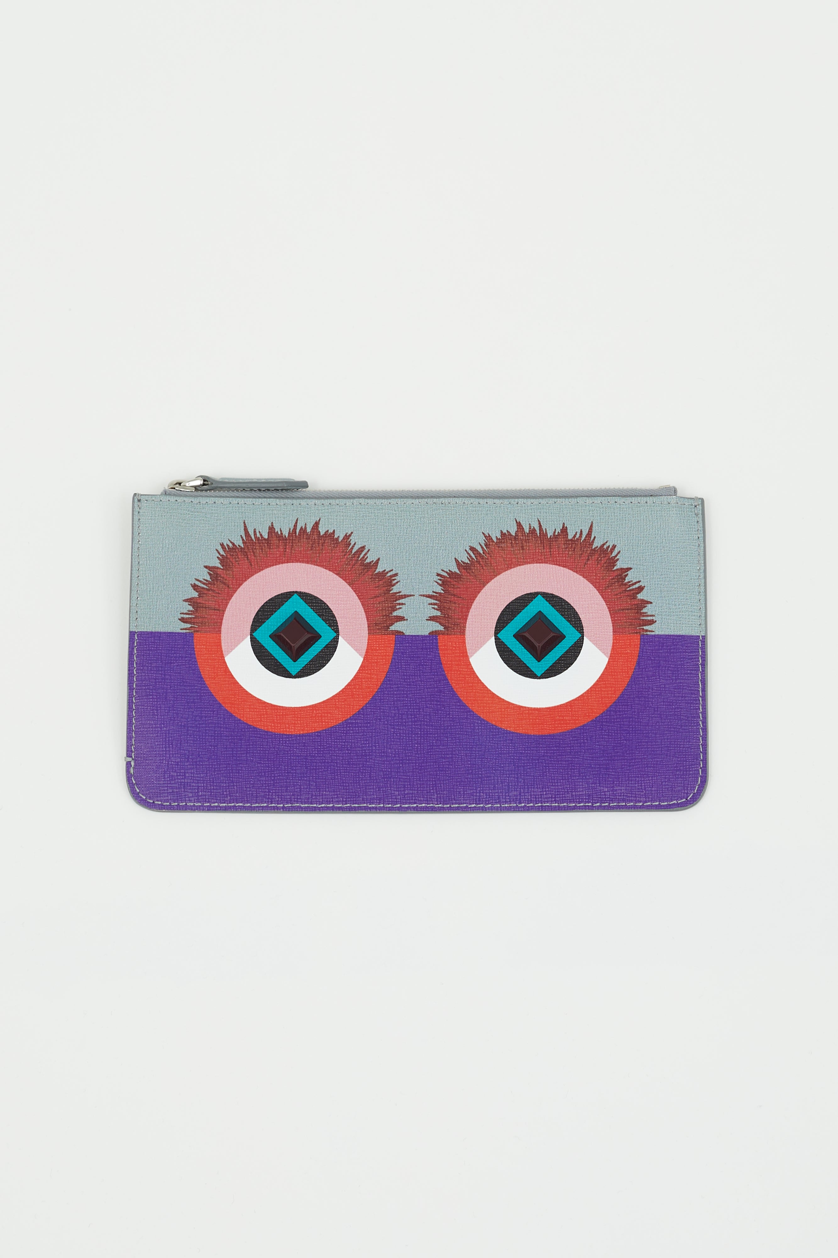 Pre-owned Fendi multicolour leather Monster Eye pouch featuring a rectangular shape, silver tone top zip closure, multicolour monster eyes at front with burgundy studs at centre, solid grey back and one main interior compartment.