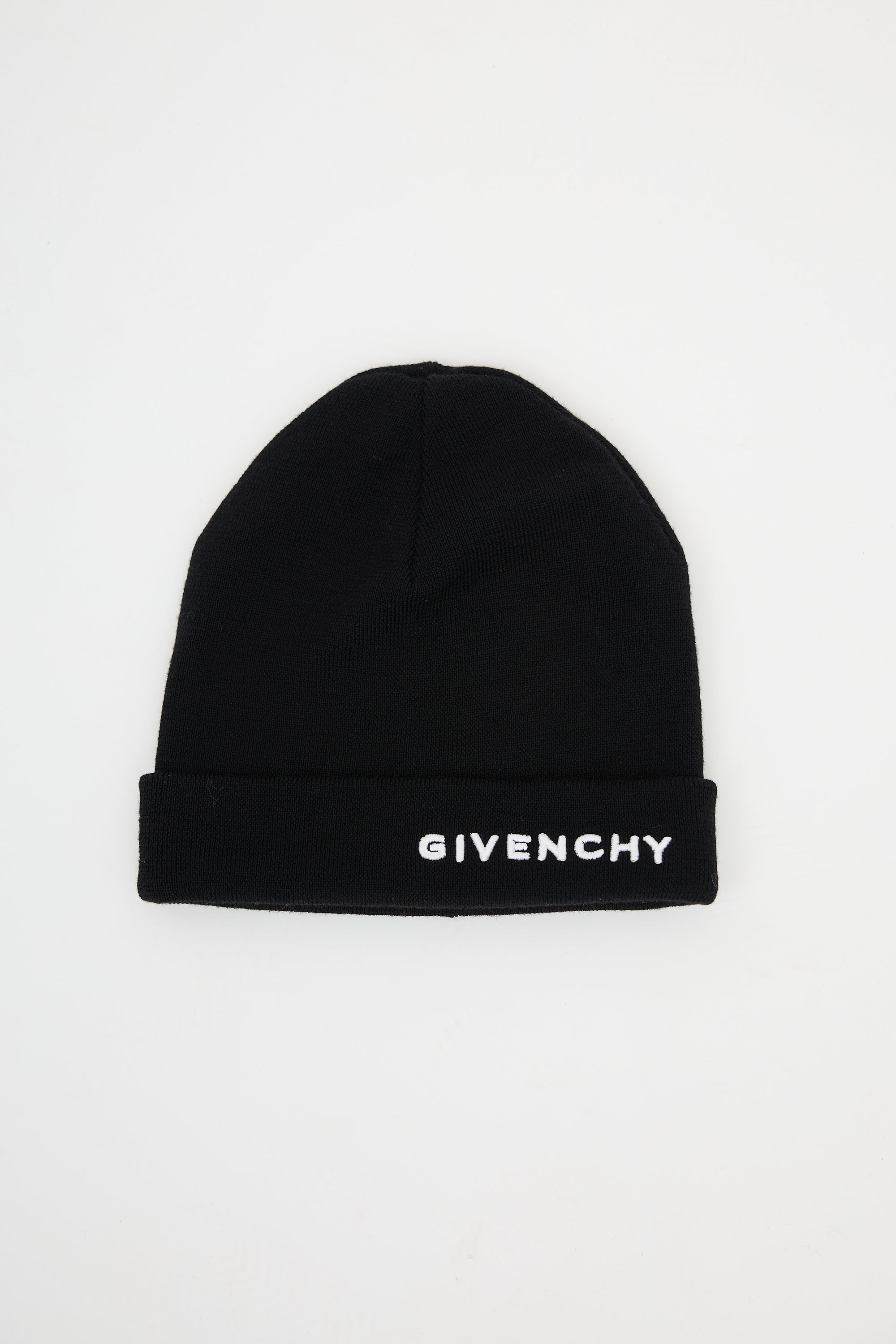 Pre-owned Givenchy black wool beanie featuring a ribbed knit body and white embroidered logo at front brim.