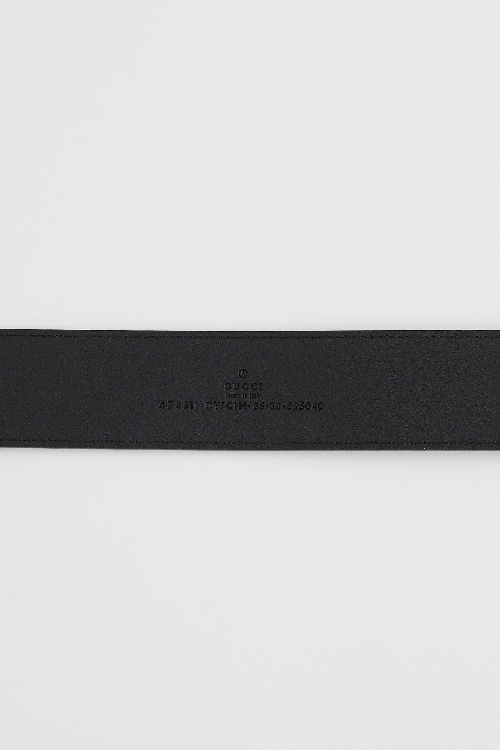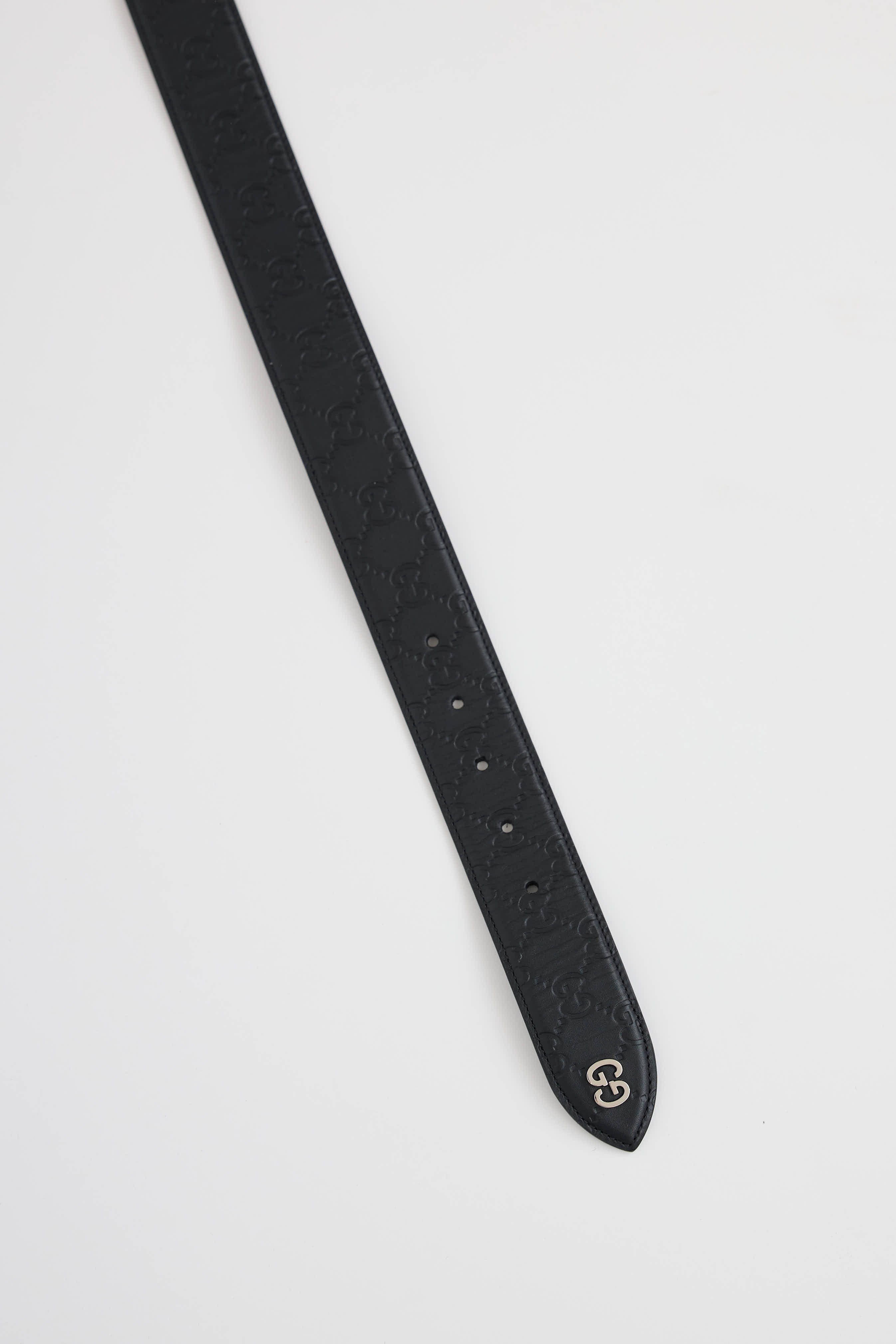 Pre-owned Gucci black leather belt featuring debossed GG Supreme, silver tone hardware, adjustable peg closure, and metal logo at end.