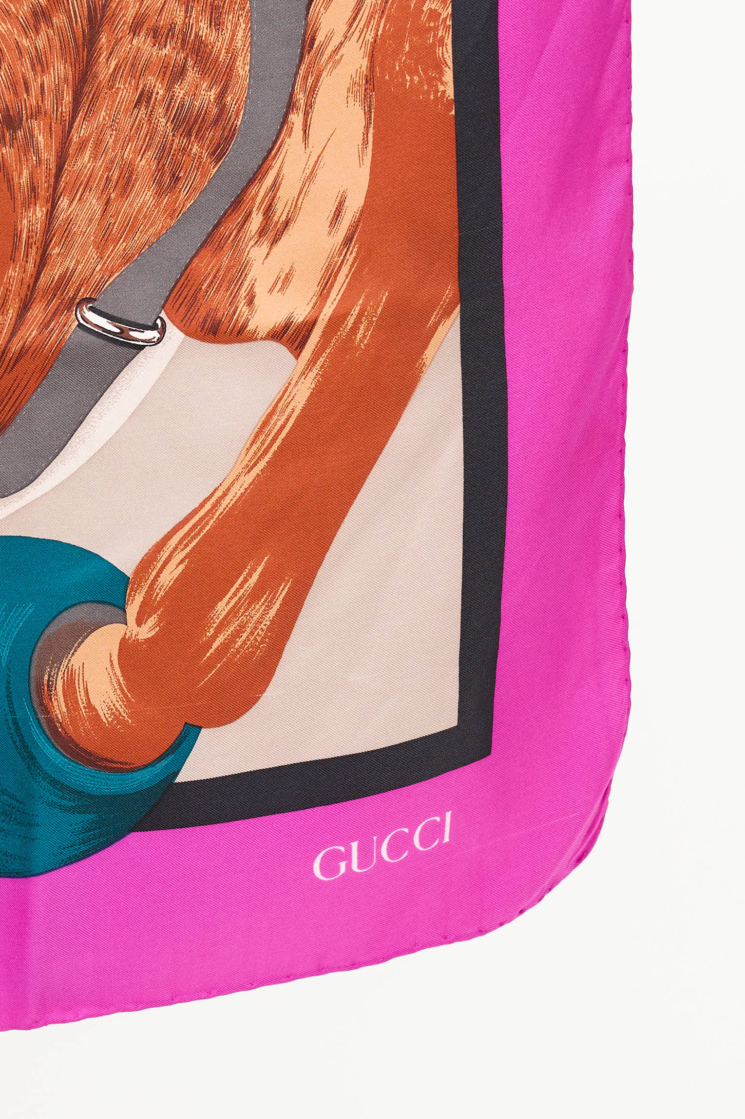 Pre-owned Gucci fuchsia and multicolour silk Equestrian scarf featuring a close up graphic of a person riding a horse, word logo at corner, fuchsia border and rolled edges.