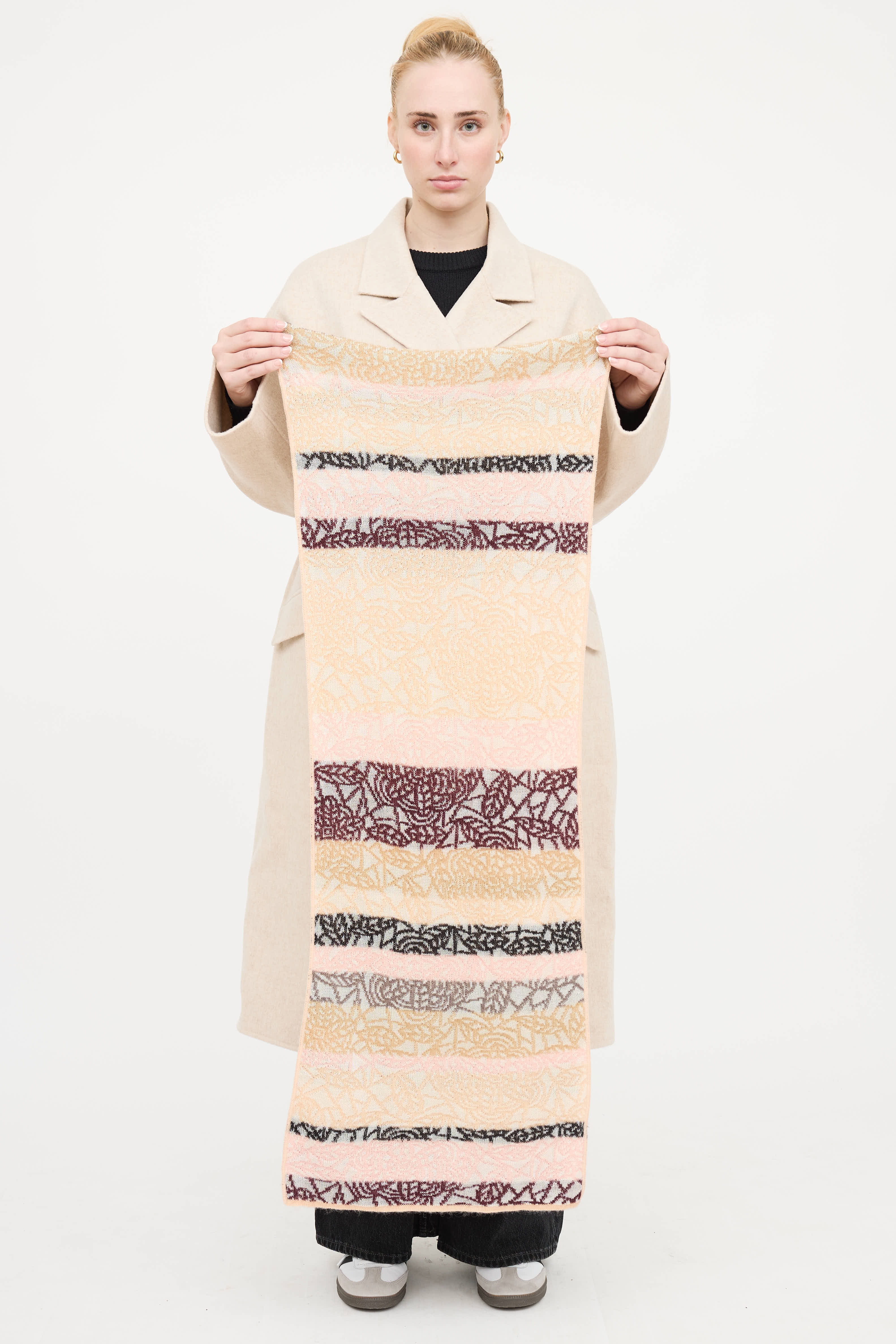 Pre-owned Missoni beige knit scarf featuring mohair and silk blend, abstract pattern knit throughout, multicolour stripes and stitched edge.