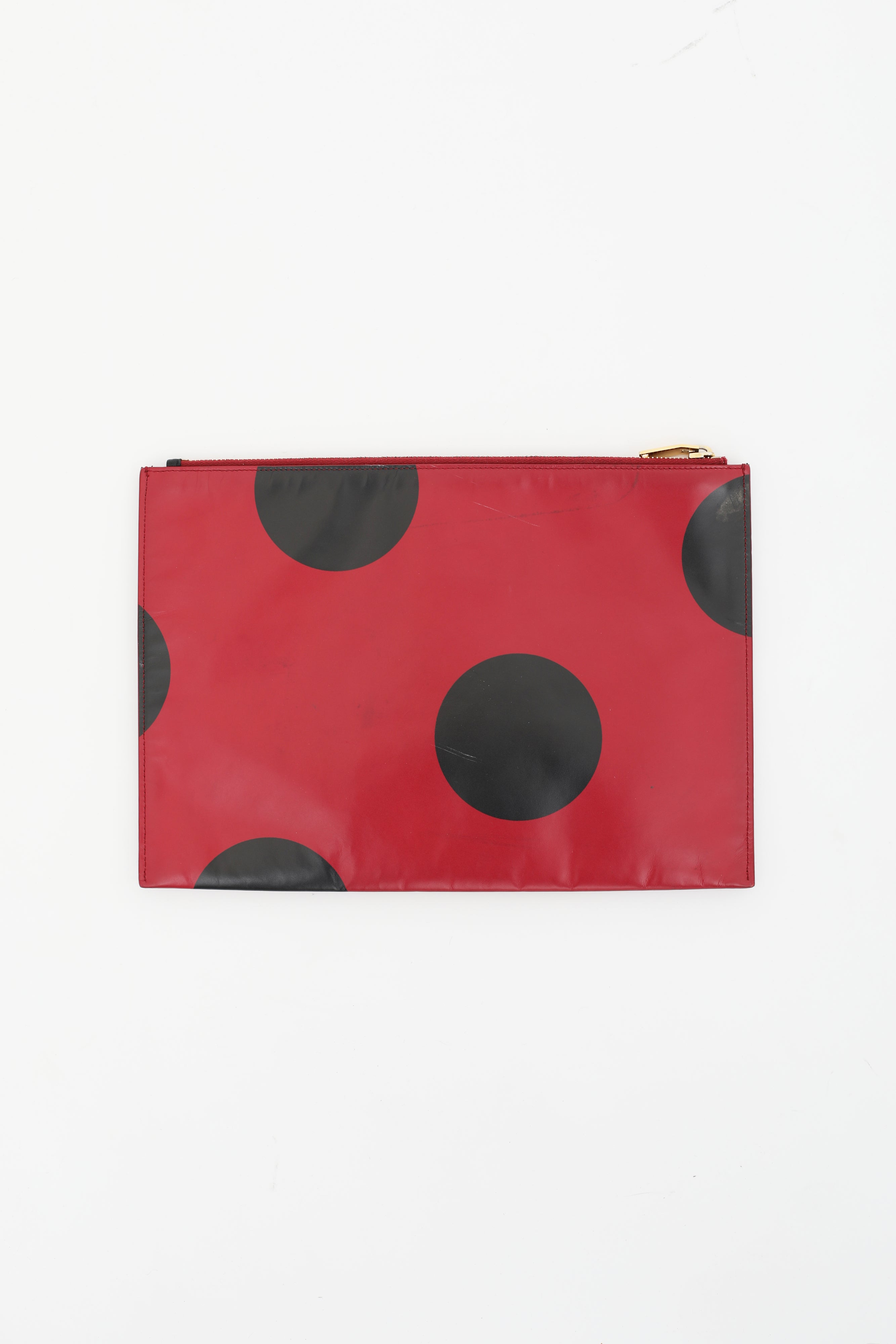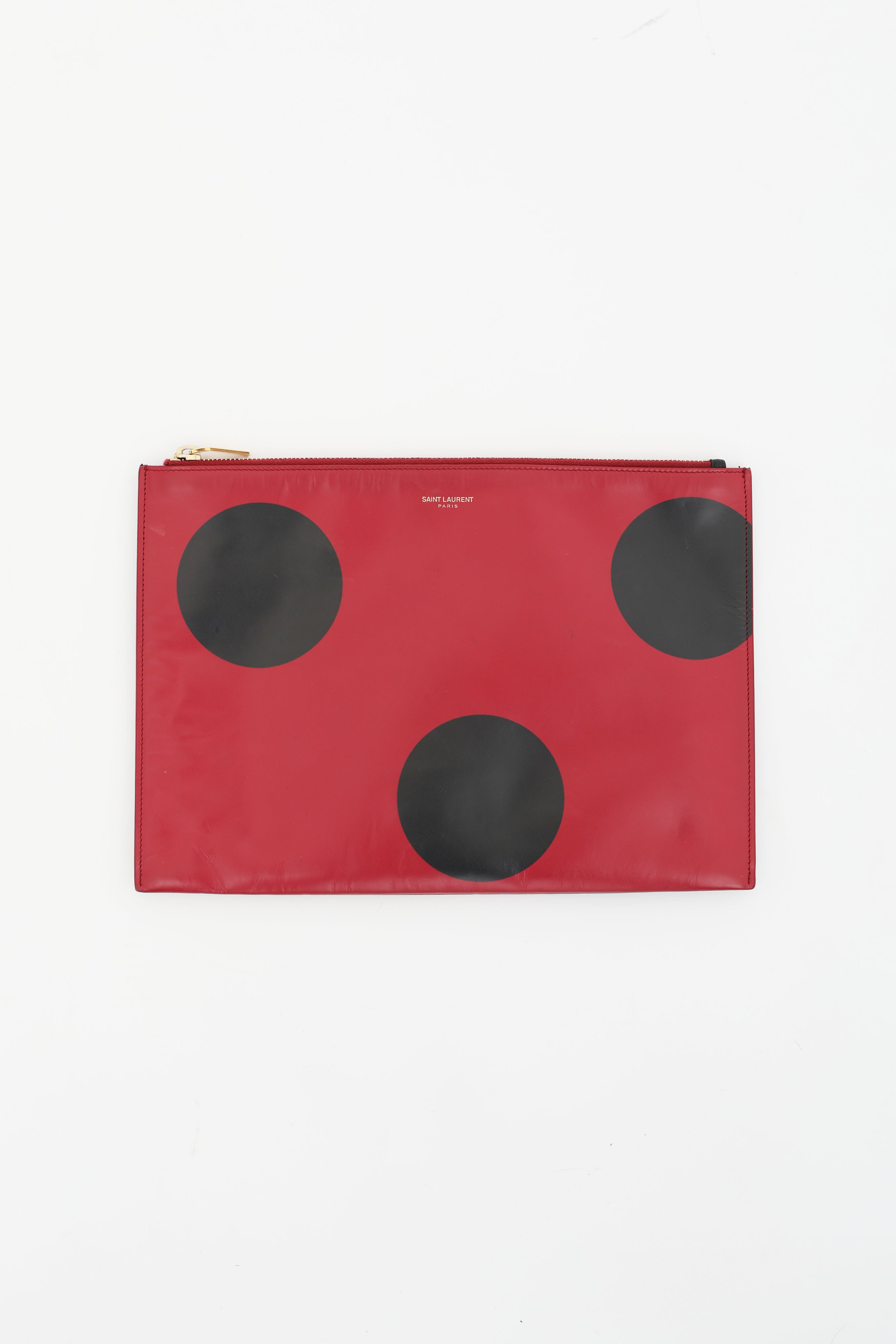 Pre-loved Saint Laurent red and black zipped pouch, featuring large dot print, gold-tone zip at top, flat silhouette, lined in black textile with brand patches at interior.