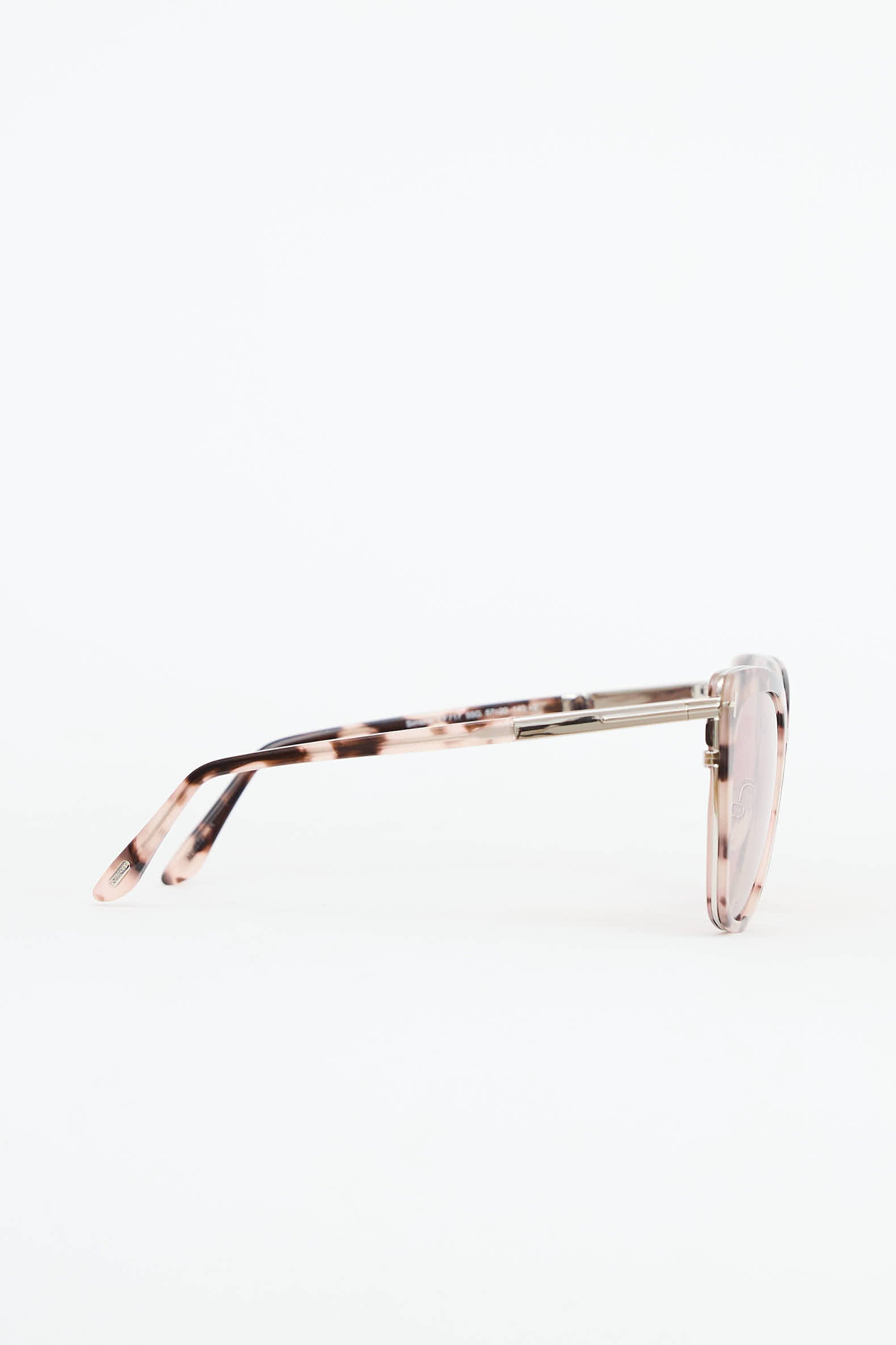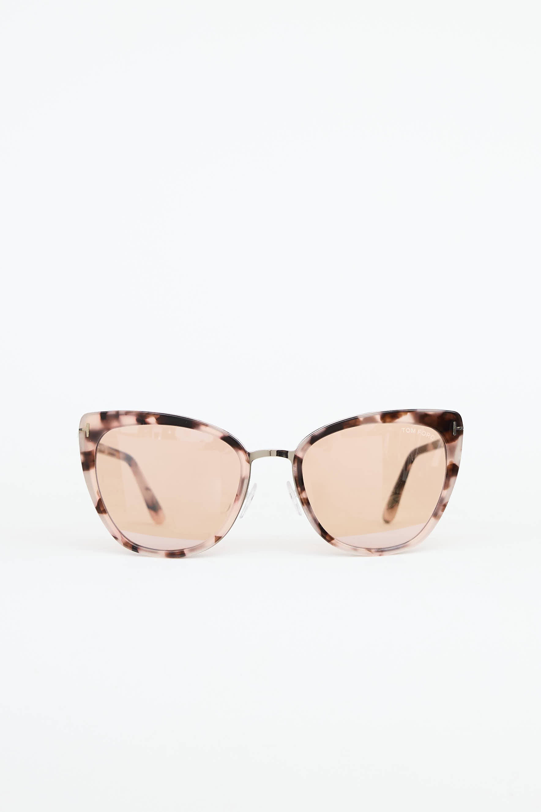 Pre-owned Tom Ford Simona sunglasses featuring pink and brown tortoise cat eye frames, brown tinted lenses, nose pads, silver tone metal nose bridge, and T accent at temples.