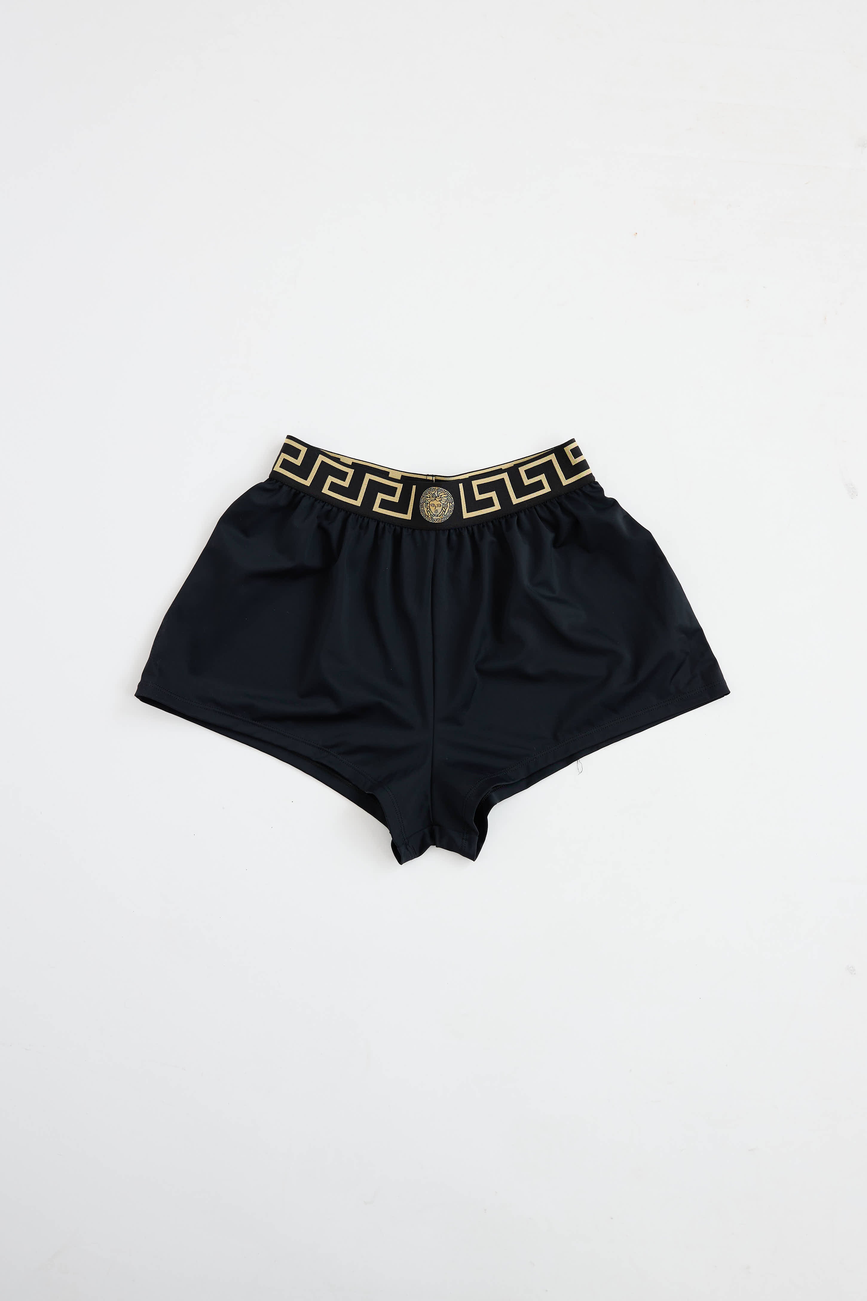 Pre-owned Versace black shorts featuring an elastic waist with gold La Greca woven detailing, Medusa head at front, and wide leg.