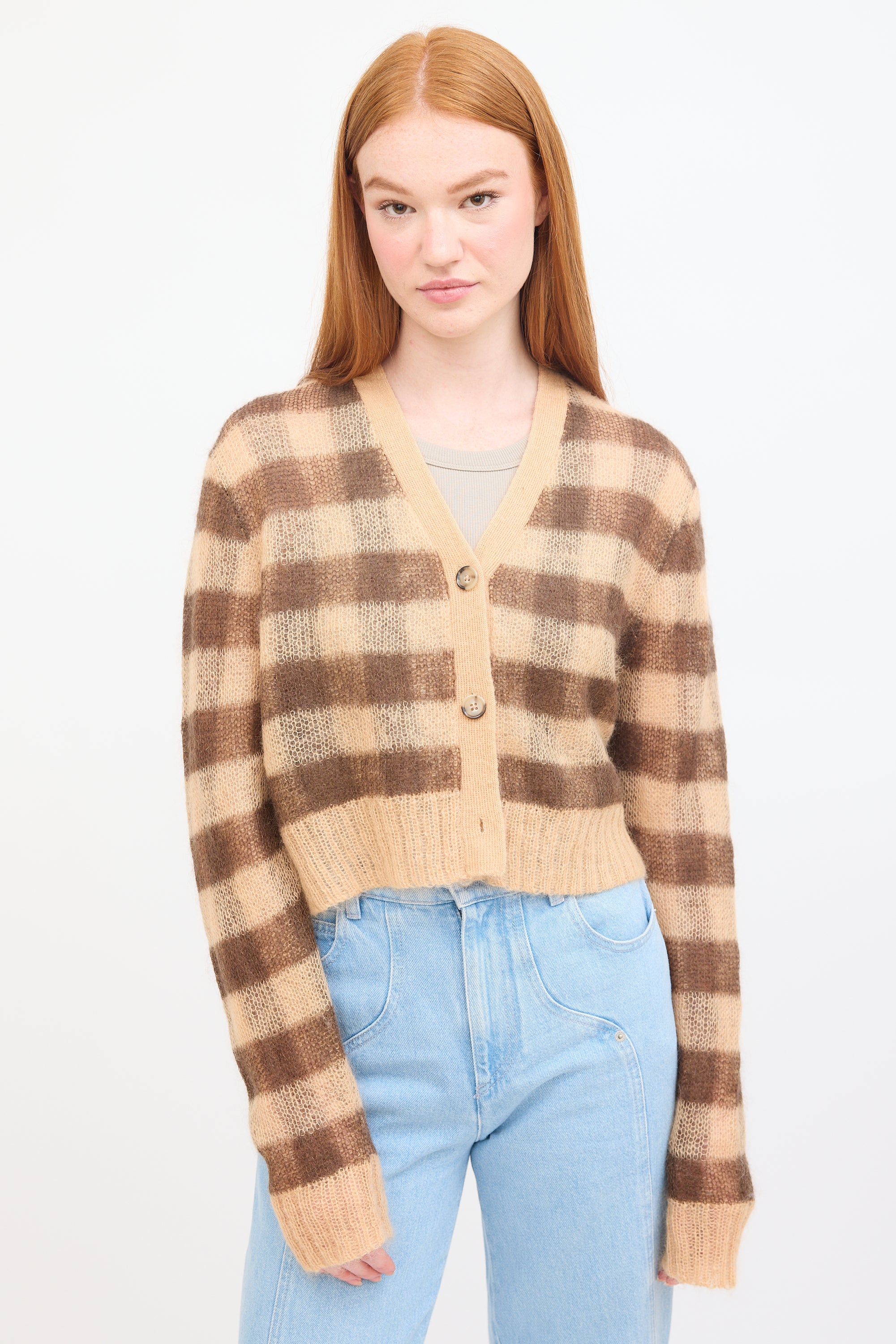 Pre-owned Acne Studios beige and brown mohair blend cropped cardigan featuring V-neckline, button up front closure, long sleeves, ribbed hem and cuffs, and striped pattern throughout.