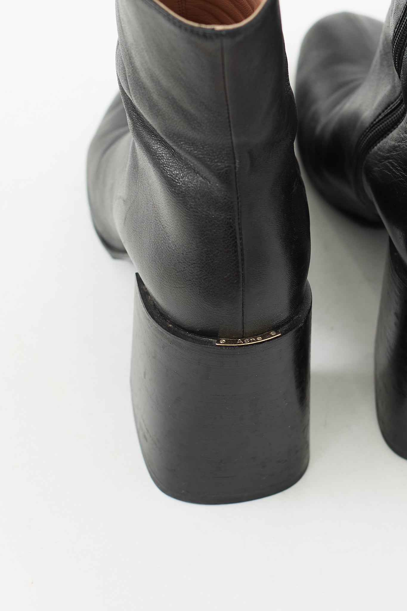 Pre-owned Acne Studios black leather ankle boots featuring rounded toe, front seam, inner zip closure, stacked block heel with gold tone logo hardware, and pull on entry.