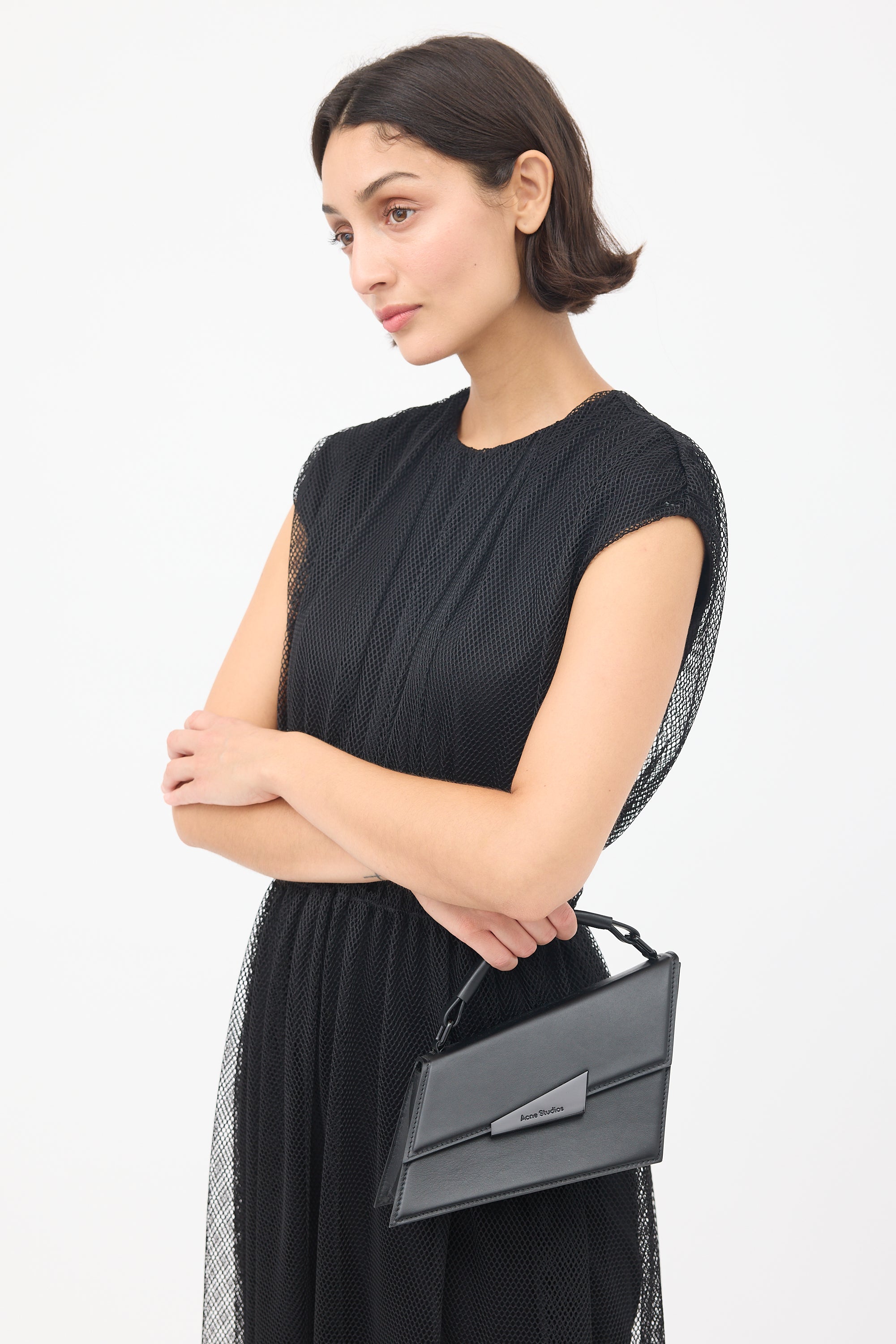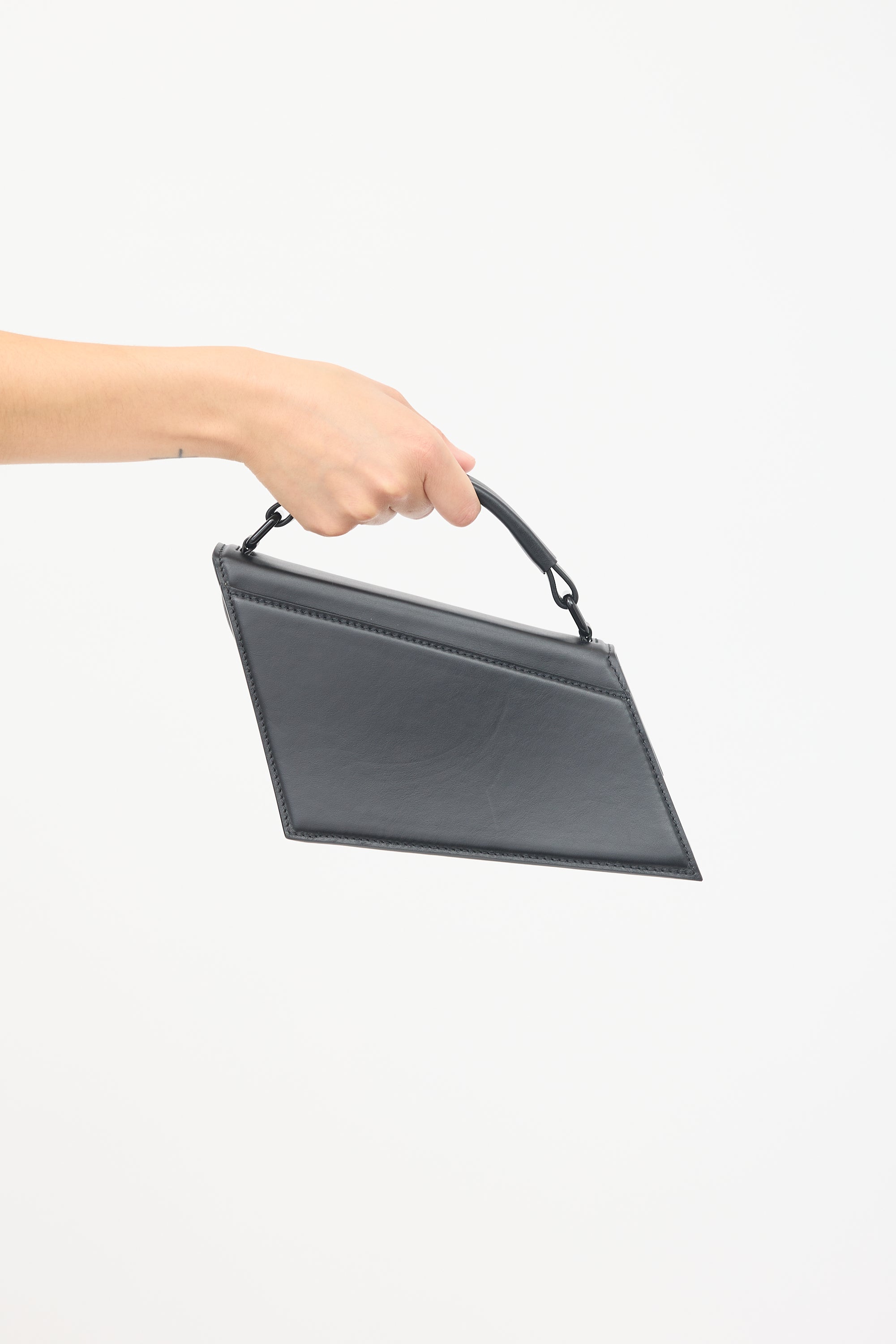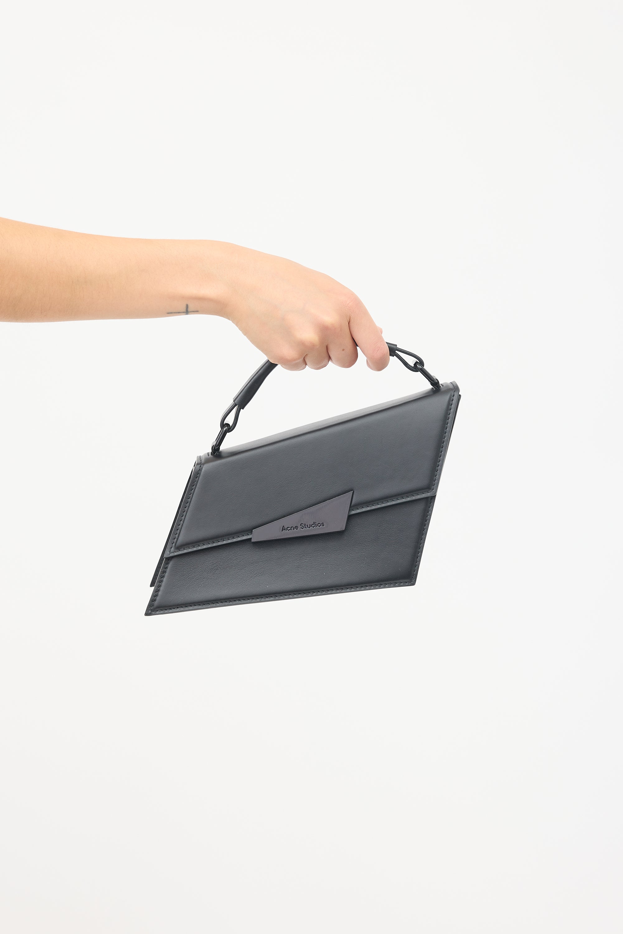 Pre-owned Acne Studios black leather medium Distortion shoulder bag featuring an angular design, tonal top stitching, black hardware, slip pocket at back face, single flat top handle, detachable and adjustable shoulder strap, front flap with etched logo hardware accent, magnetic closure, and one main compartment with single slip pocket. Comes with original dust bag.