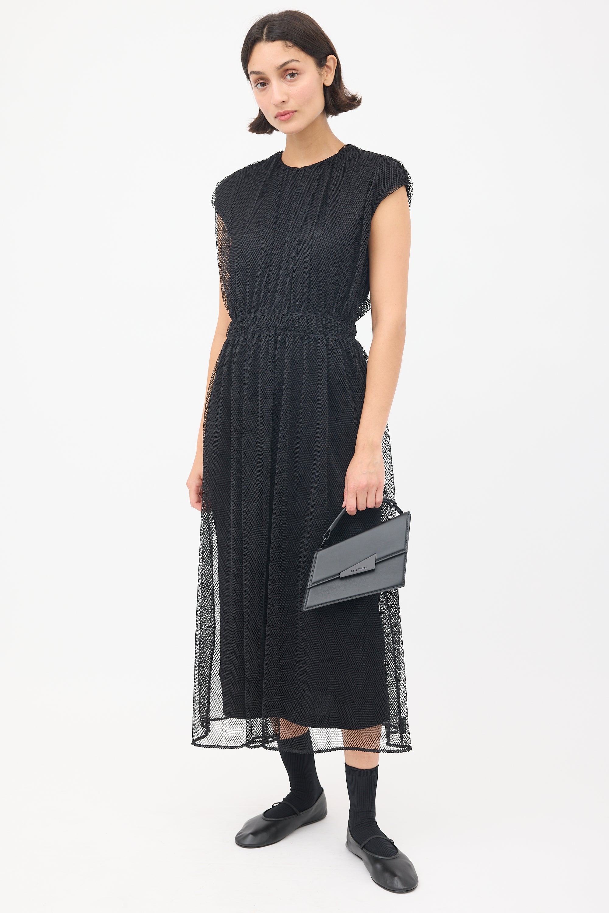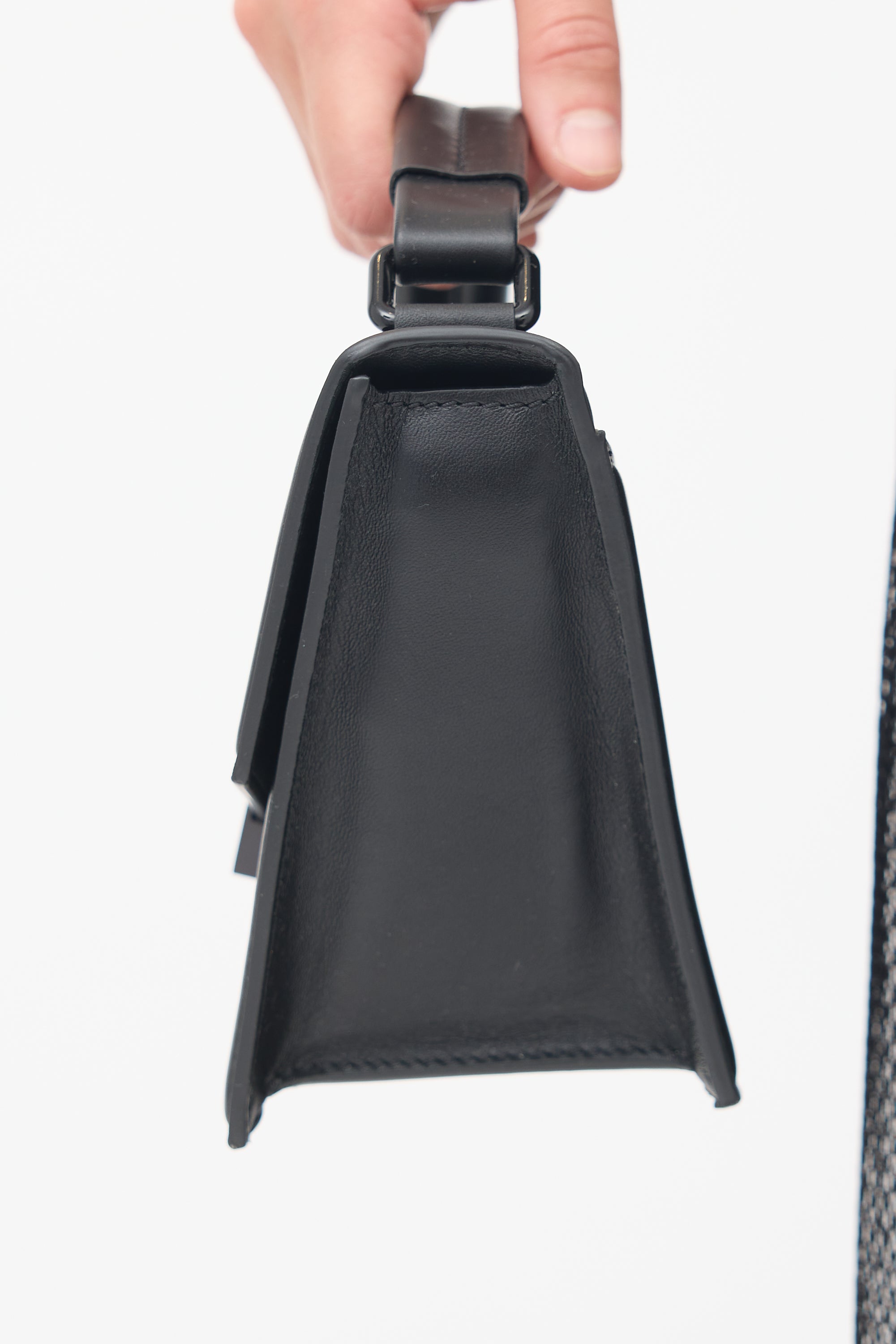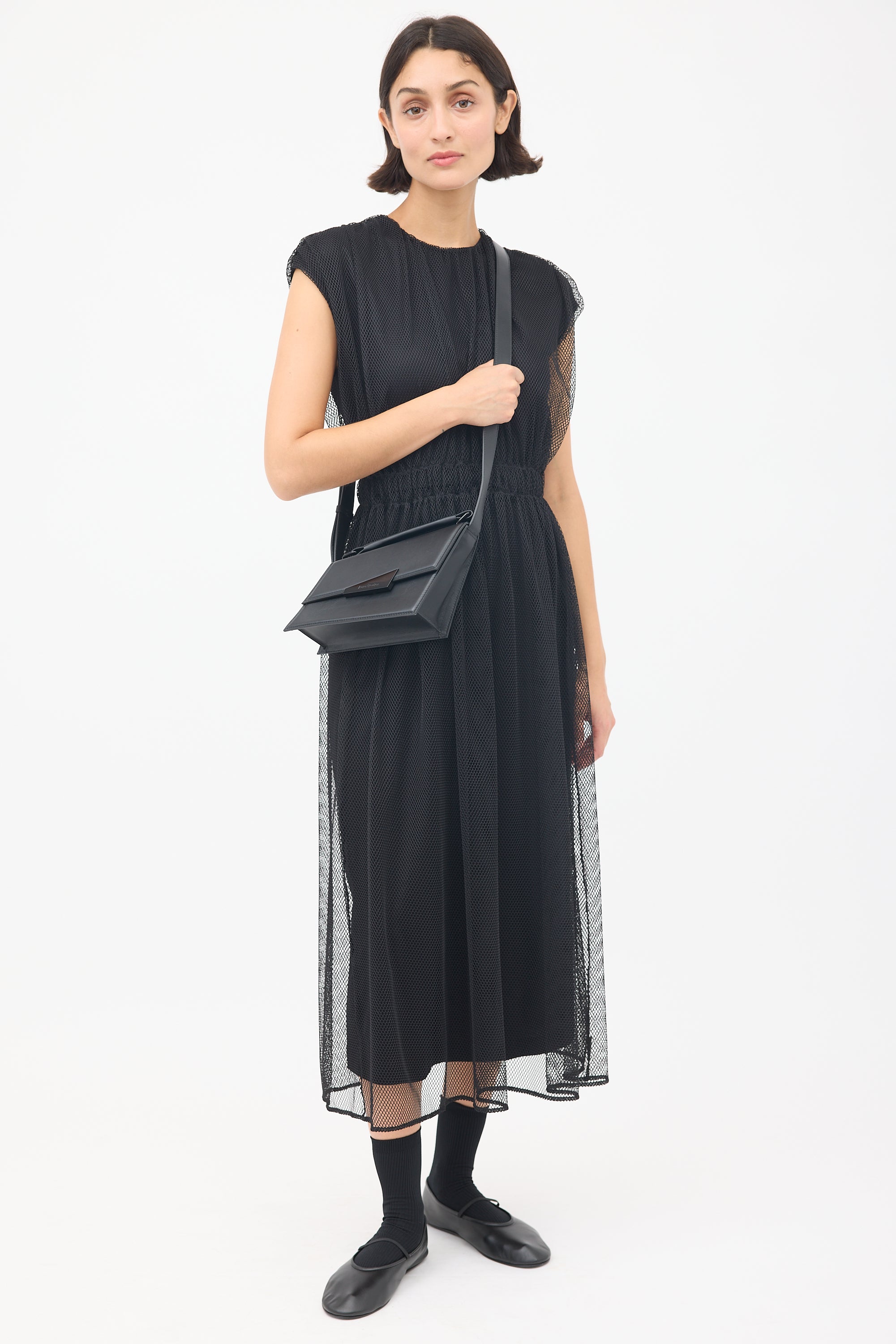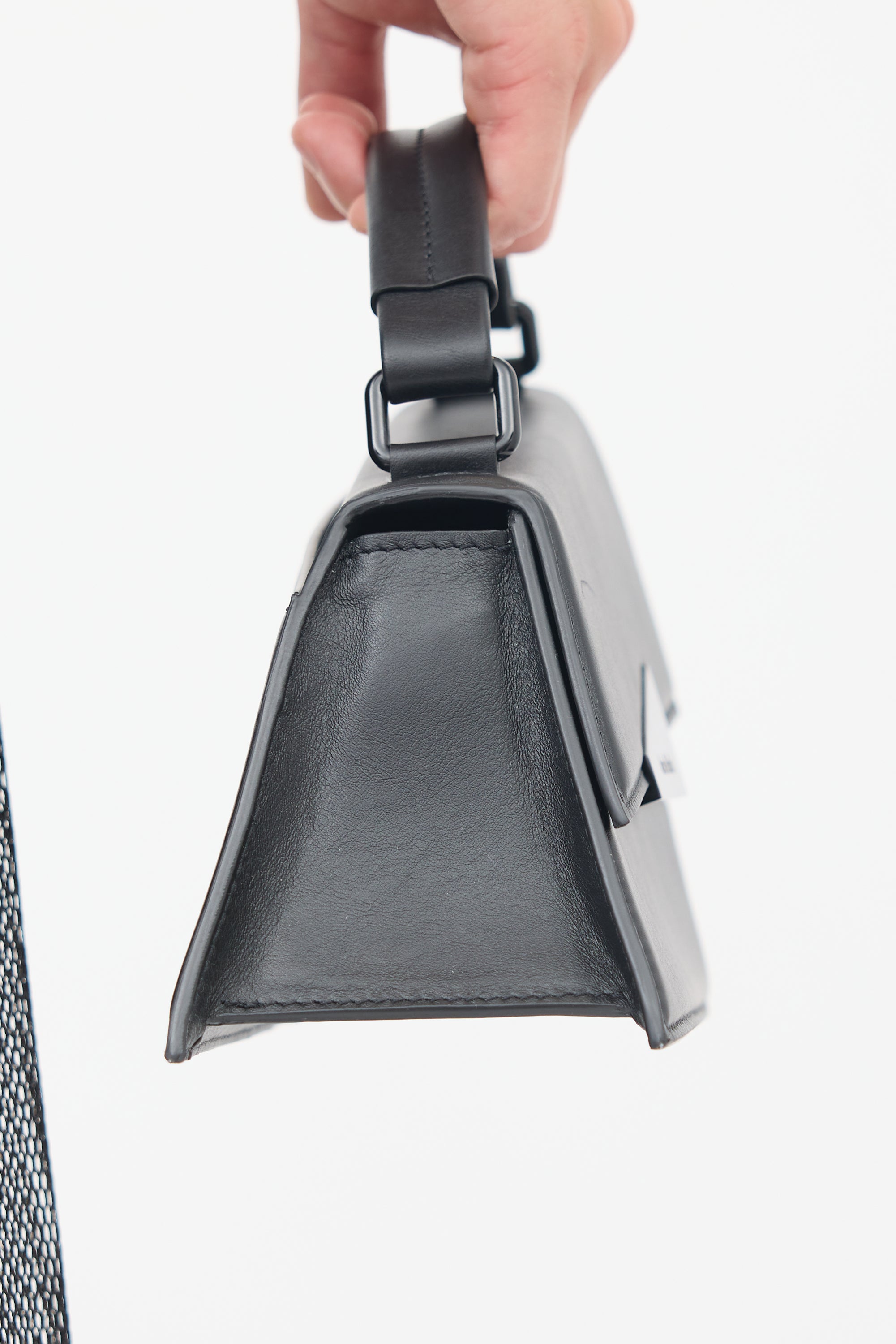 Pre-owned Acne Studios black leather medium Distortion shoulder bag featuring an angular design, tonal top stitching, black hardware, slip pocket at back face, single flat top handle, detachable and adjustable shoulder strap, front flap with etched logo hardware accent, magnetic closure, and one main compartment with single slip pocket. Comes with original dust bag.