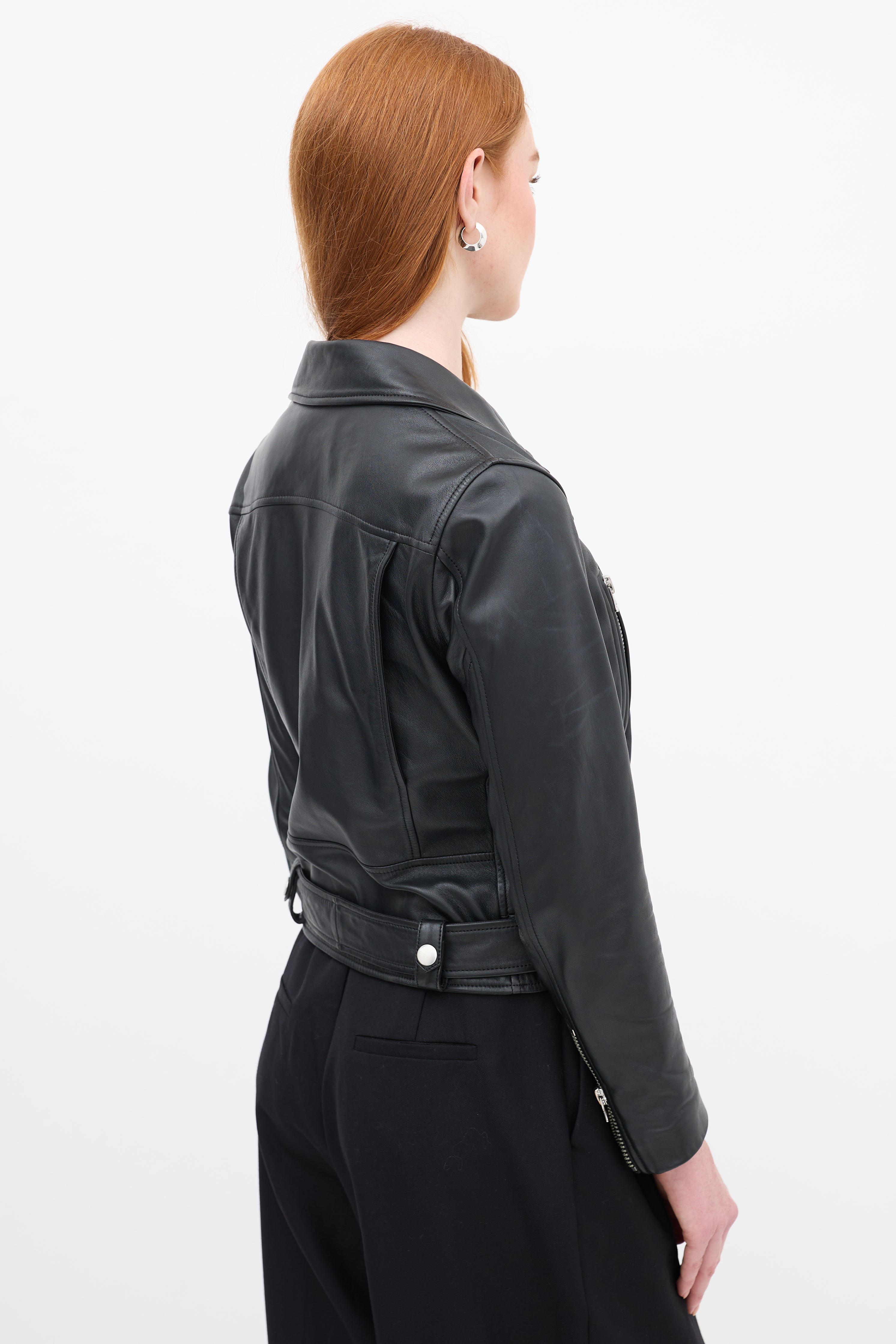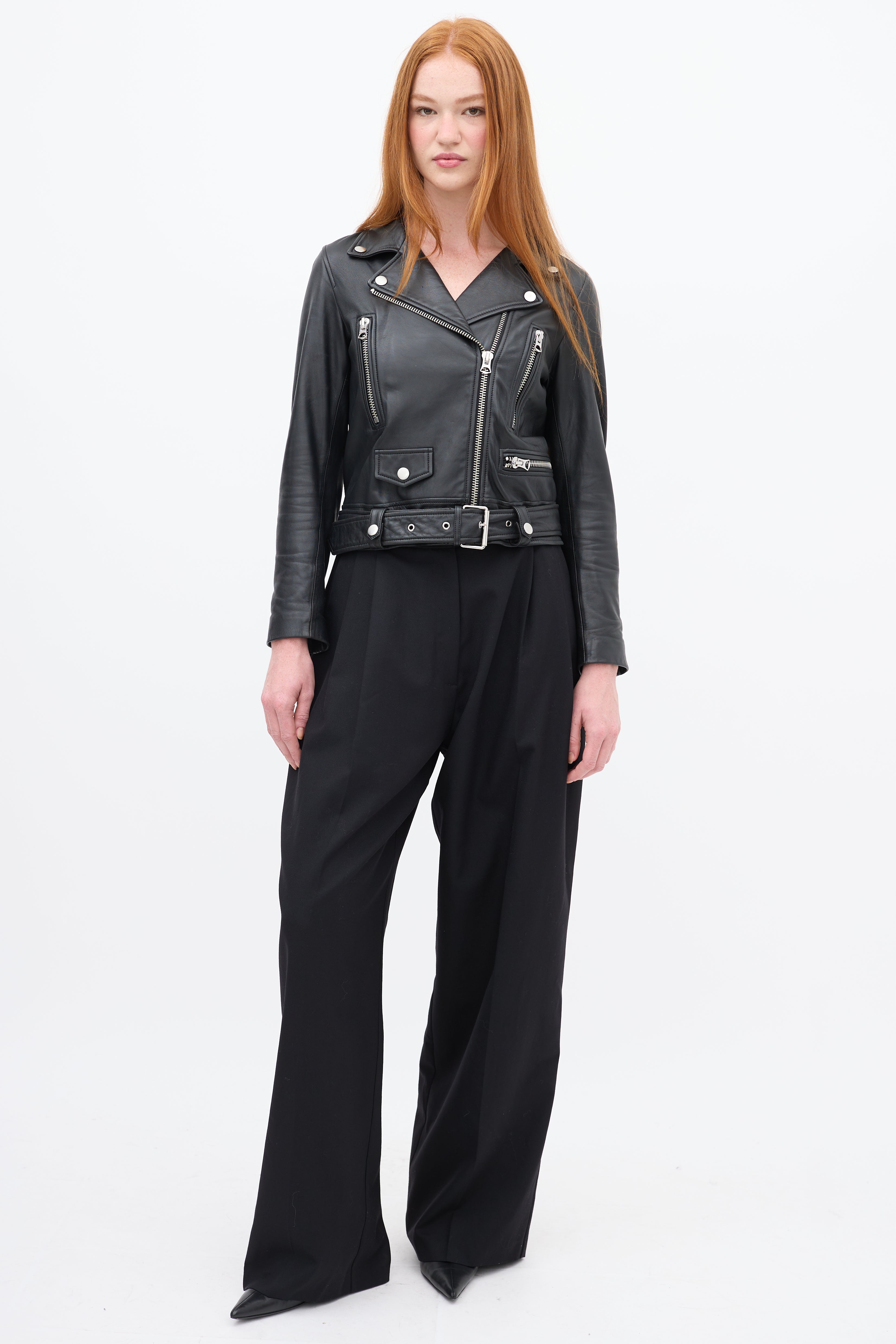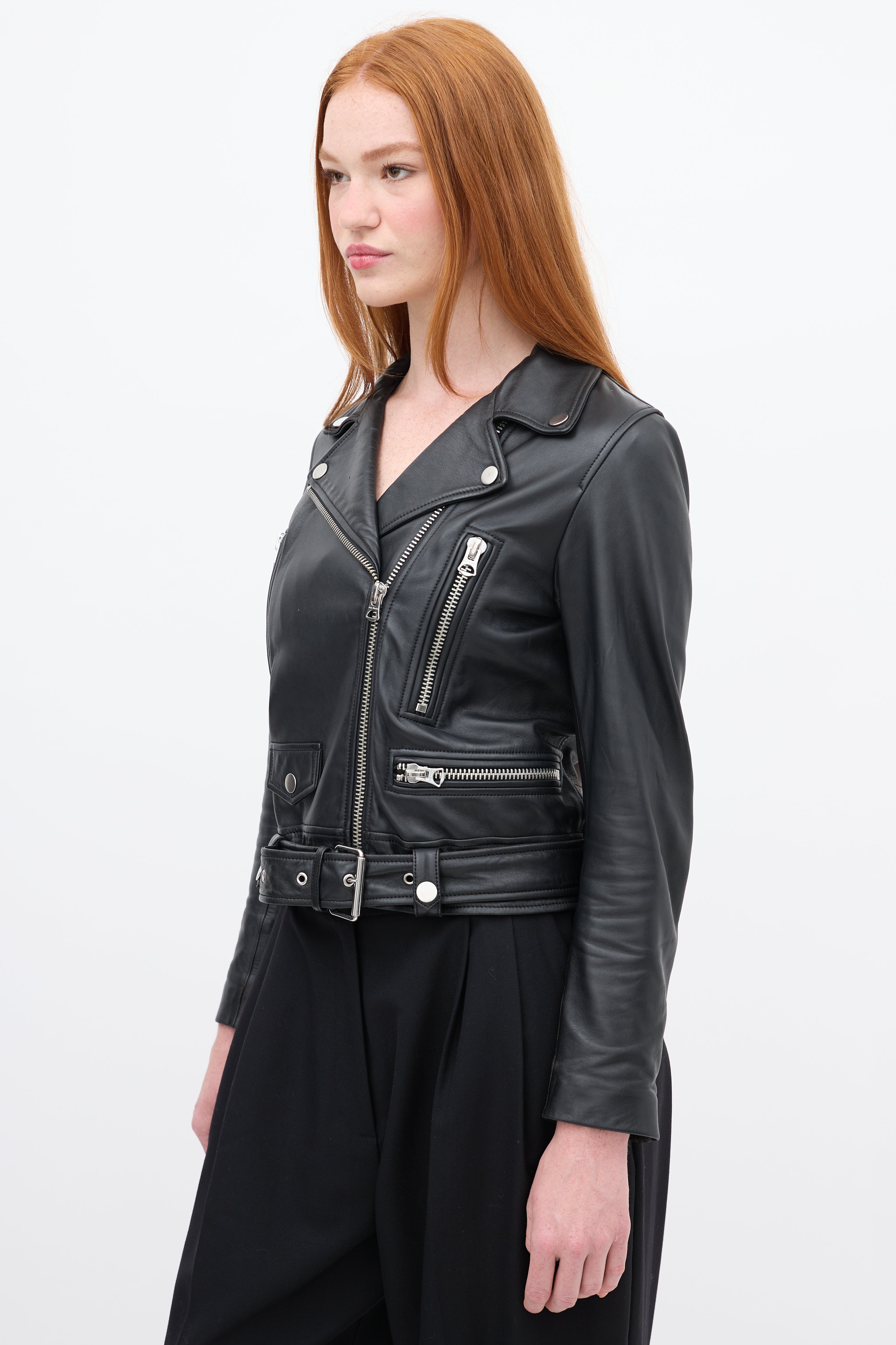 Pre-owned Acne Studios black leather moto jacket featuring a wide notched collar with snap button fastenings, asymmetric front zip, three front zip pockets, decorative buttoned flap at right waist, belted waist, and long sleeves with zipped cuffs. Lined.