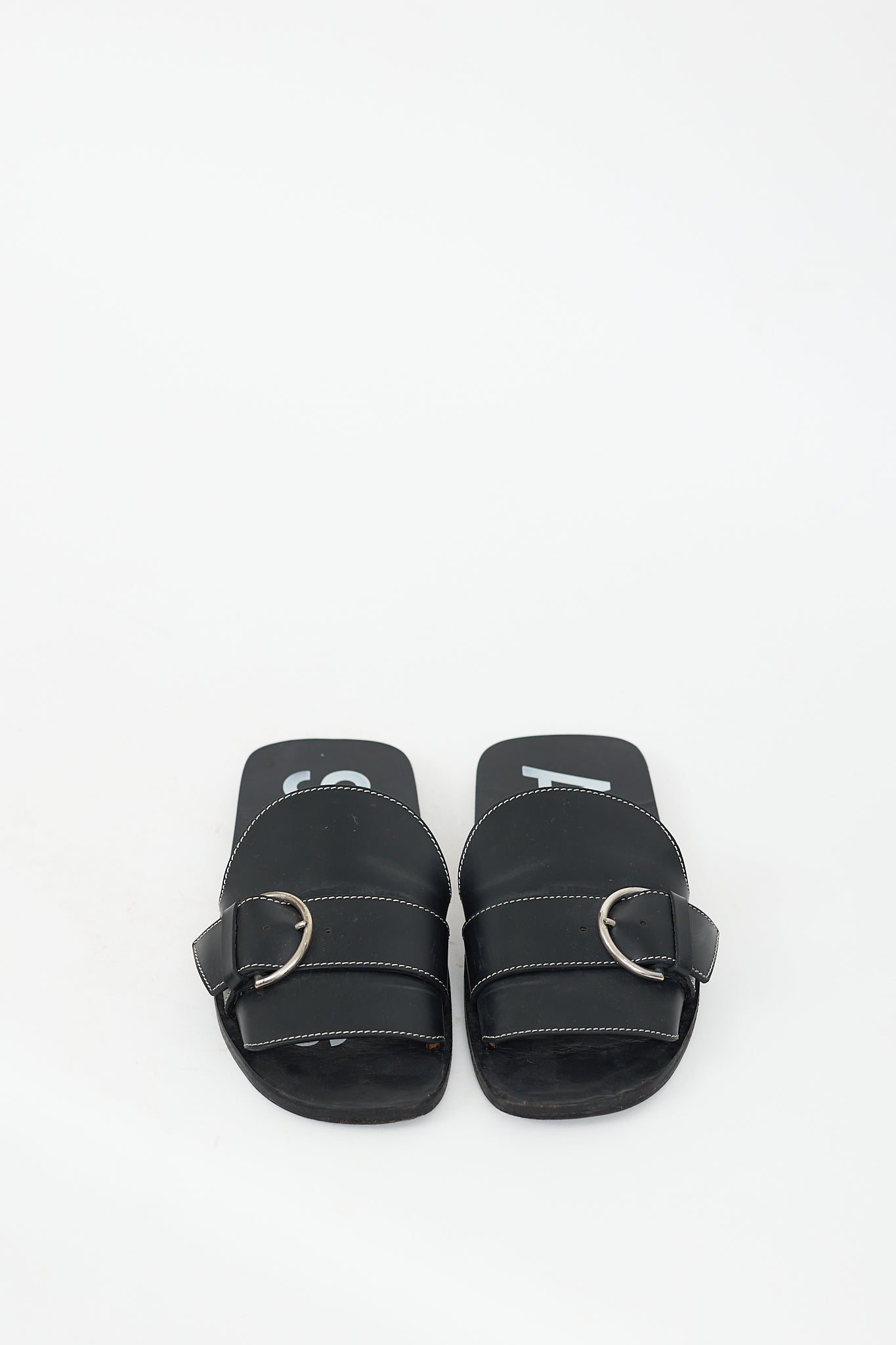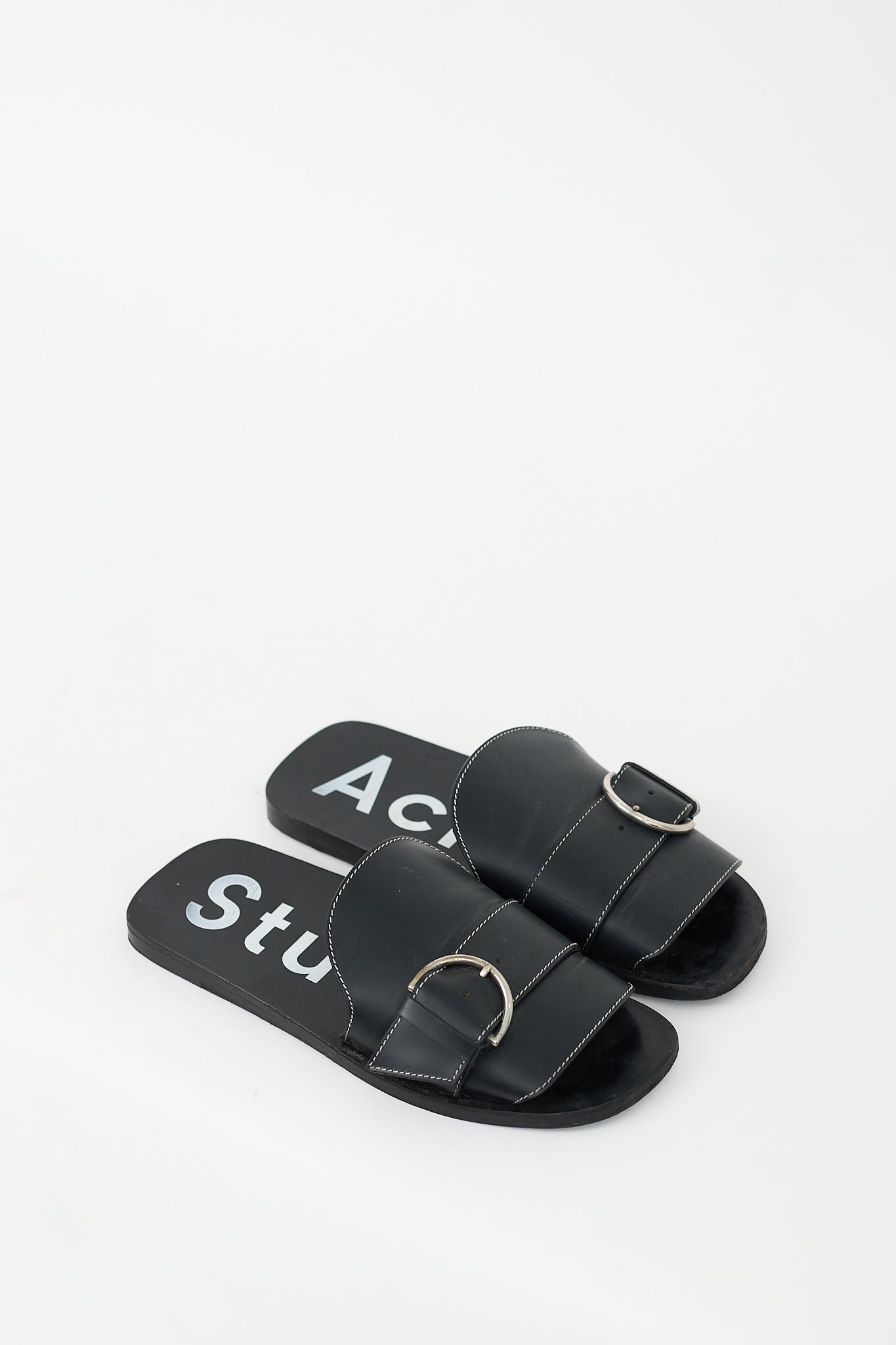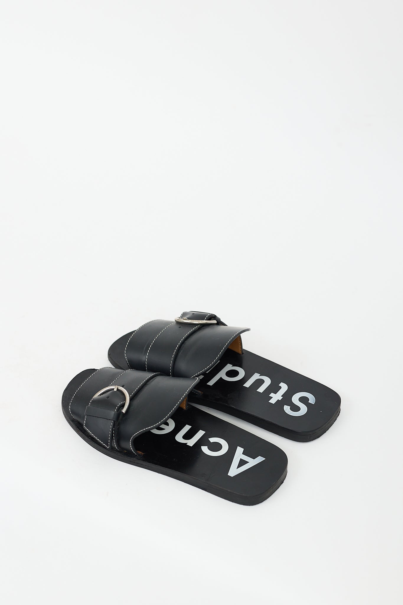 Pre-owned Acne Studios black leather Virgie slides featuring open square toe, contrast stitch, buckled strap at vamp, printed logo at insoles, and wooden outsole.