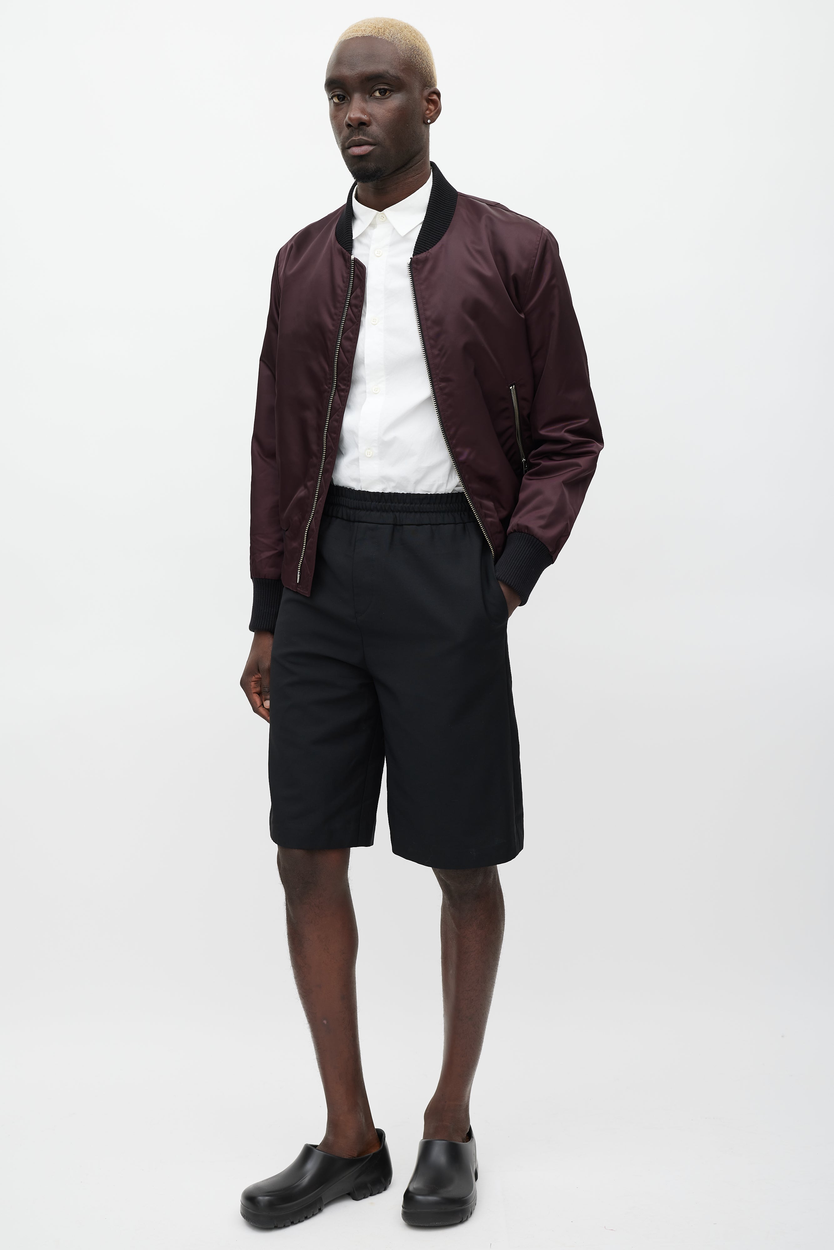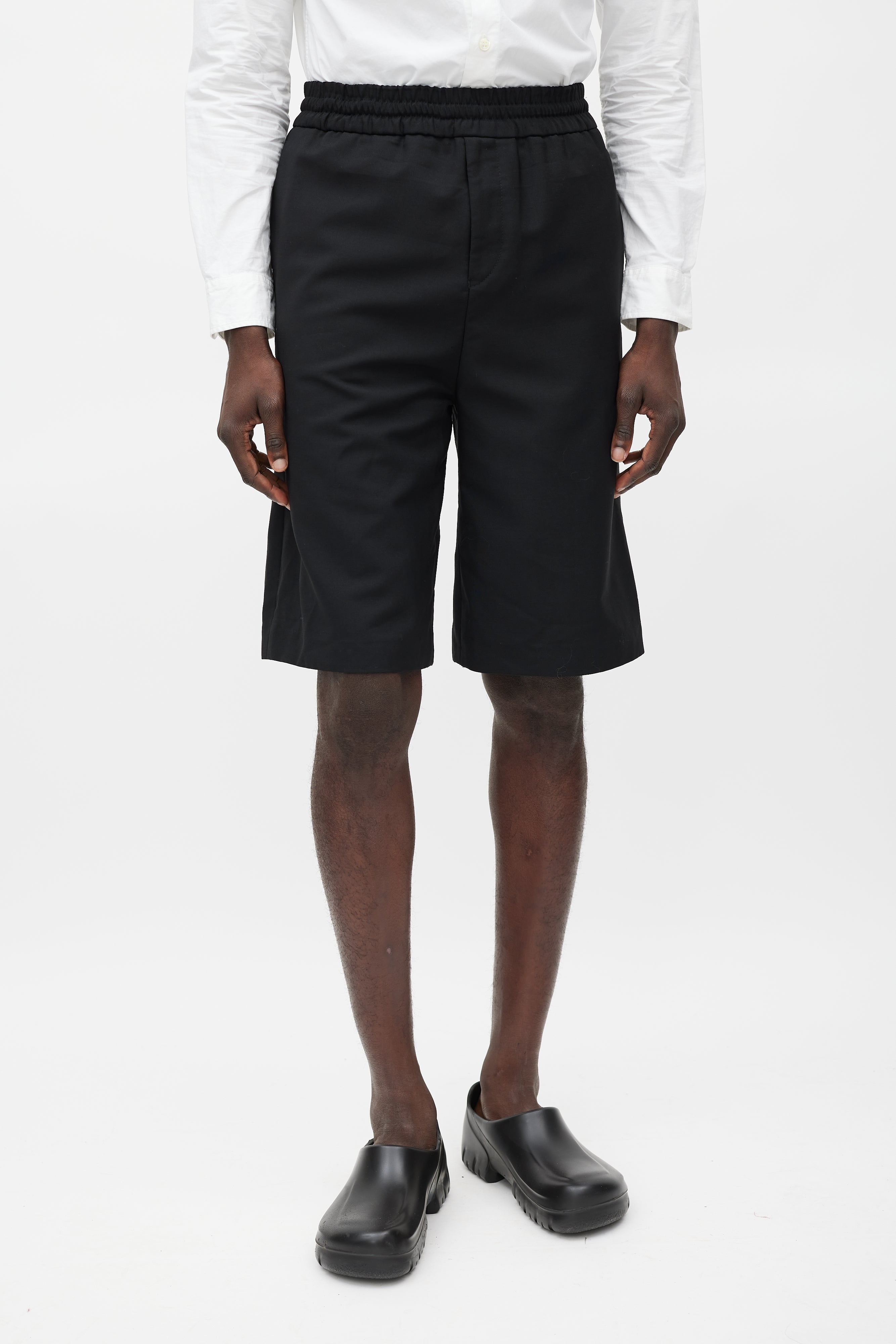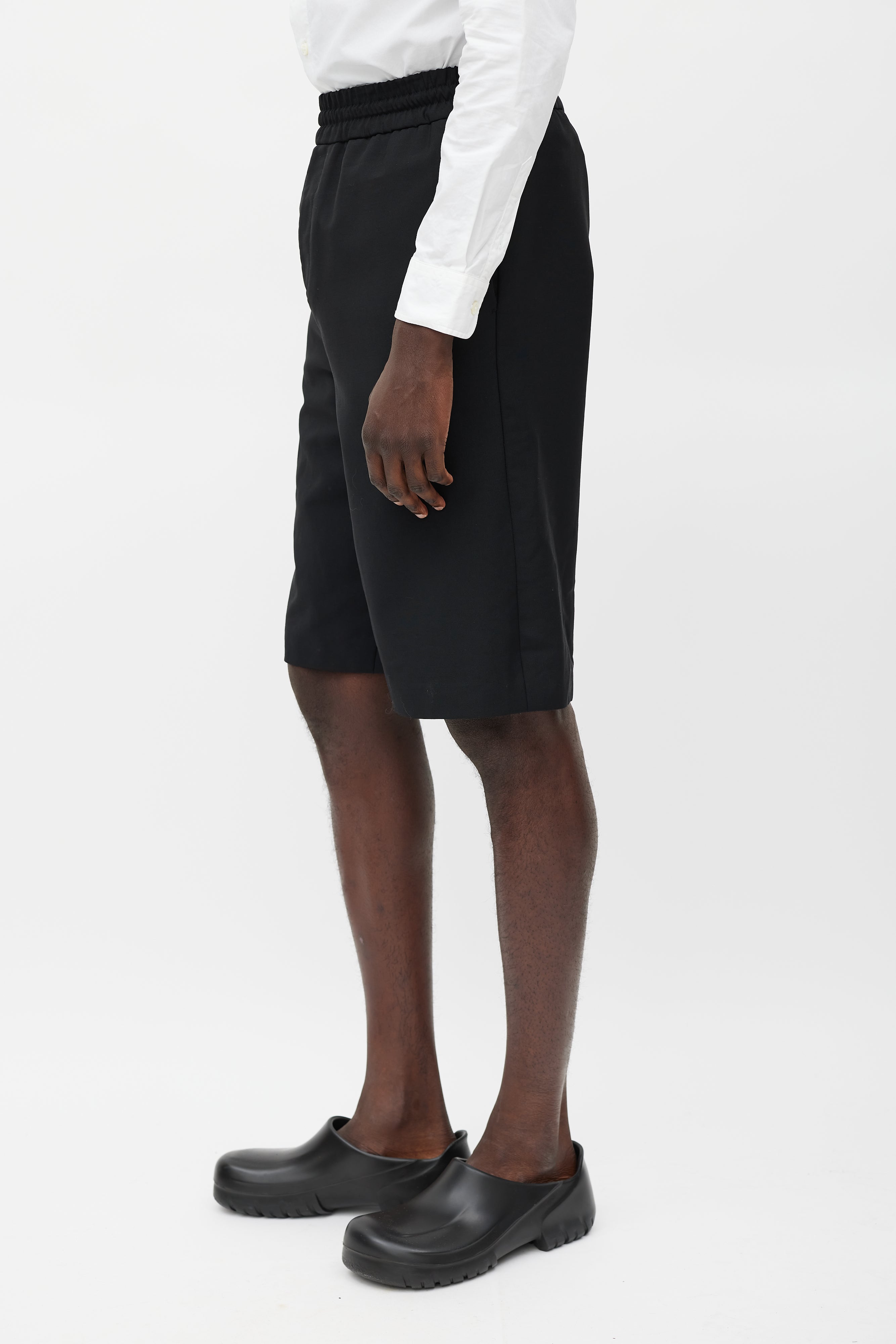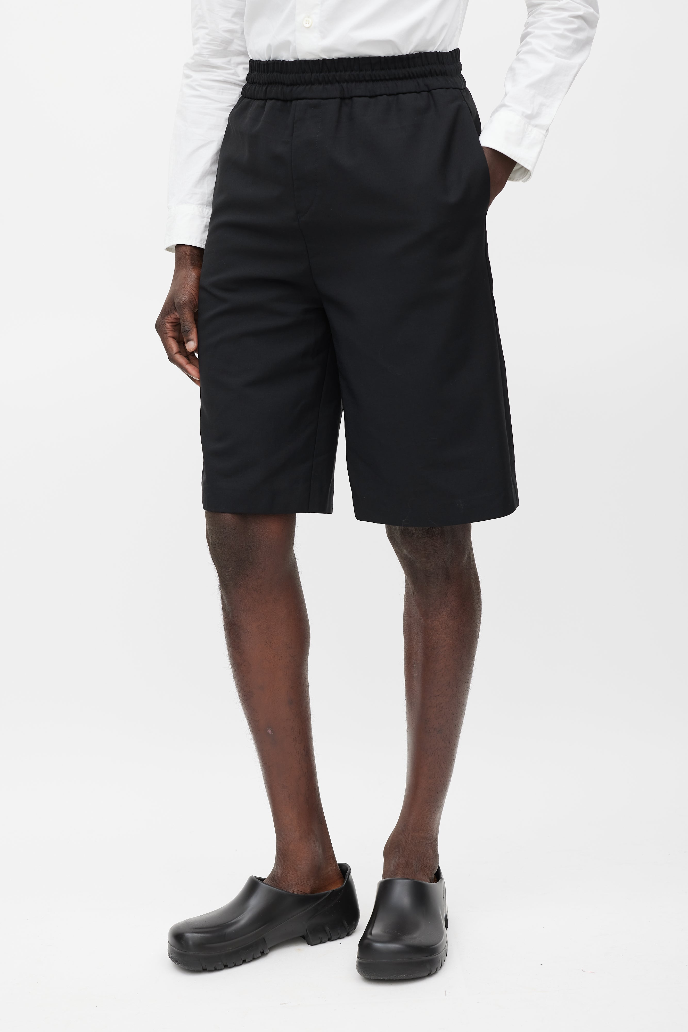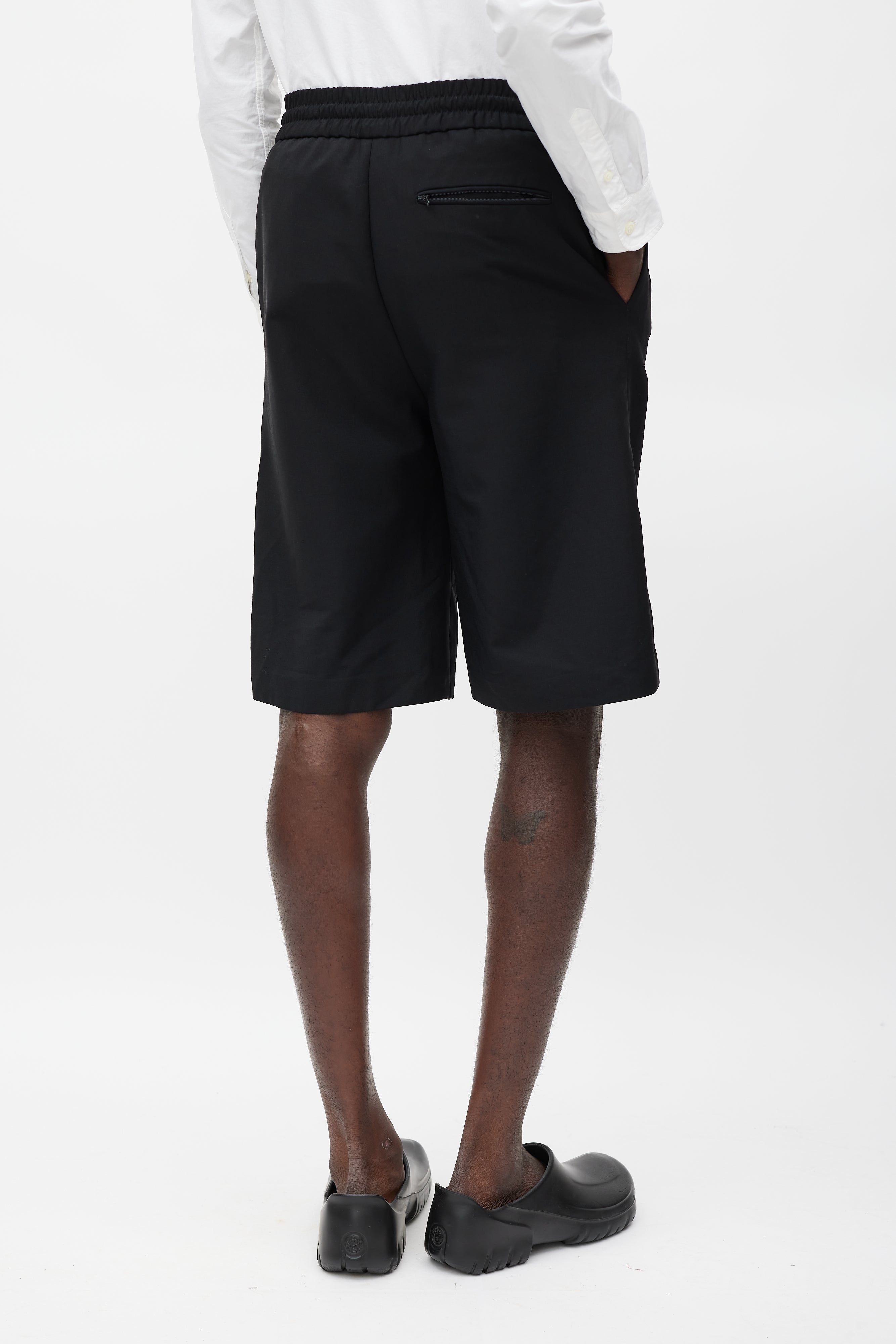 Pre-owned Acne Studios black wool shorts featuring an elasticized drawstring waist, two slip pockets at hip, one zip pocket at back, wide leg, and zip fly.