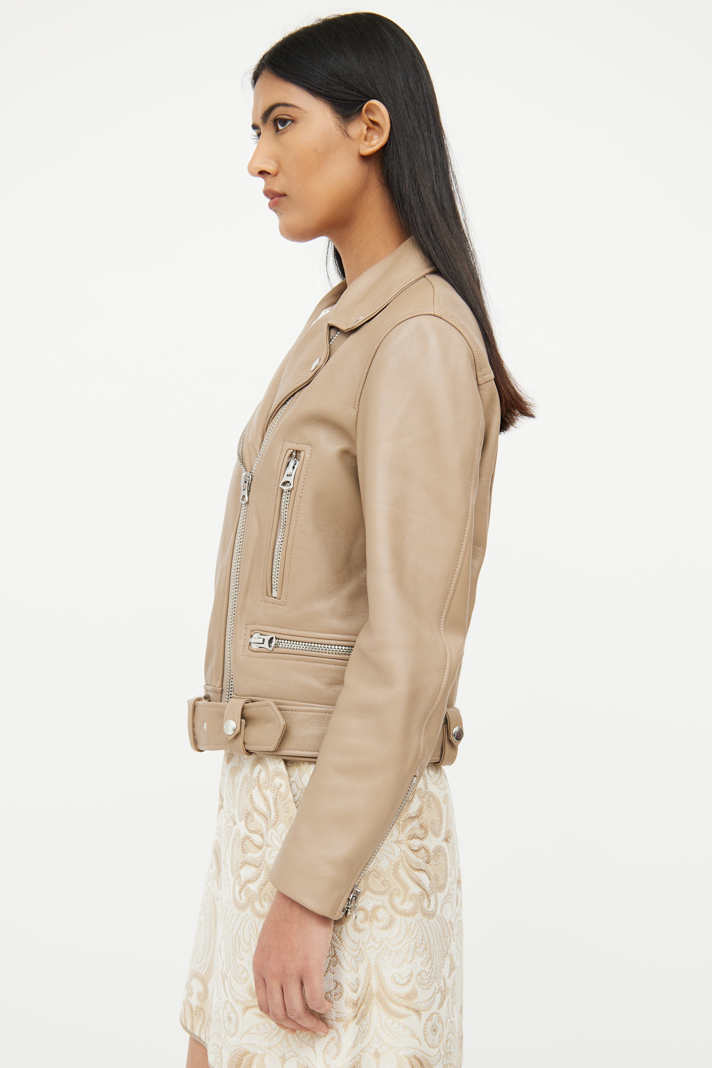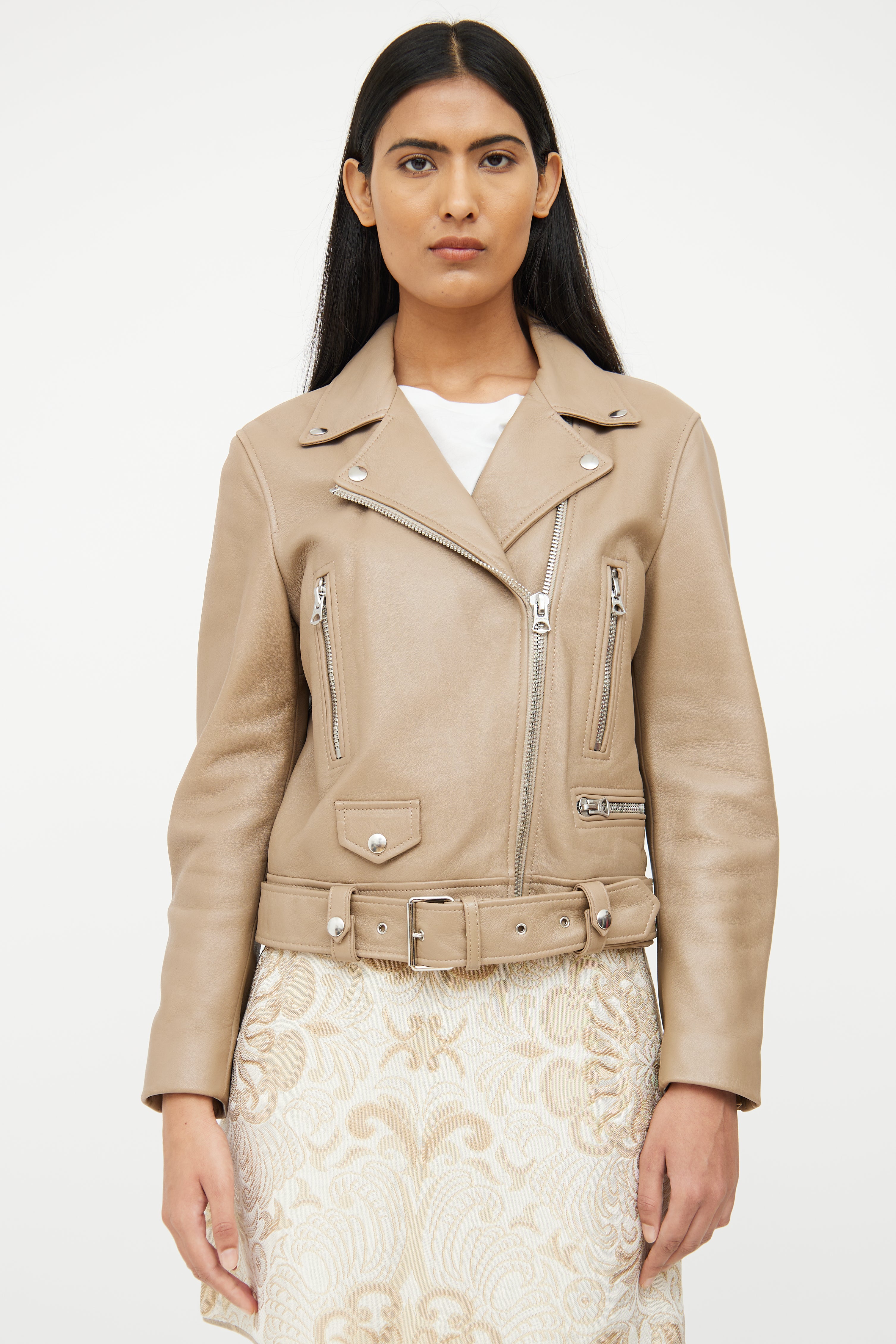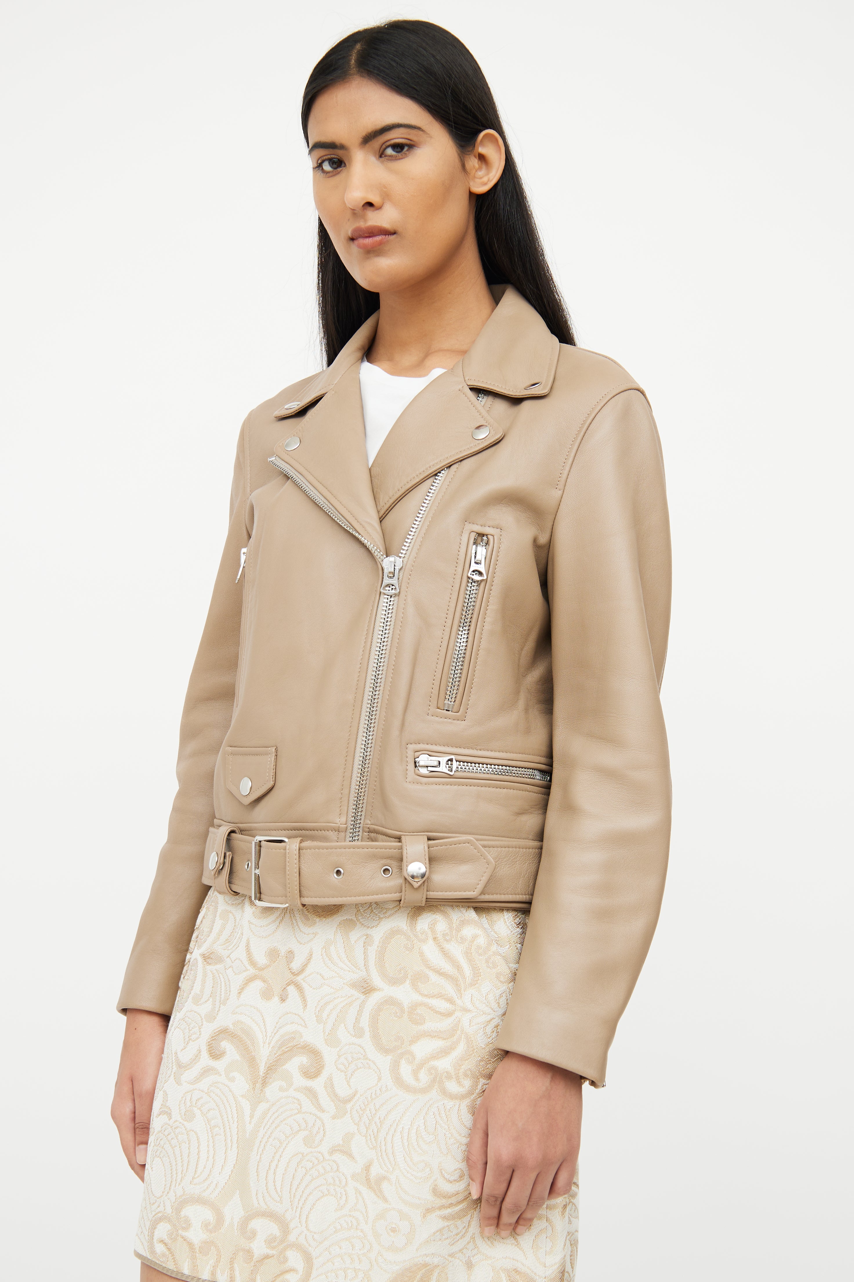Pre-owned Acne Studios brown long sleeve leather jacket featuring notch lapel collar with snap button detail, zip cuffs, asymmetrical zip up, silver tone hardware, dual zip pockets on chest, zip pocket on left waist, snap flap pocket on right waist, interior snap button pockets on waist and adjustable removeable belt at waist.