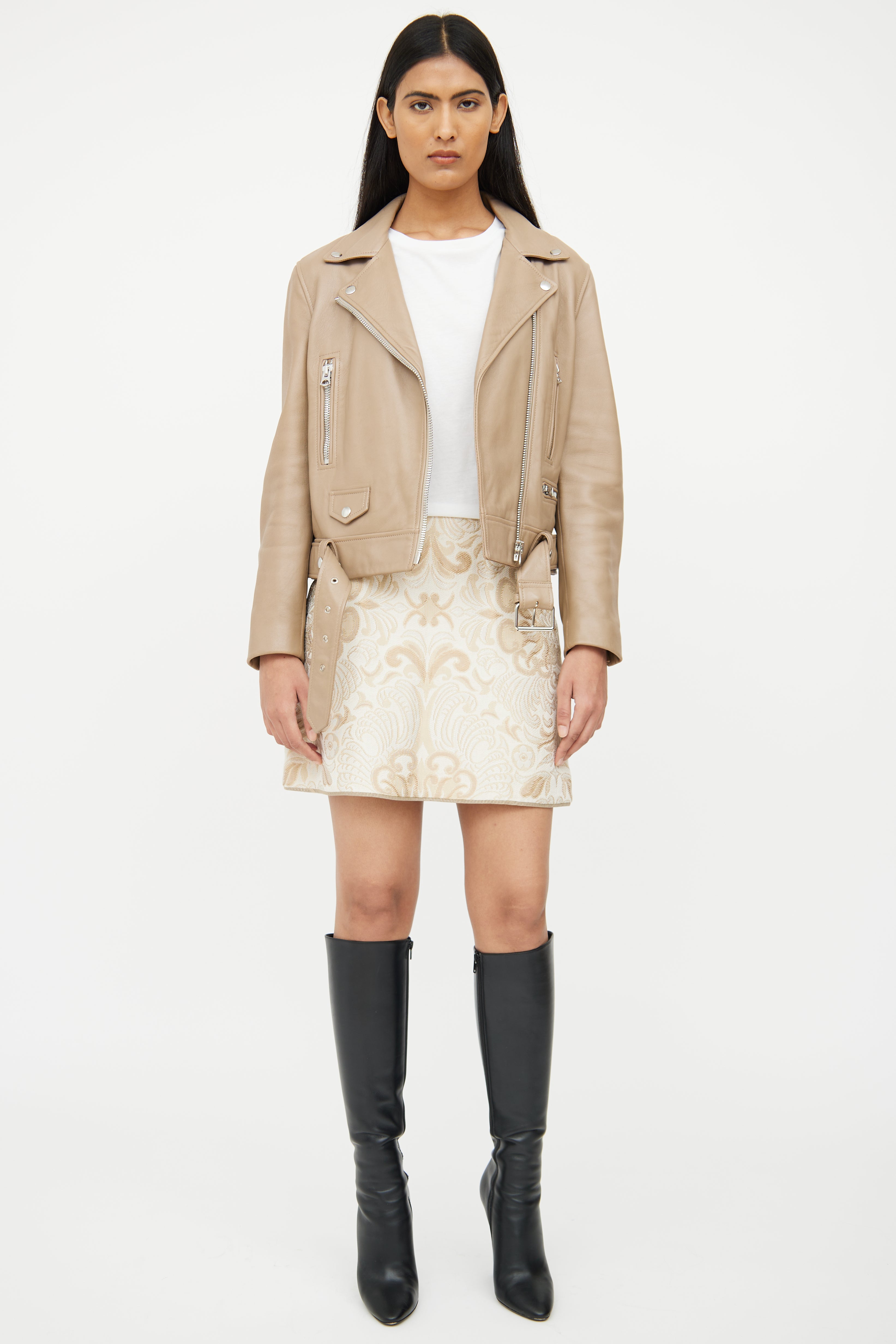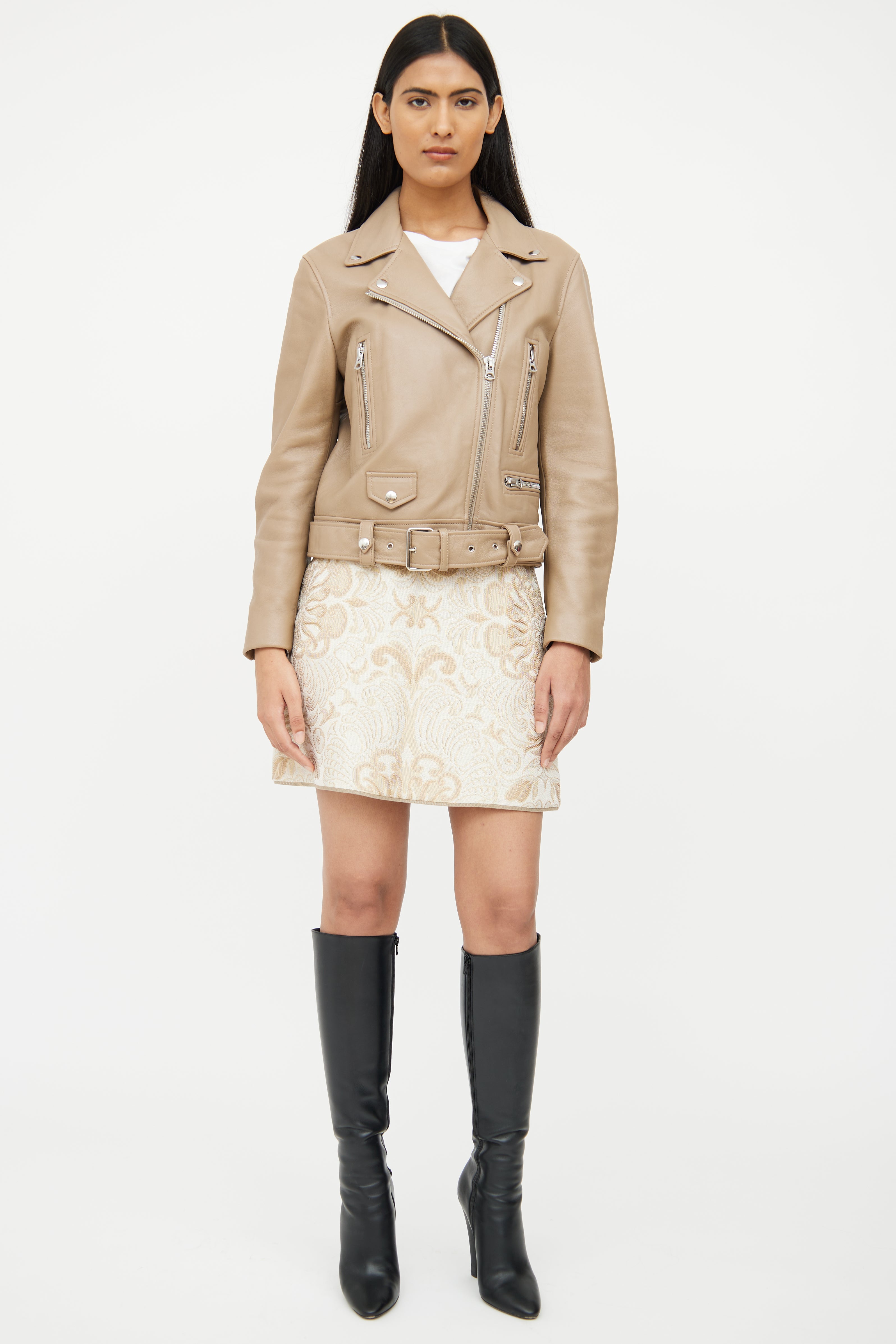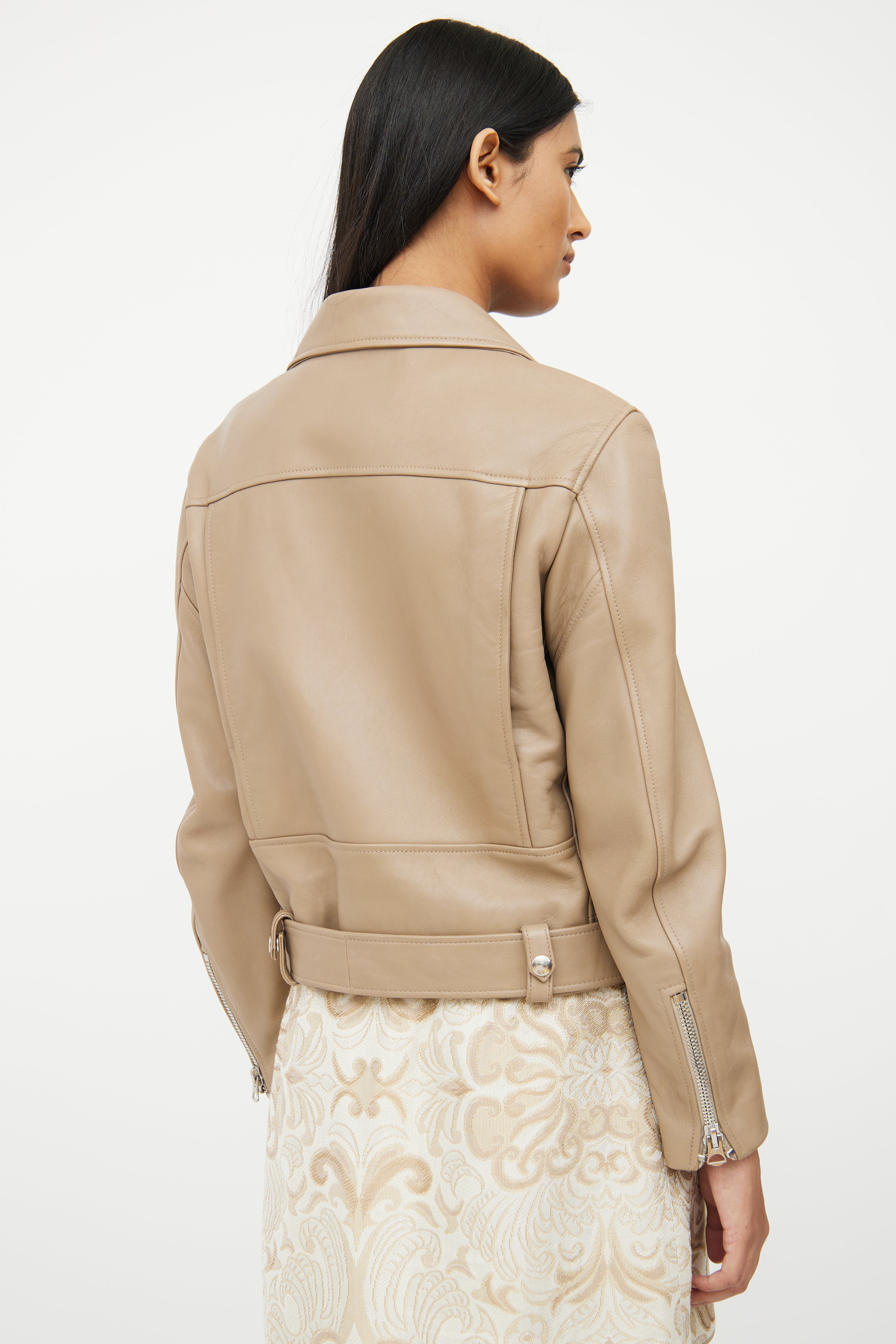 Pre-owned Acne Studios brown long sleeve leather jacket featuring notch lapel collar with snap button detail, zip cuffs, asymmetrical zip up, silver tone hardware, dual zip pockets on chest, zip pocket on left waist, snap flap pocket on right waist, interior snap button pockets on waist and adjustable removeable belt at waist.