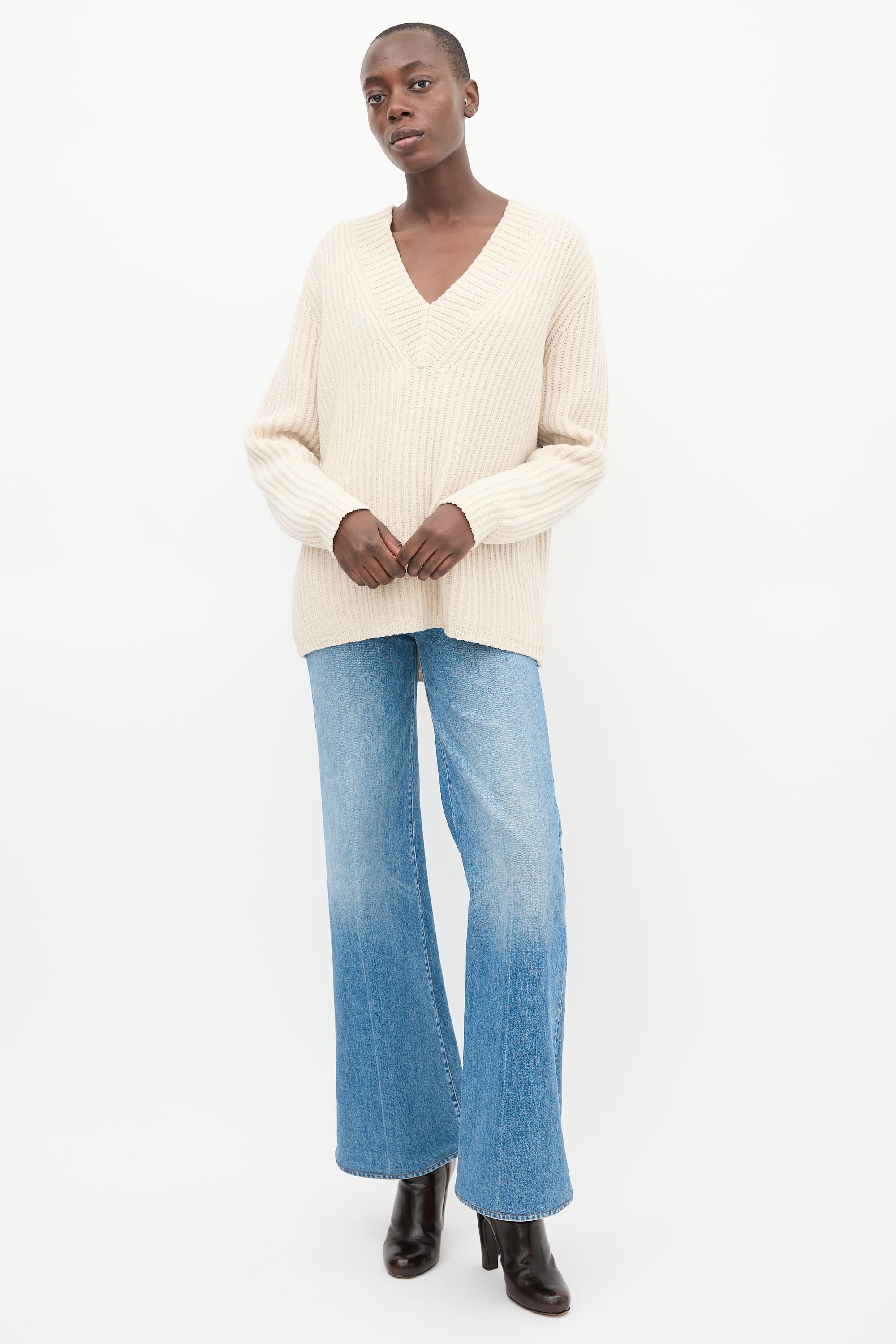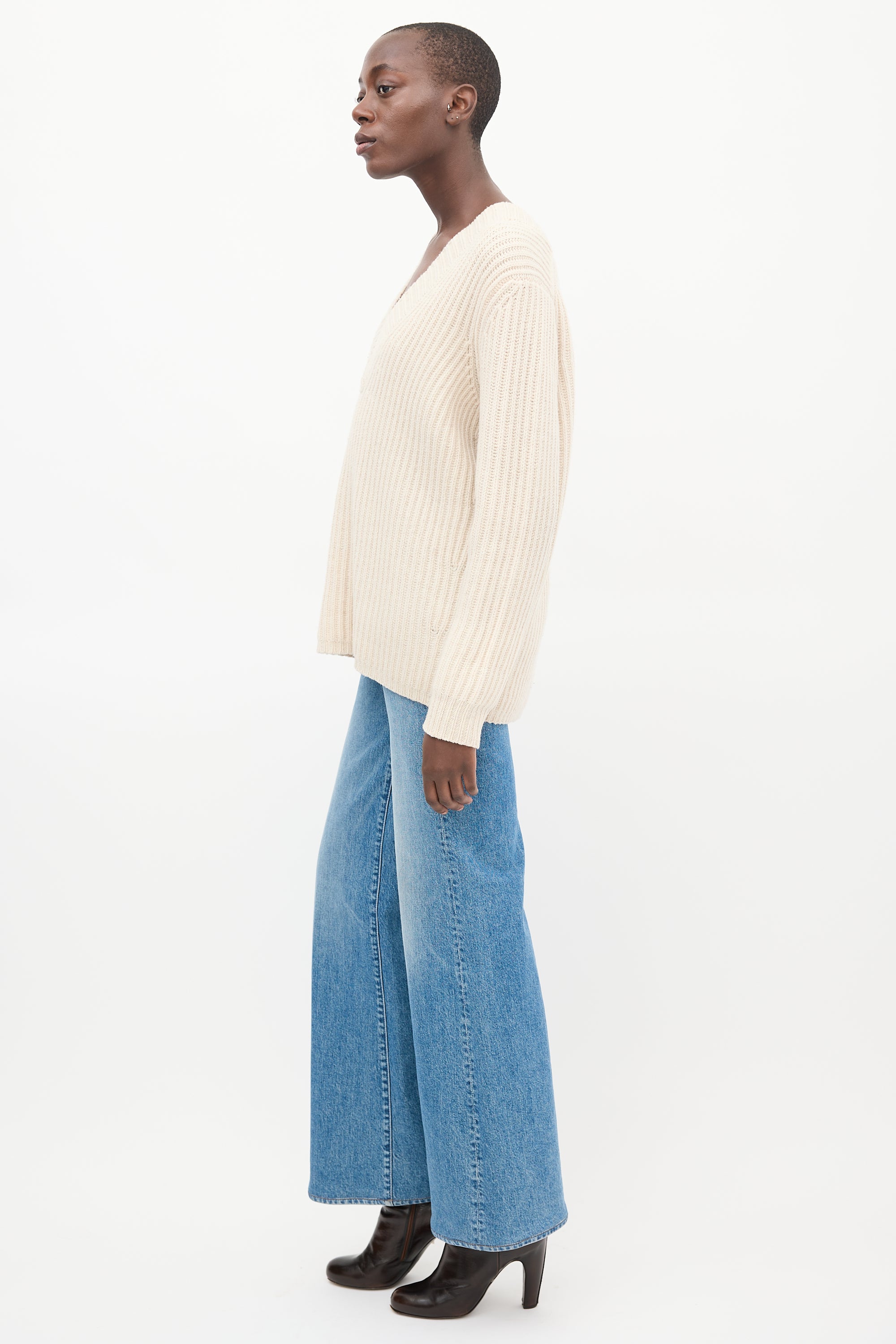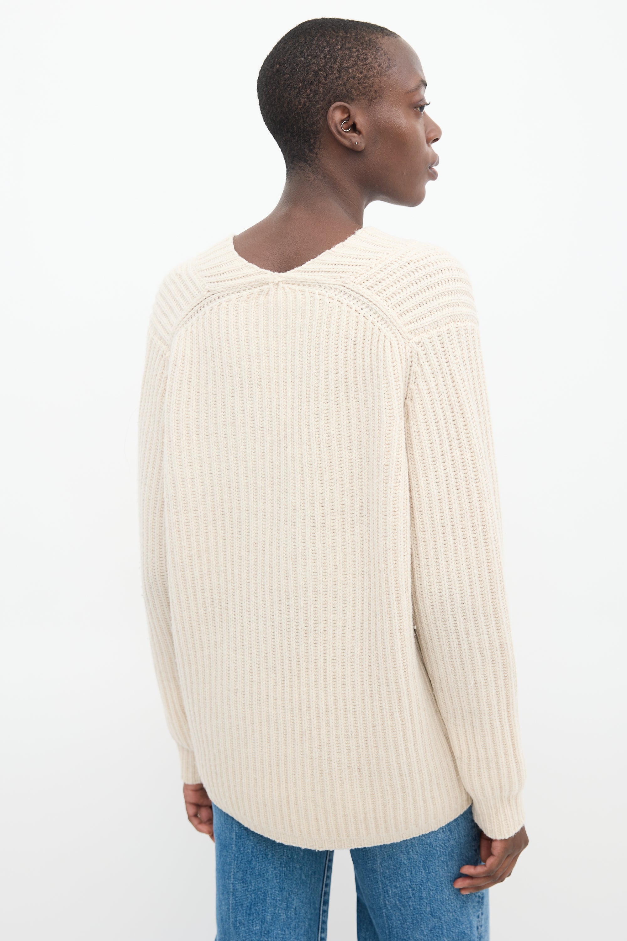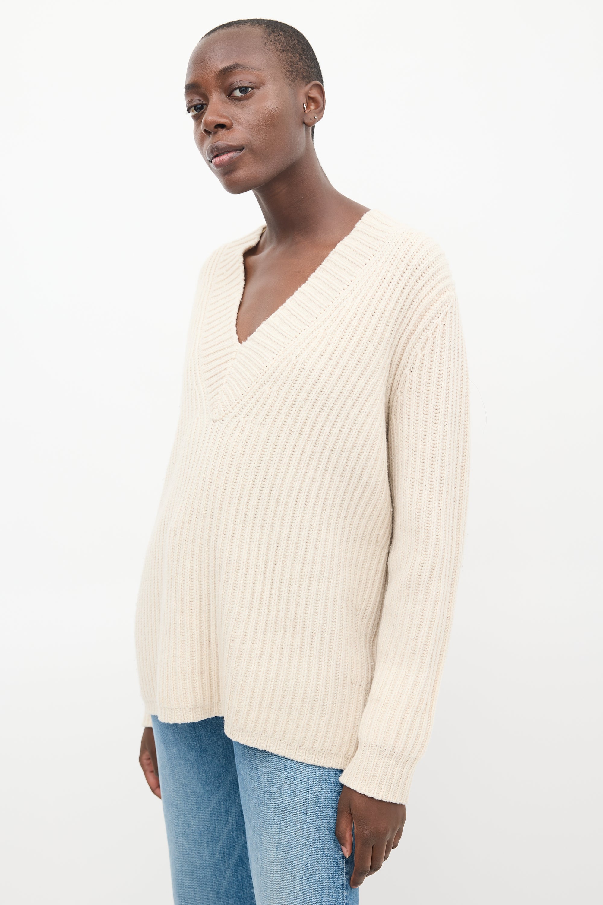 Pre-owned Acne Studios cream wool sweater featuring V-neck, ribbed knit, and long sleeves.