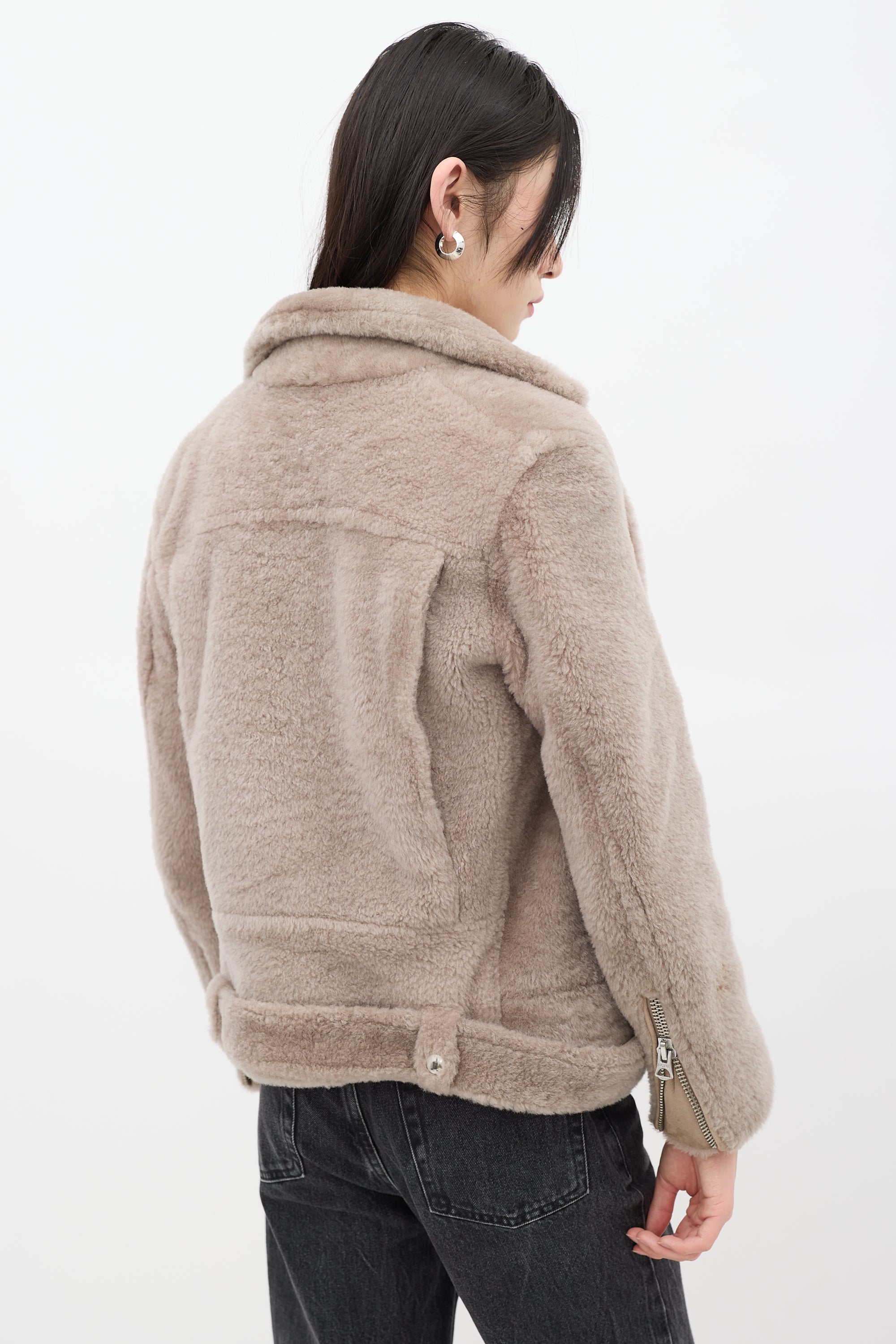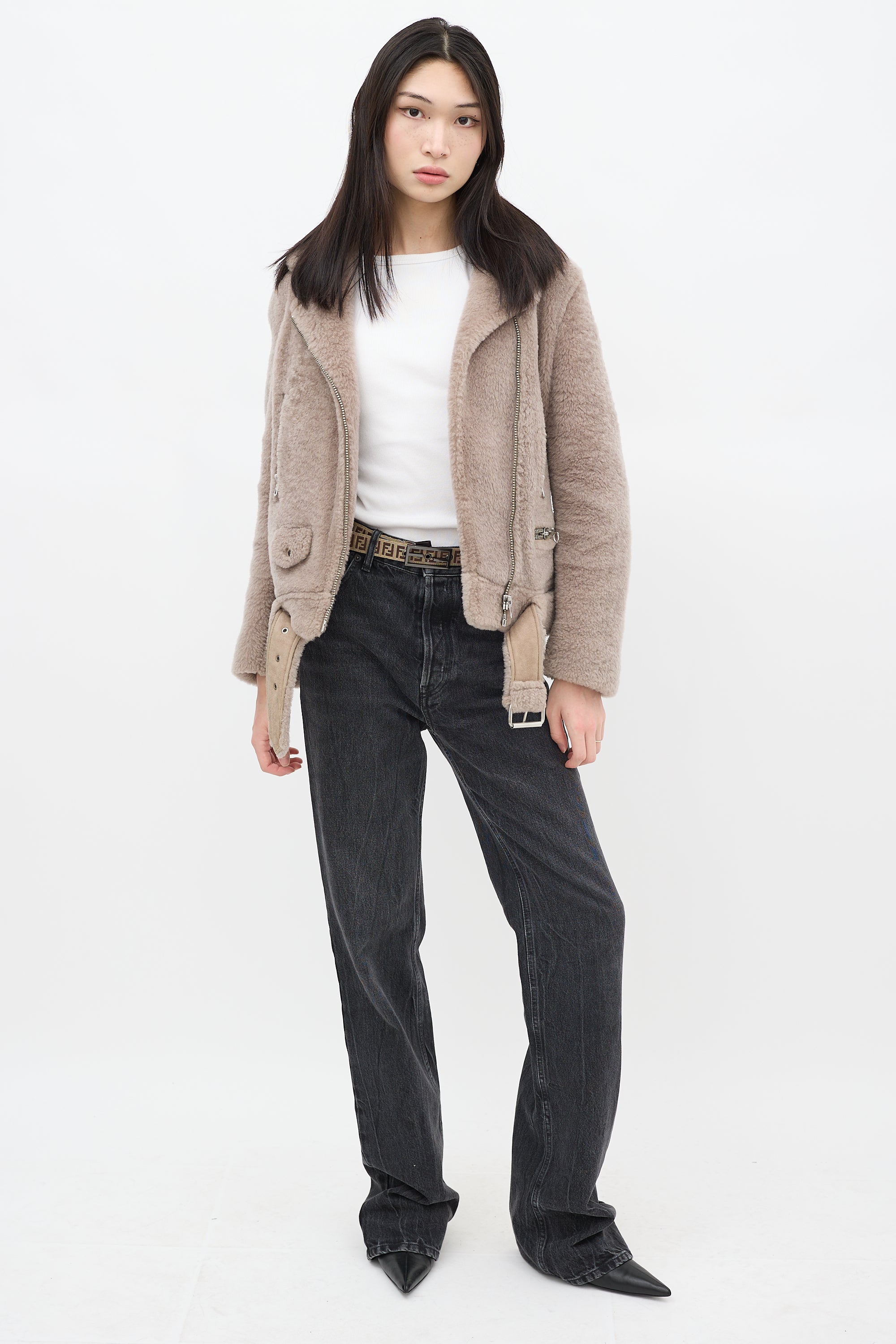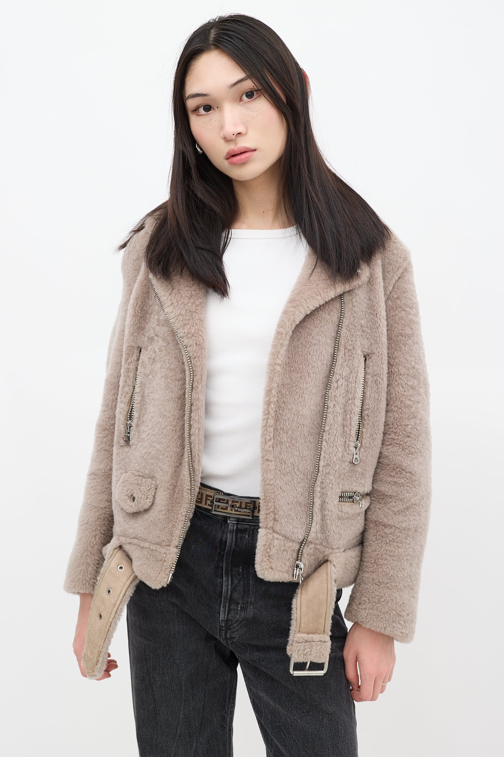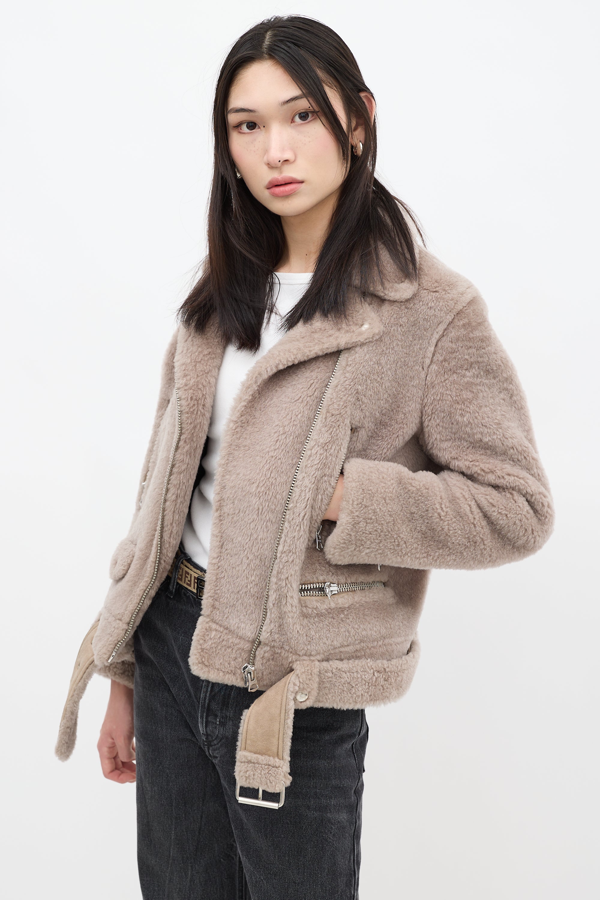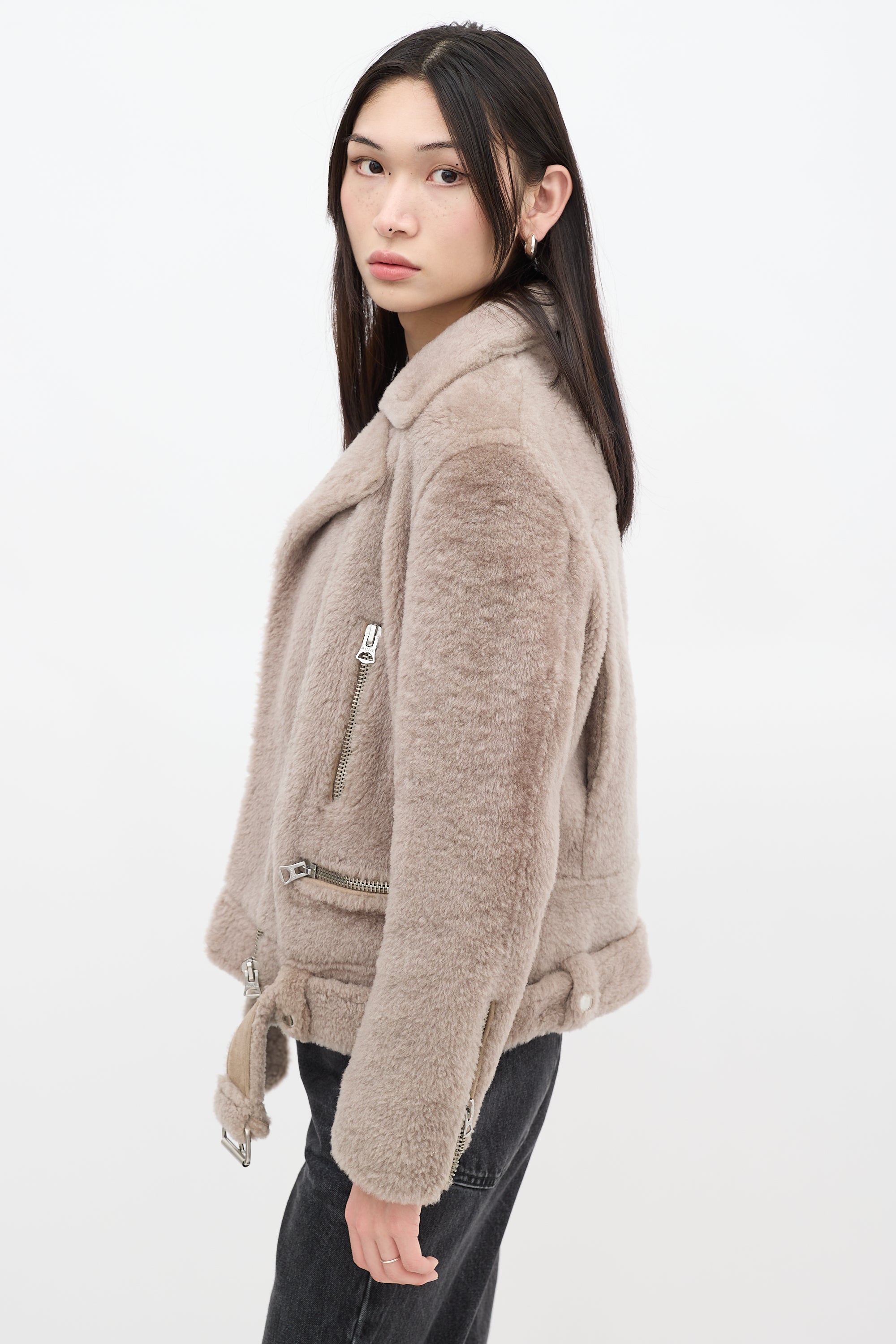 Pre-owned Acne Studios grey shearling moto jacket featuring a notched collar, long sleeves with zipped cuffs, four zip pockets at hip, adjustable belt at waist, and zip closure. Lined.