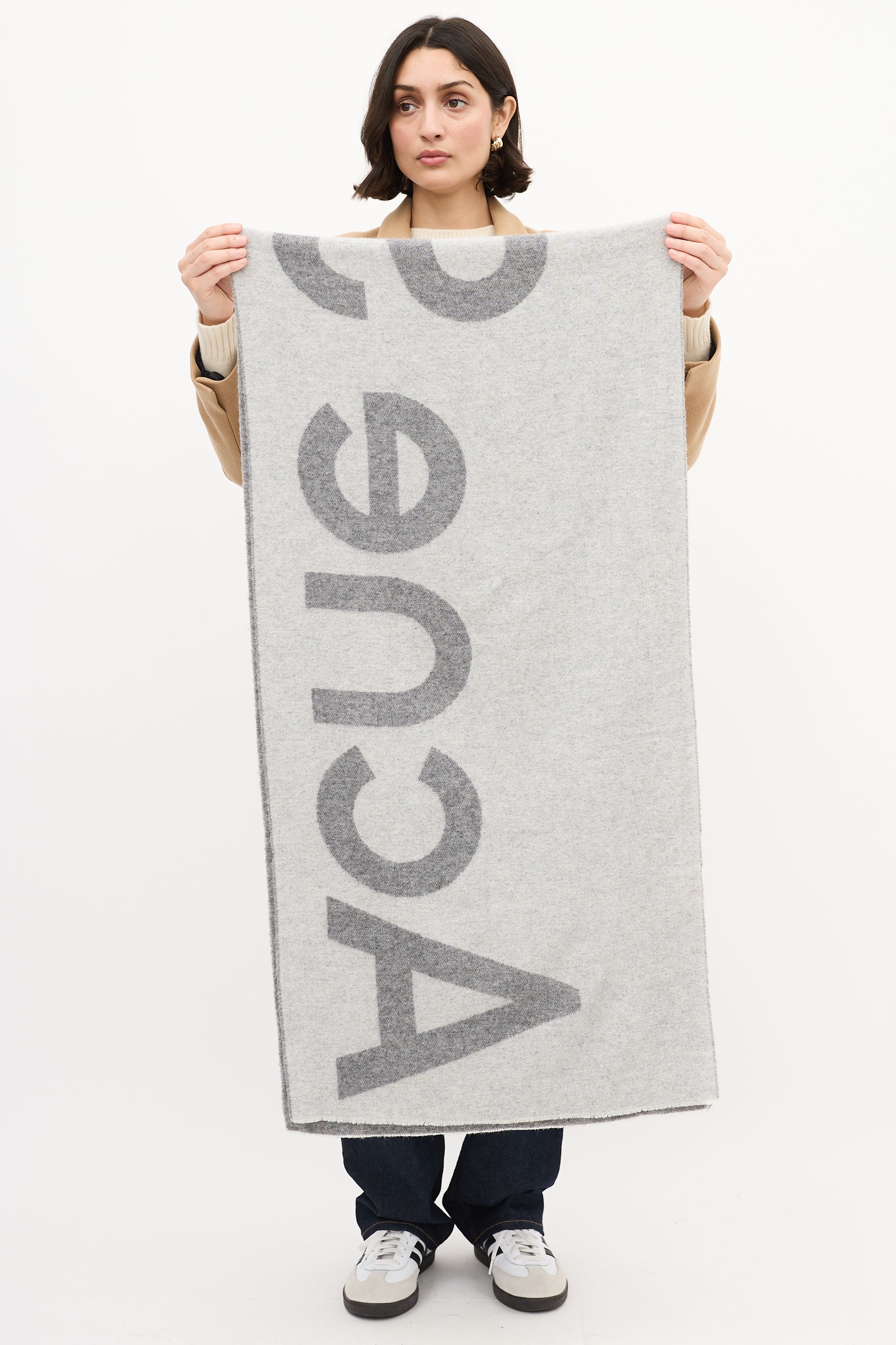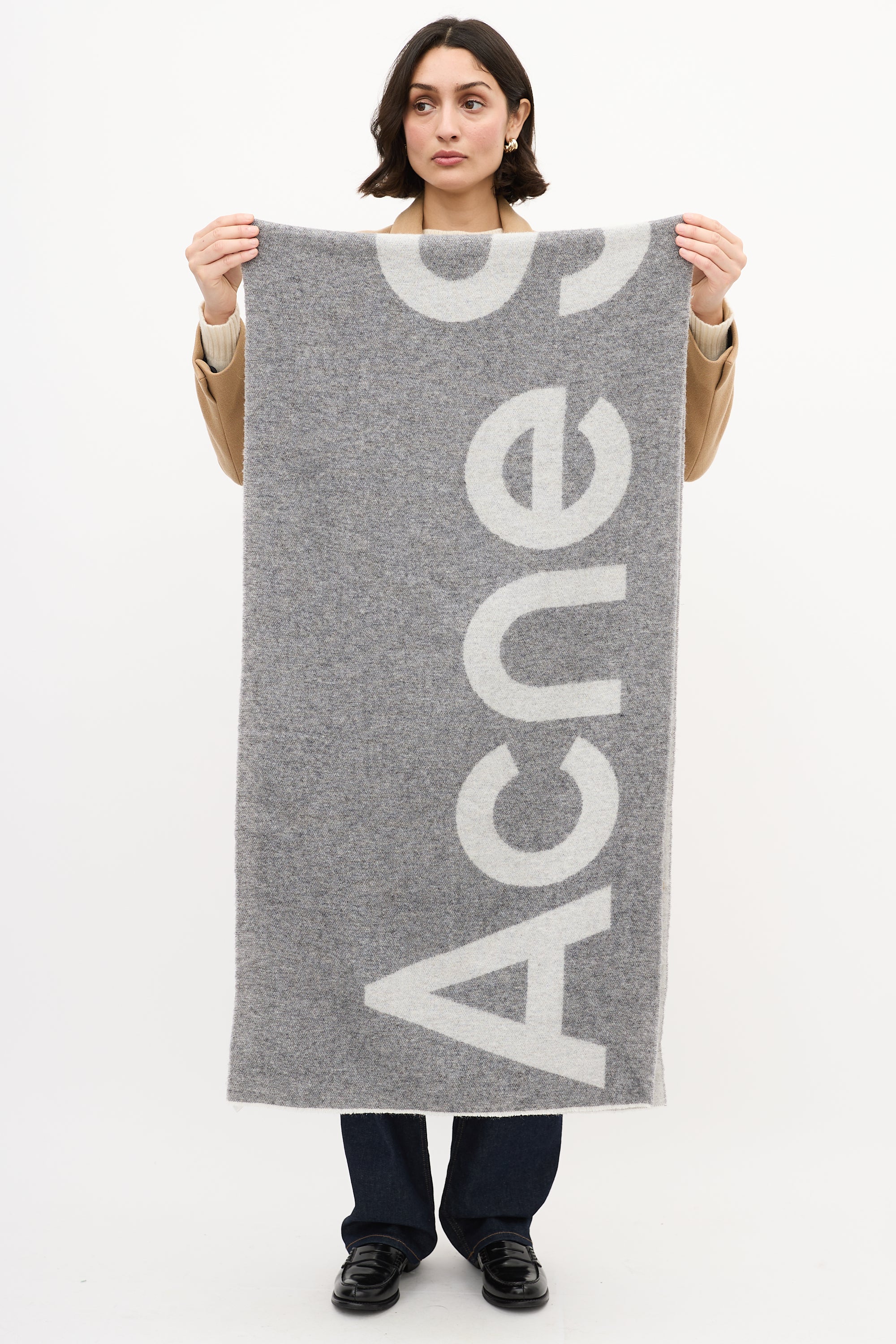 Pre-owned Acne Studios dark grey wool scarf featuring light grey reverse, logo intarsia, and fringe hem.