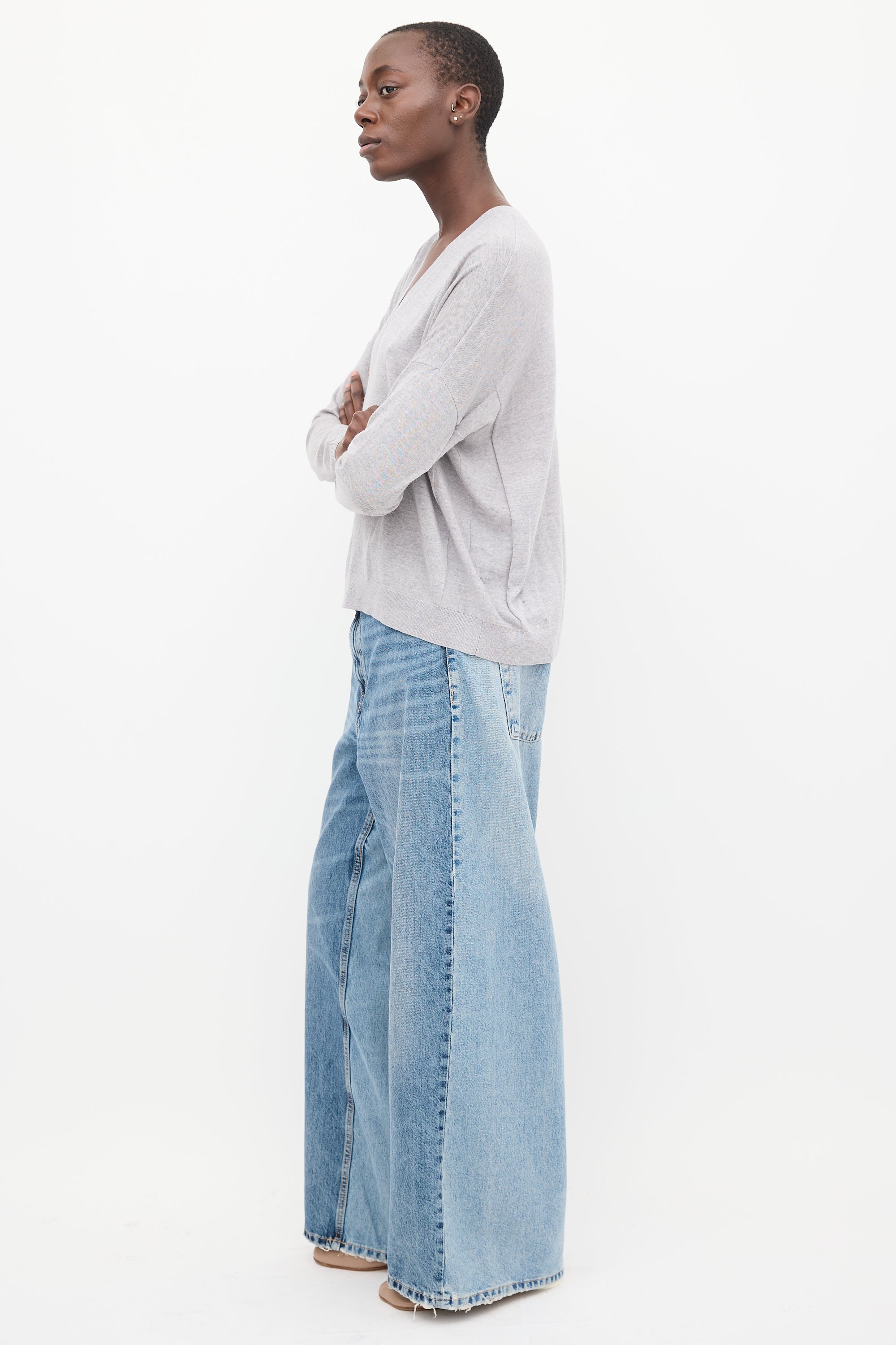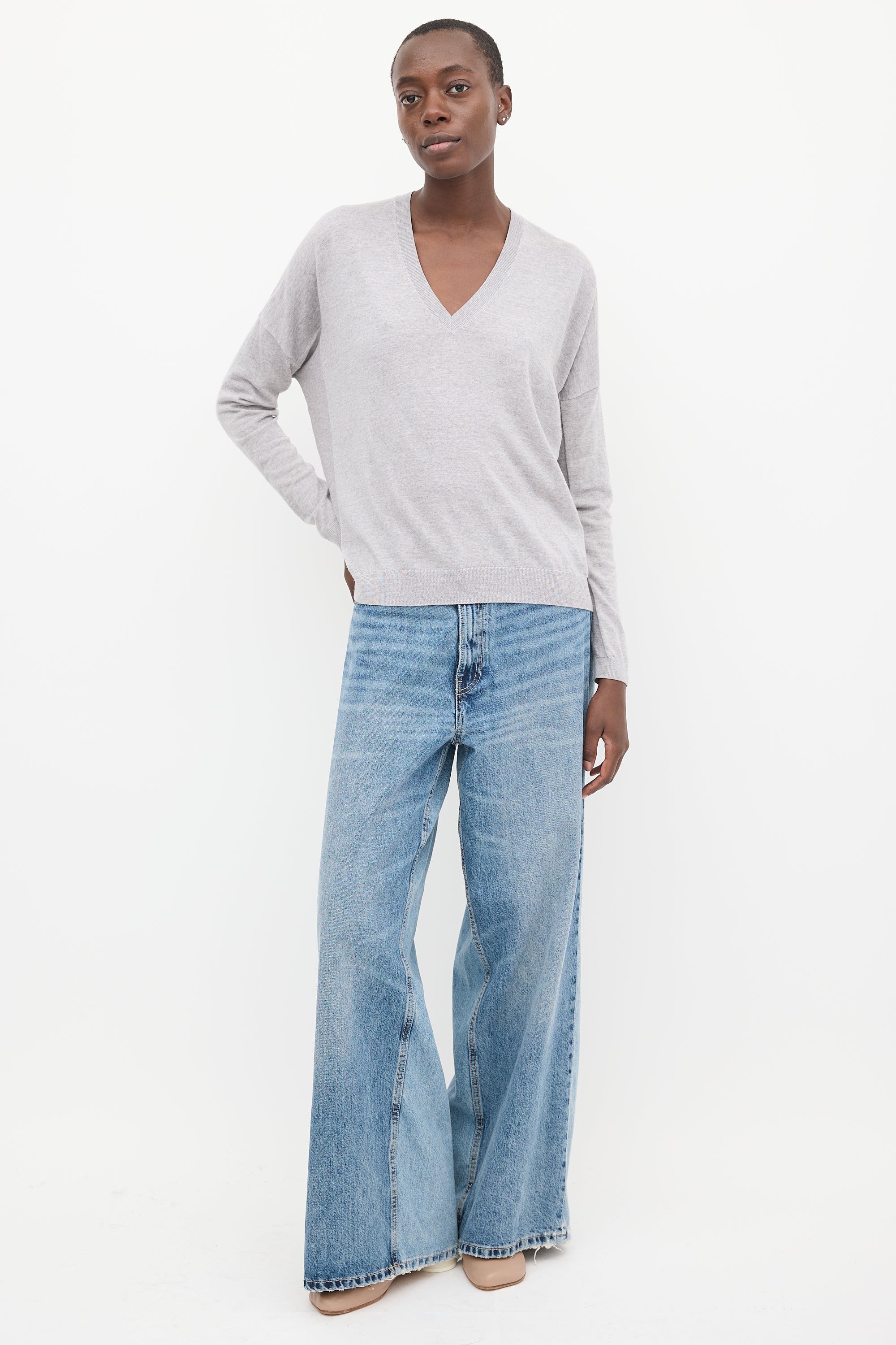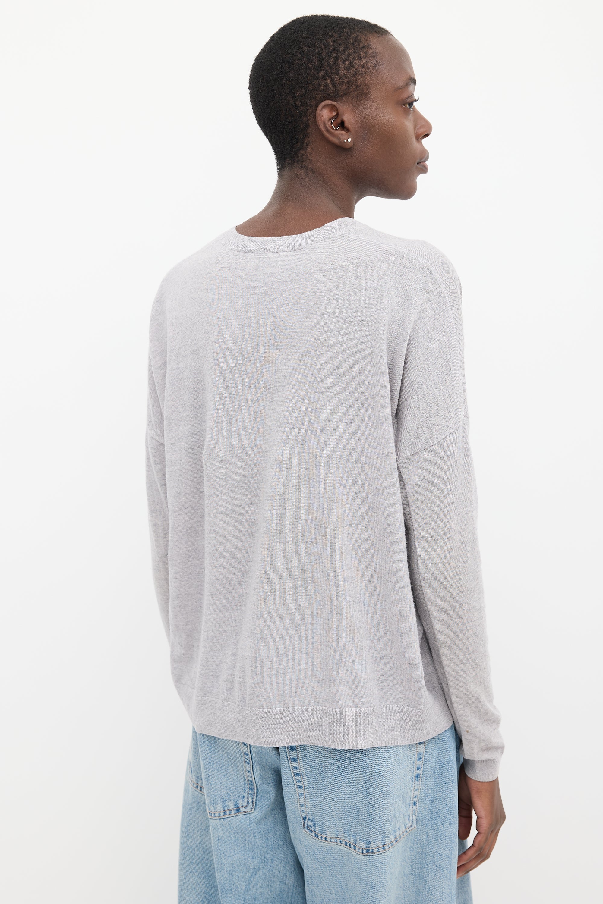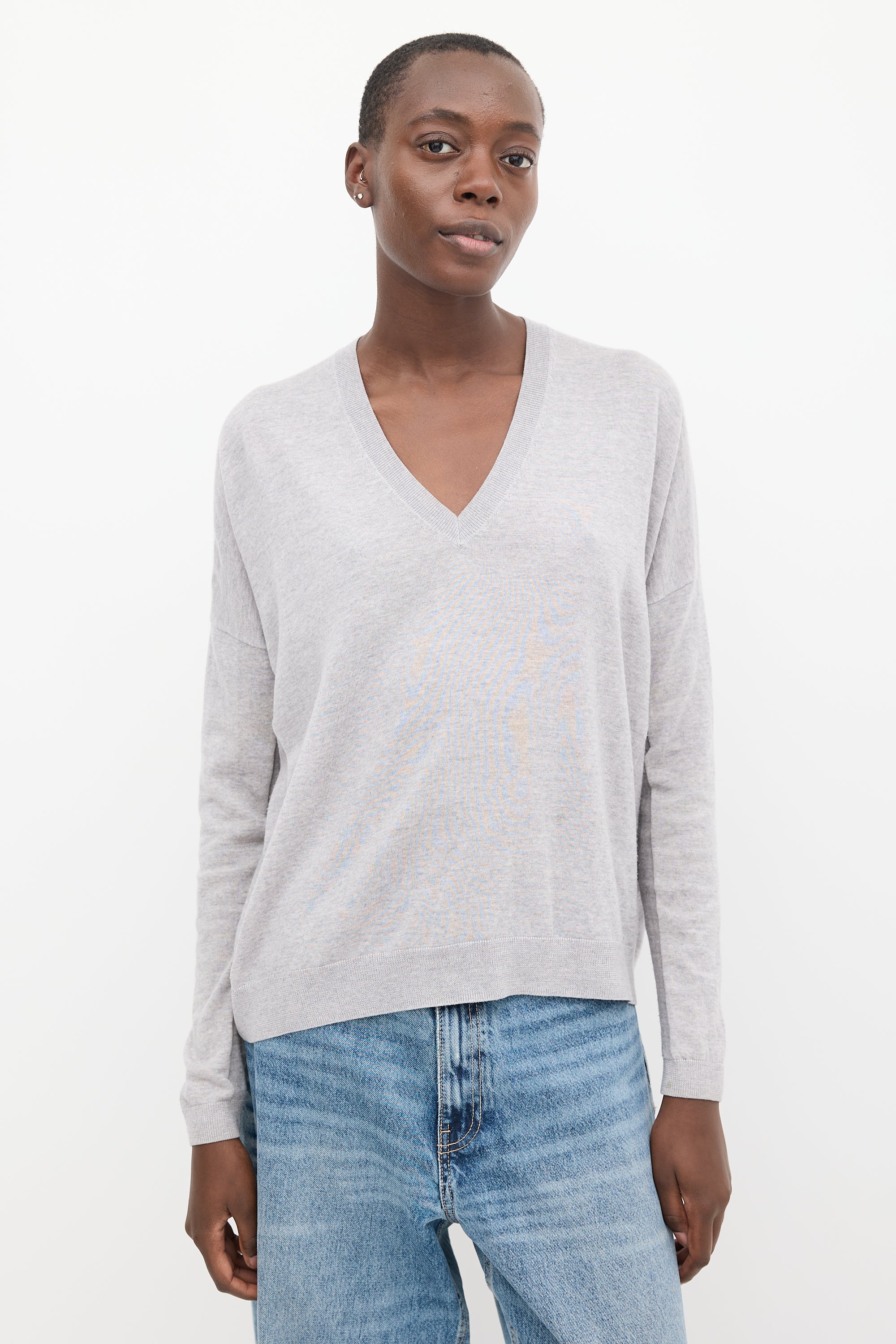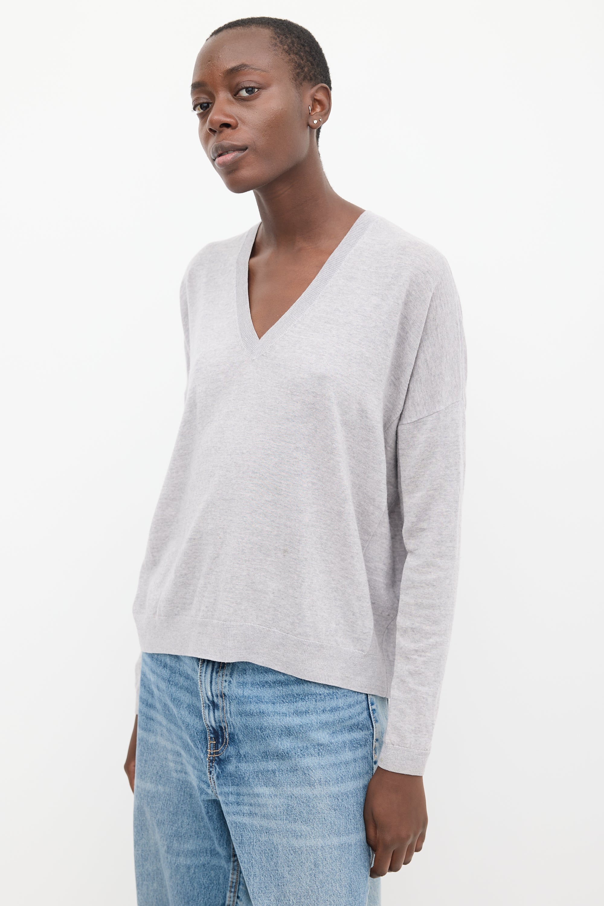Pre-owned Acne Studios heather grey wool sweater featuring a V-neckline, dropped shoulders, panelled sides, long sleeves, and ribbing at neck, hem, and cuffs.