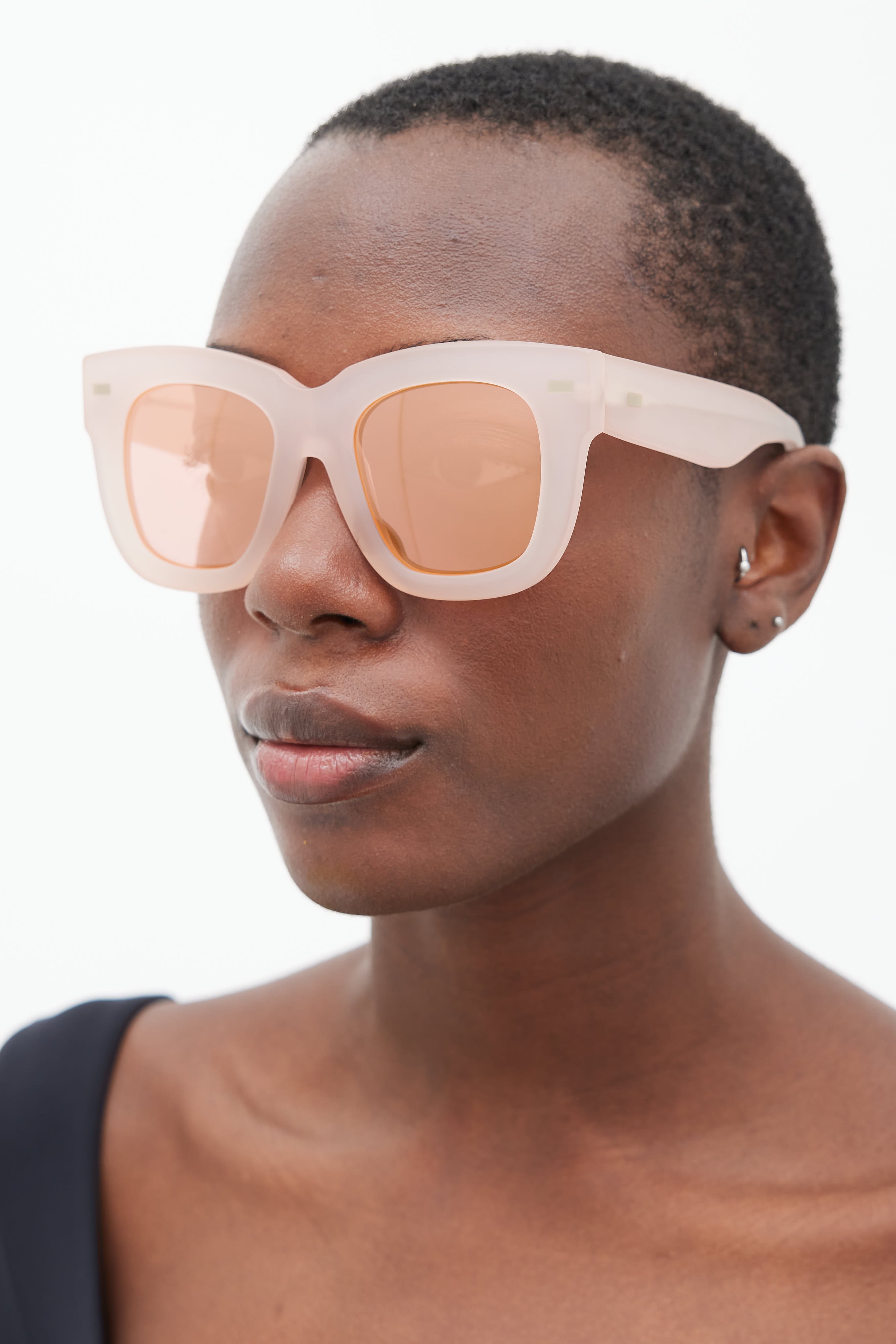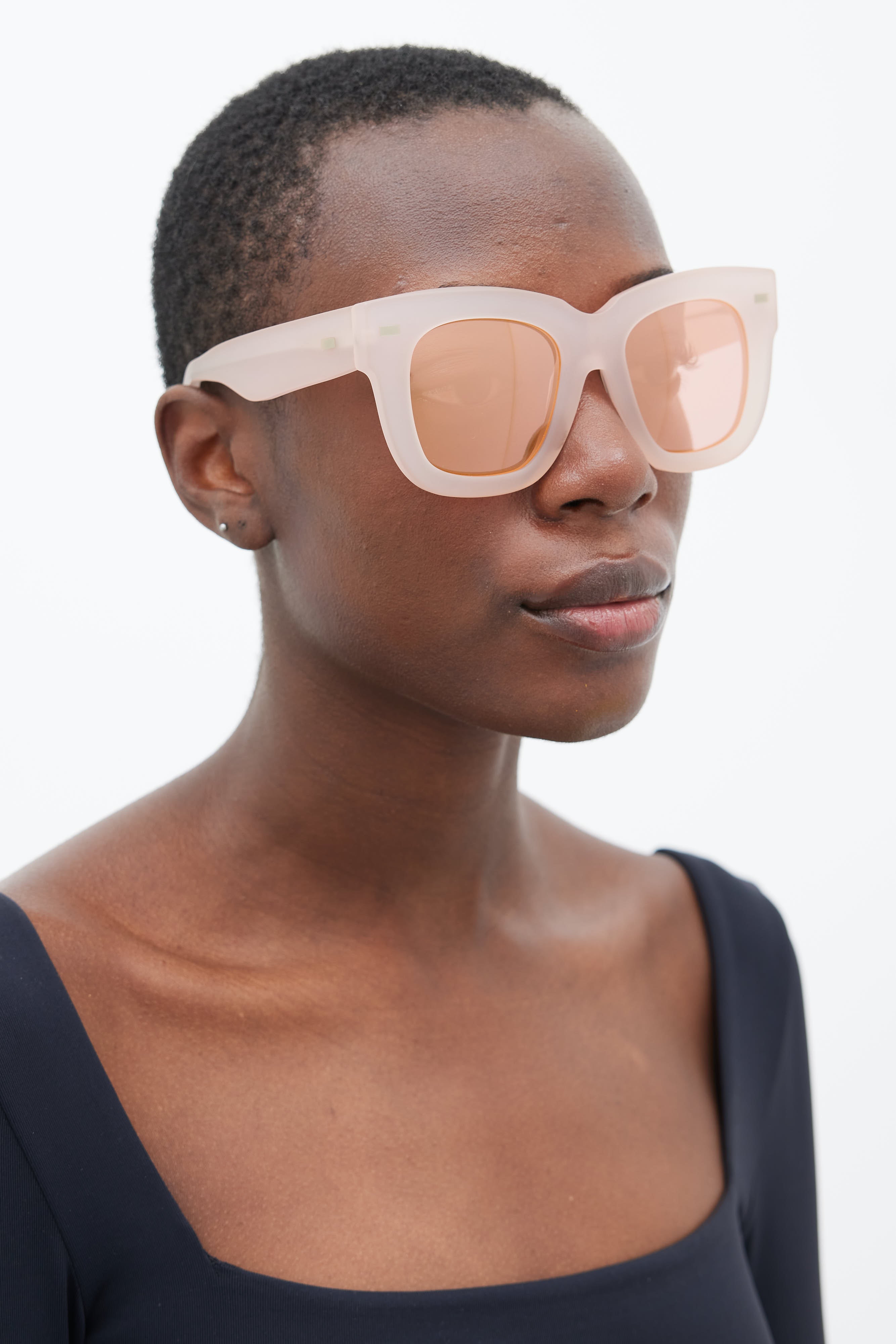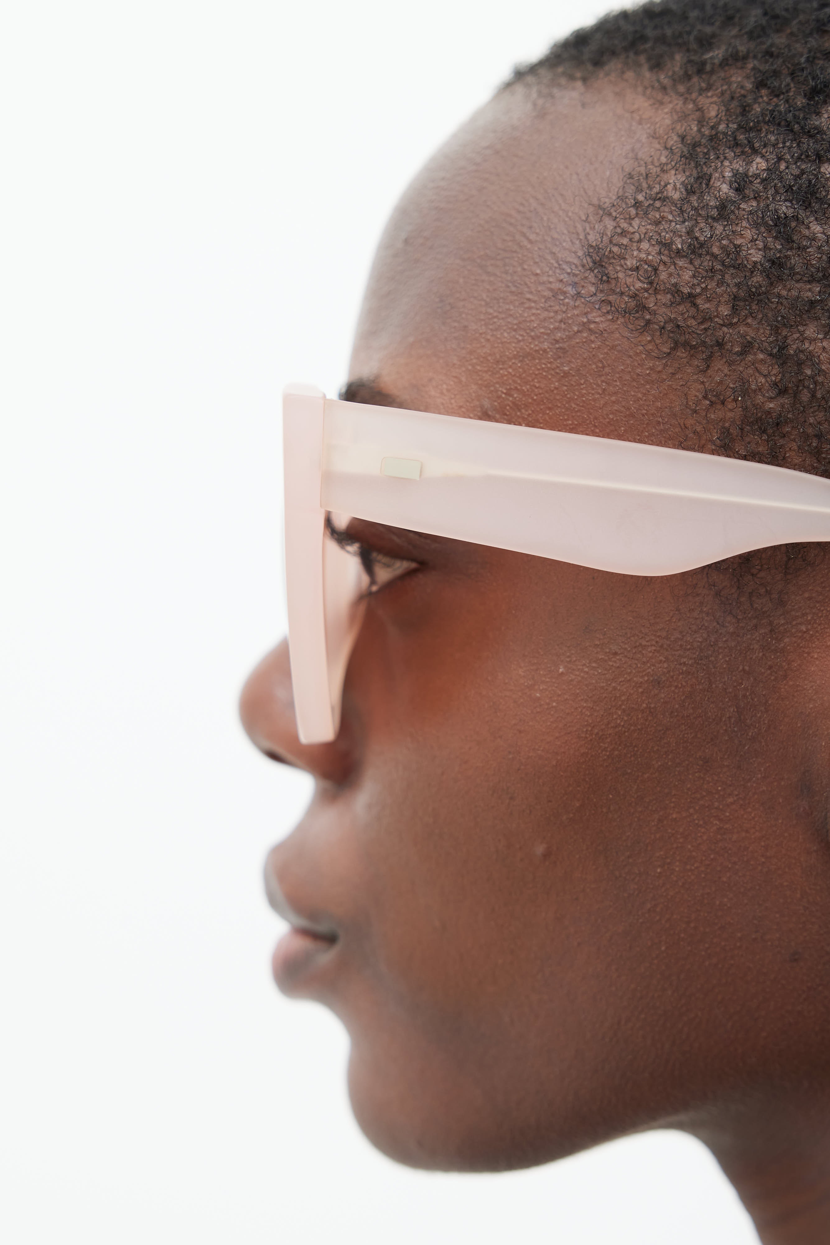 Pre-owned Acne Studios pink Library sunglasses featuring a matte acetate frame, reflective lenses, and visible wire at arms. Comes with pouch.