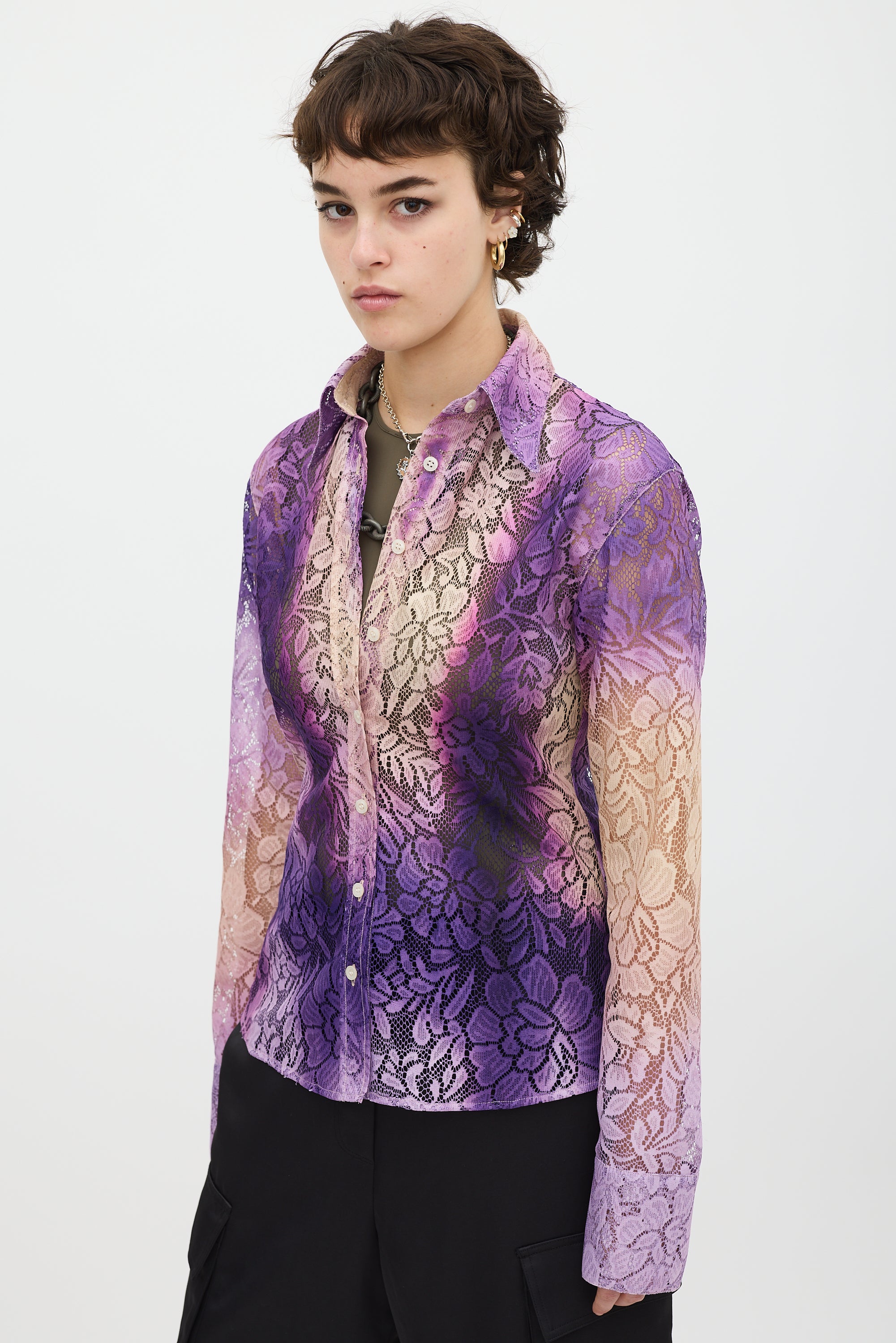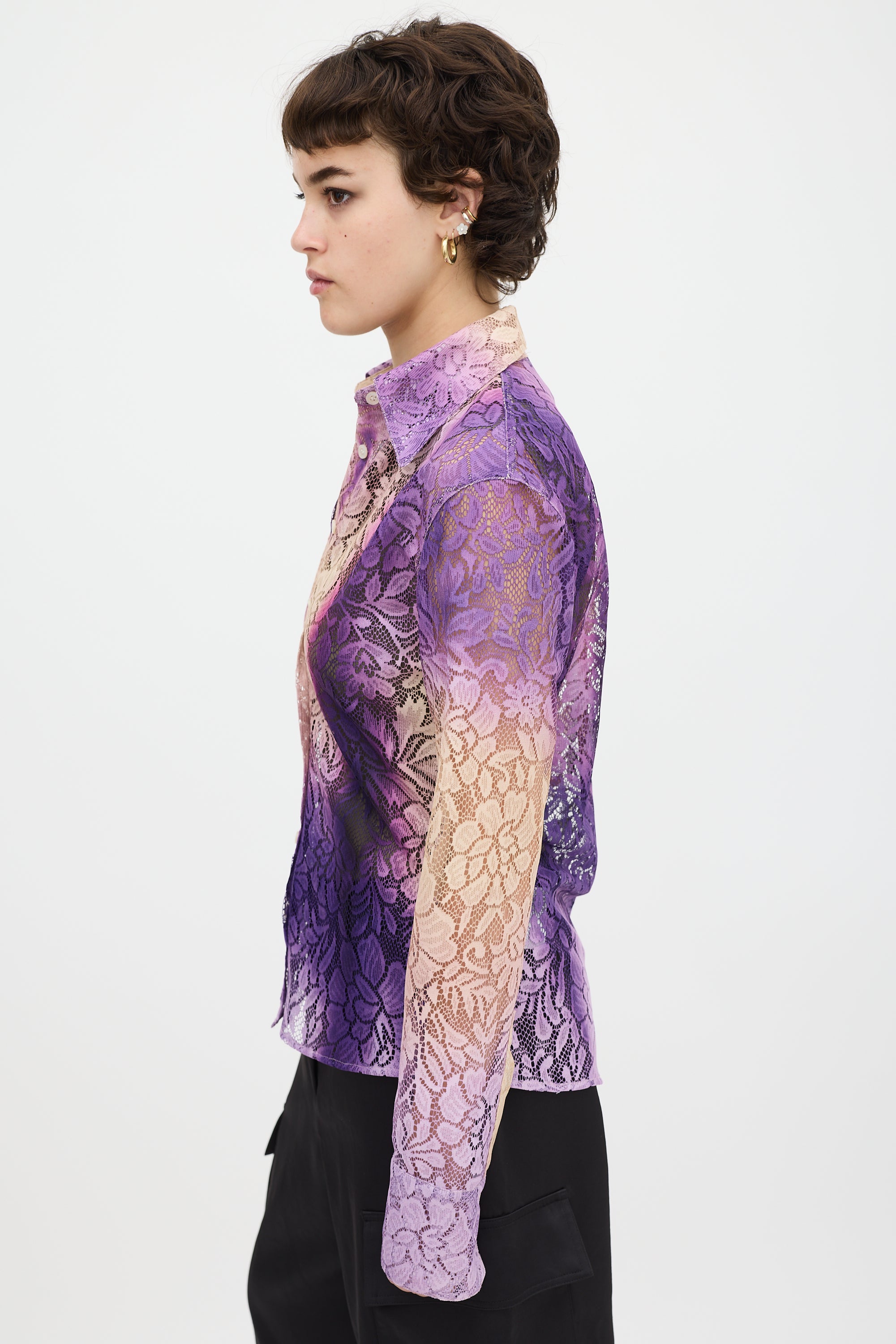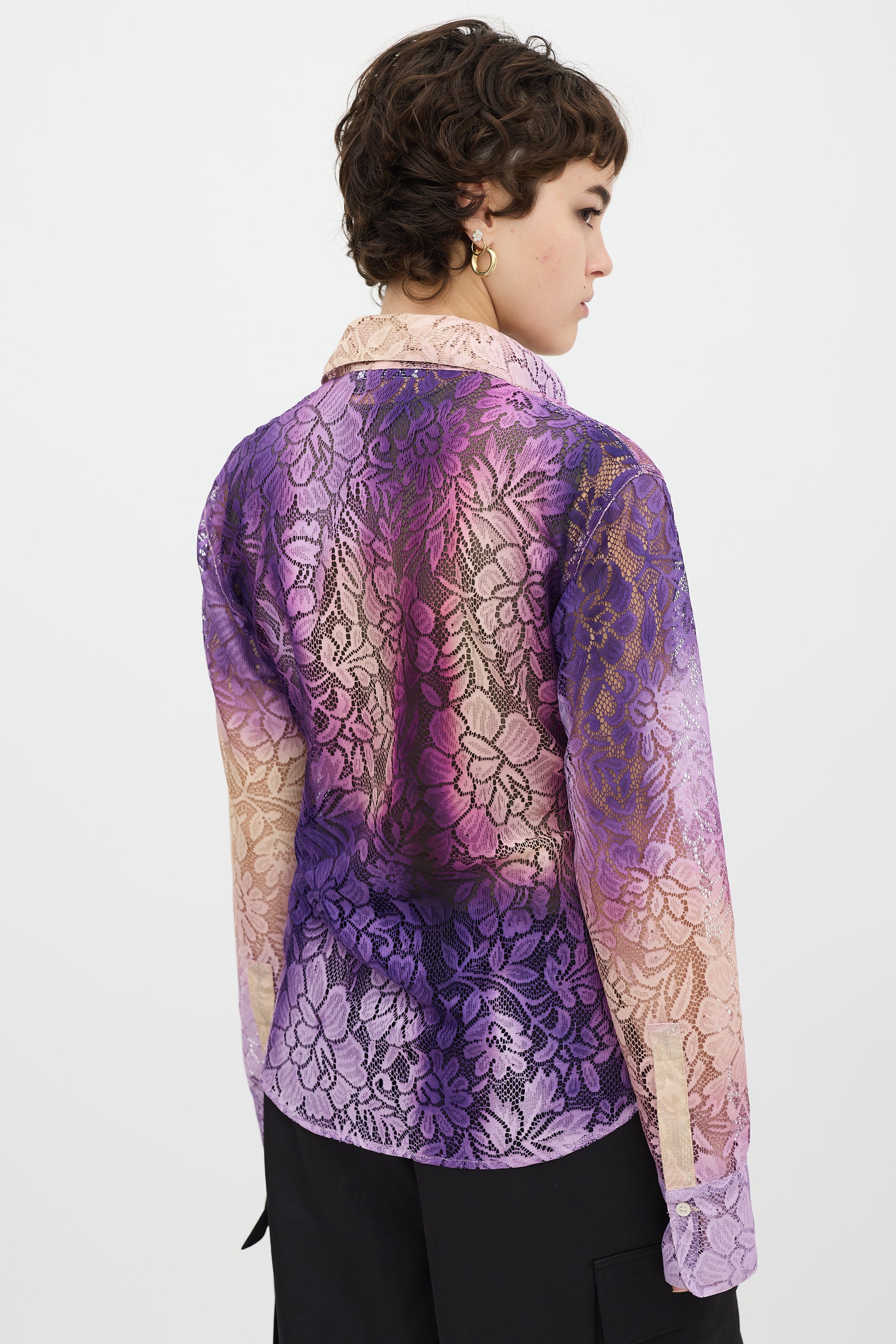 Pre-owned Acne Studios purple and beige floral lace shirt featuring a pointed collar, button up front, gradient dye throughout, curved hem, and long sleeves with buttoned cuffs.