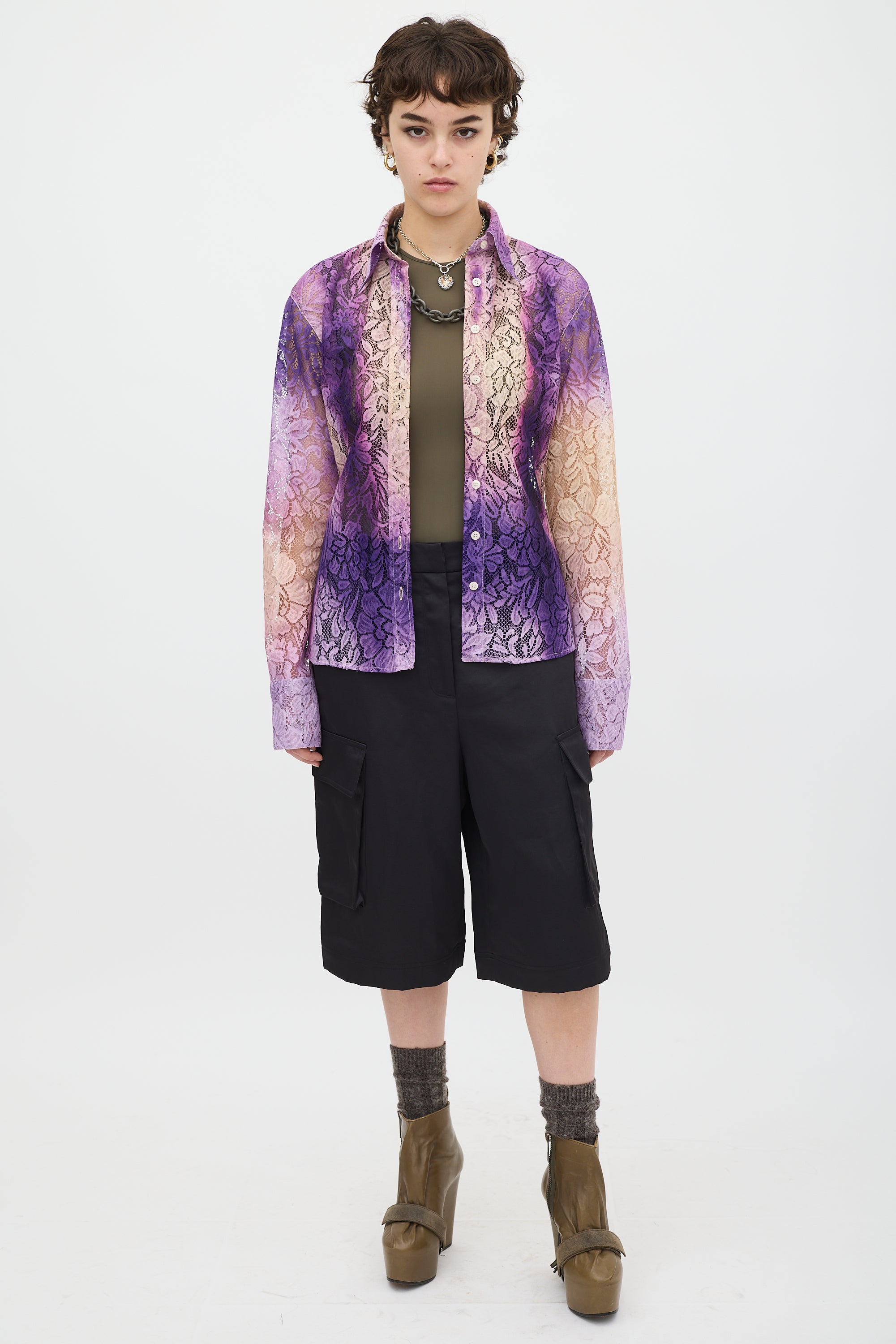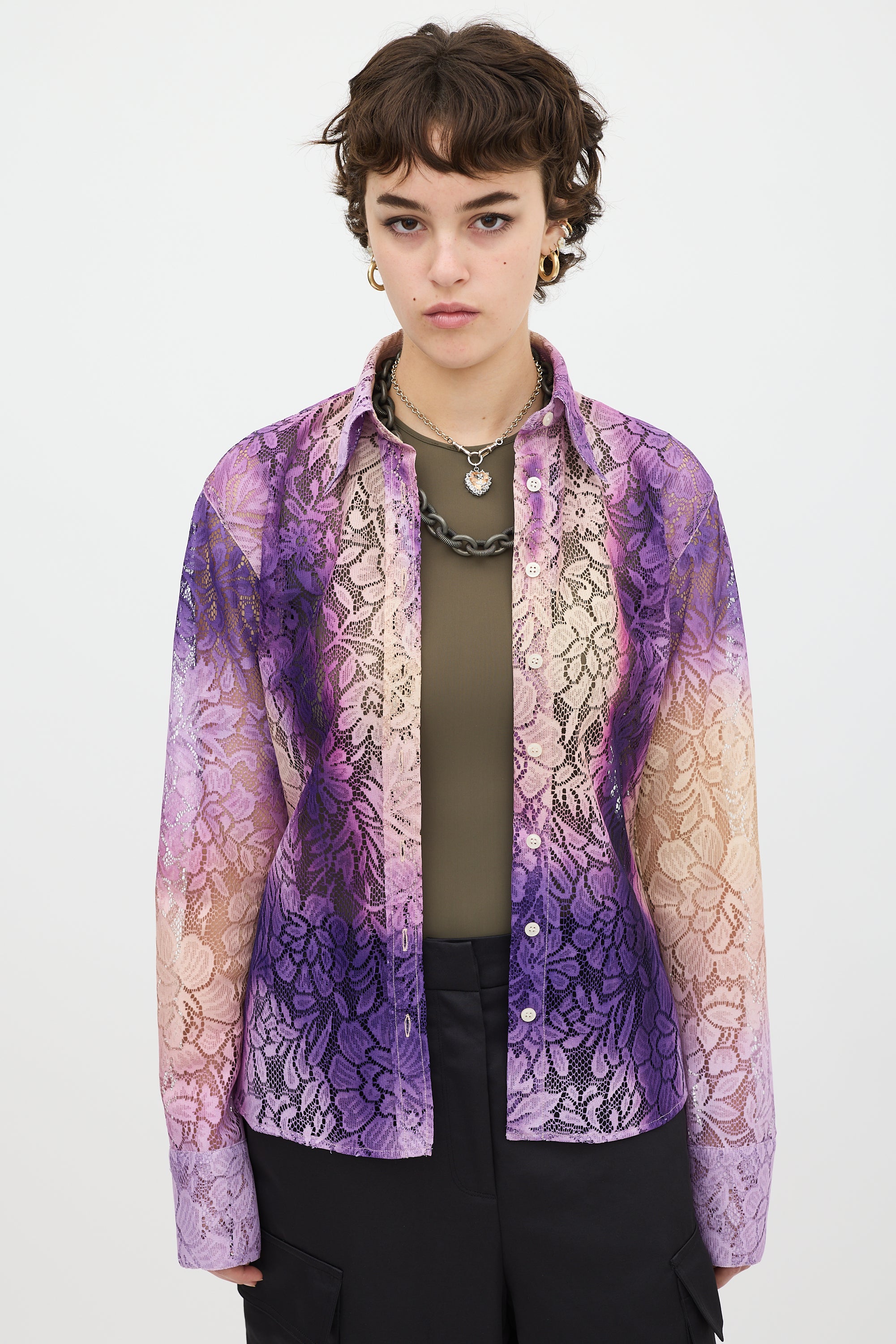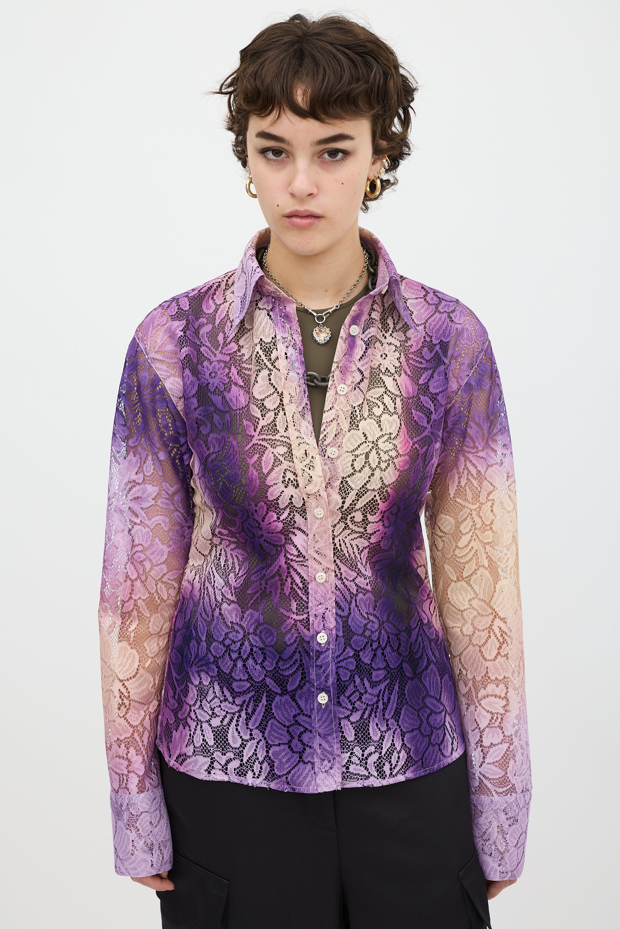Pre-owned Acne Studios purple and beige floral lace shirt featuring a pointed collar, button up front, gradient dye throughout, curved hem, and long sleeves with buttoned cuffs.