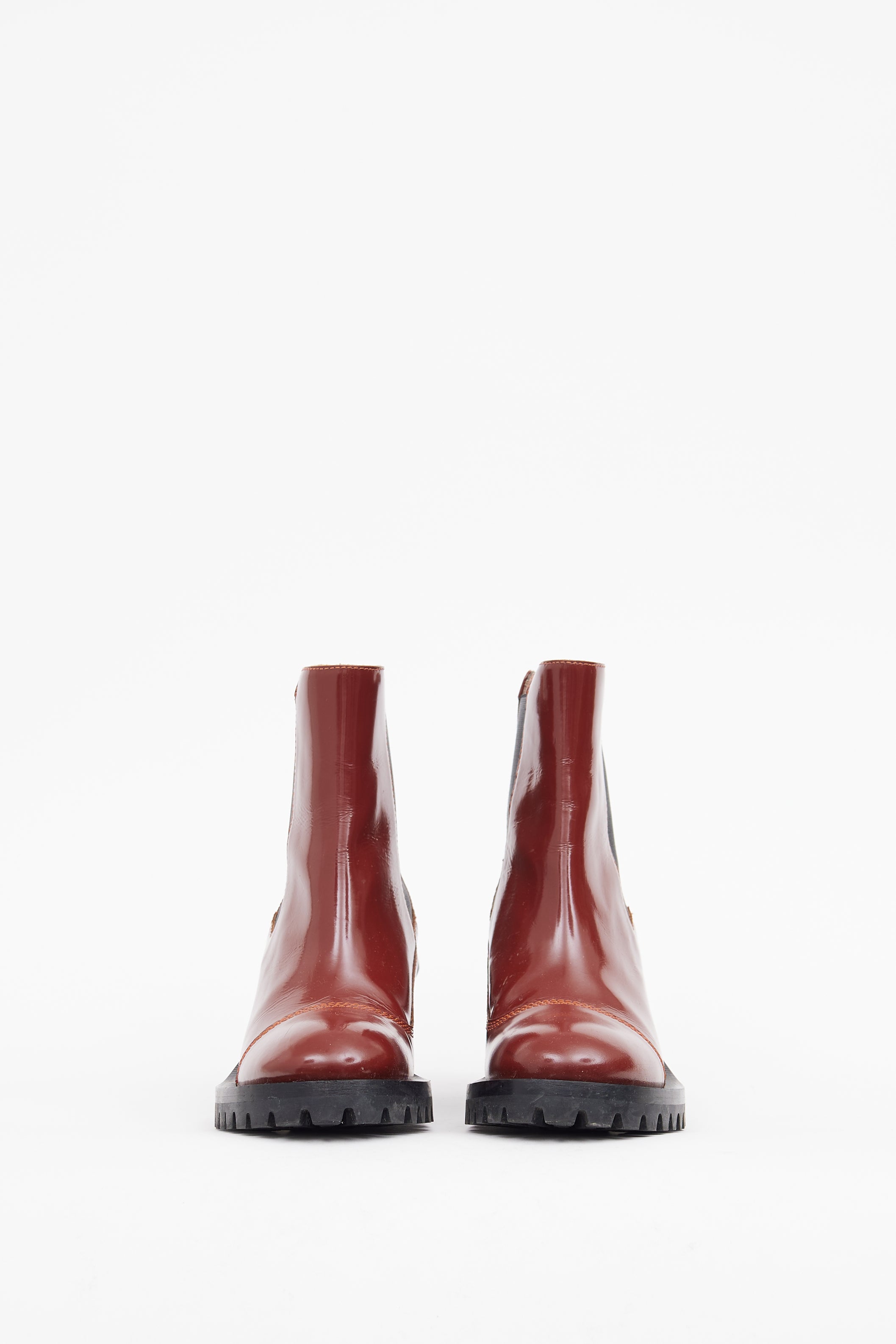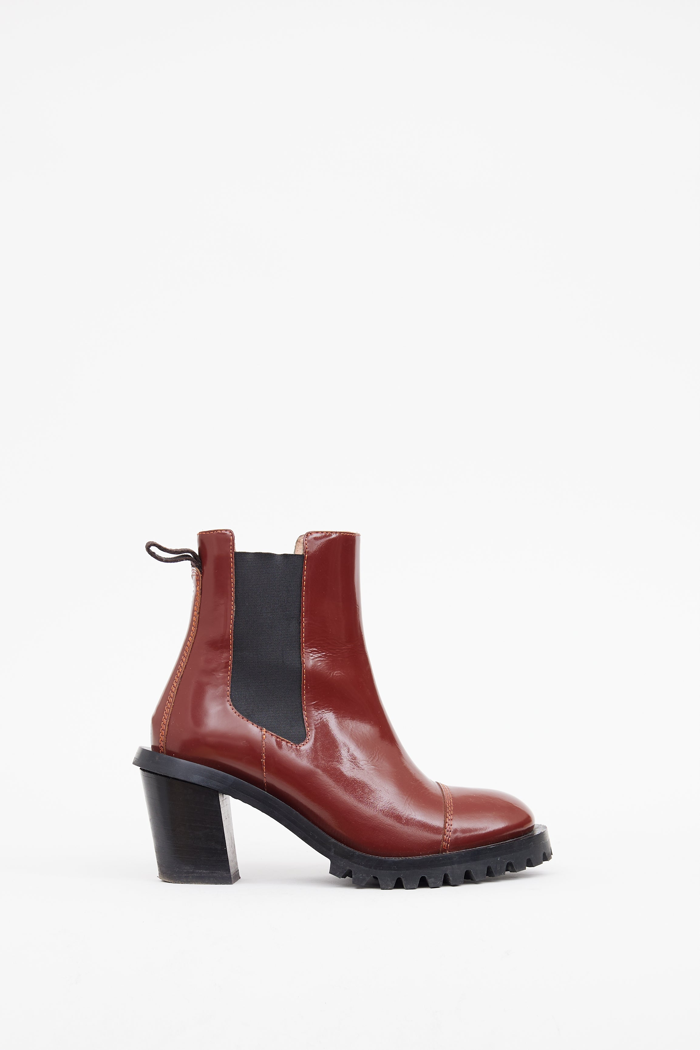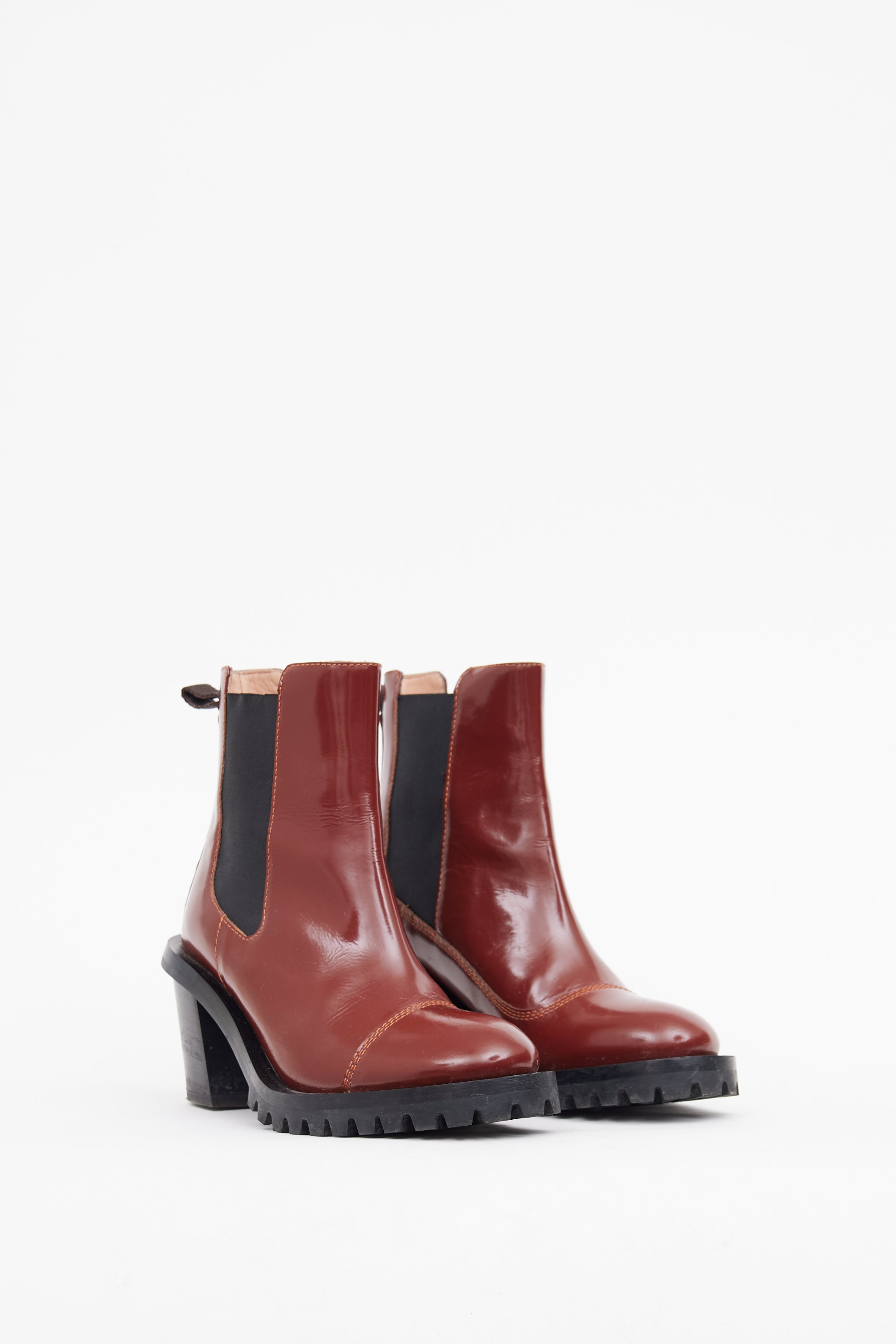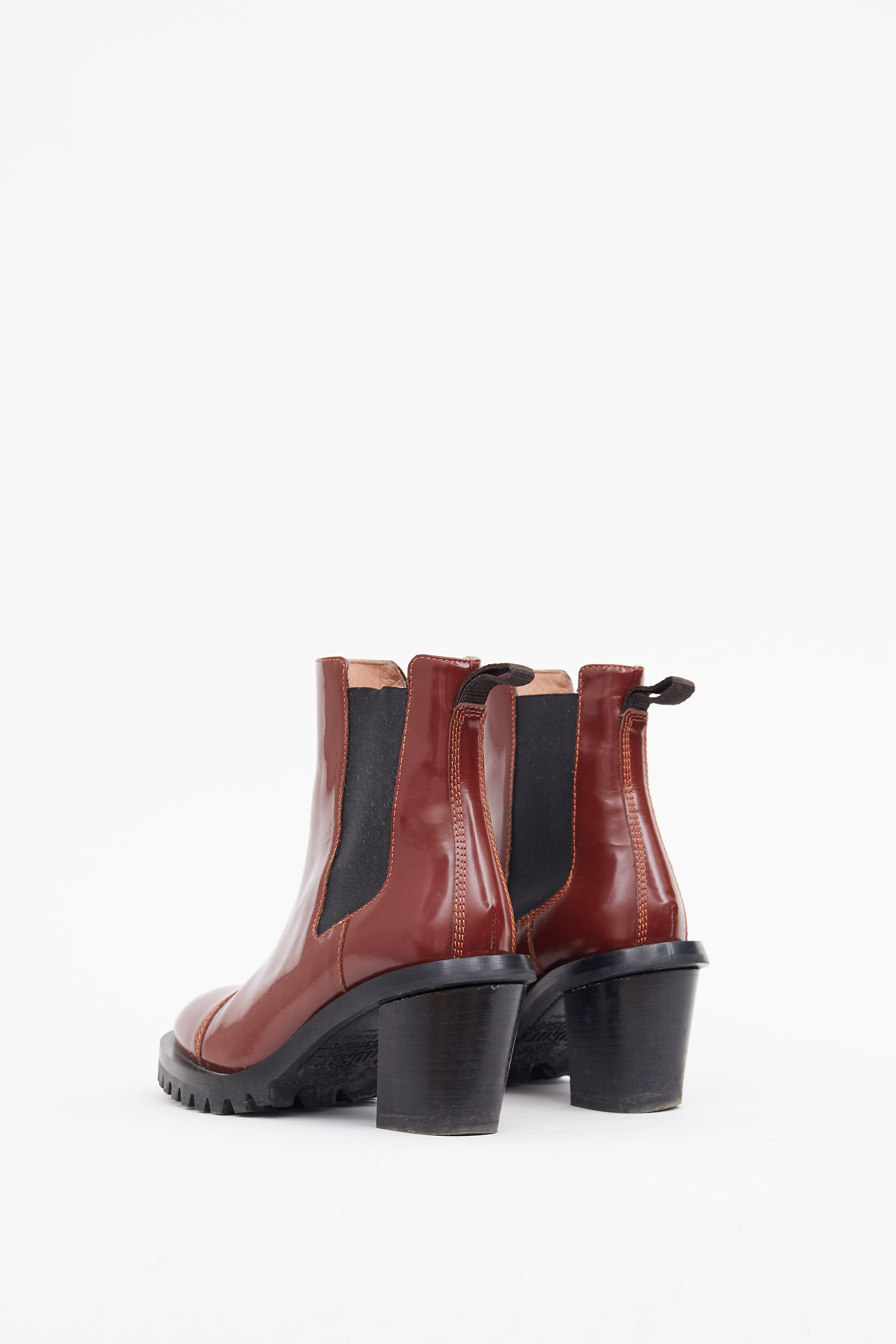 Pre-owned Acne Studios red Chelsea boot featuring round toe, treaded platform midsole, elastic side gussets, pull tab on counter and block heel.