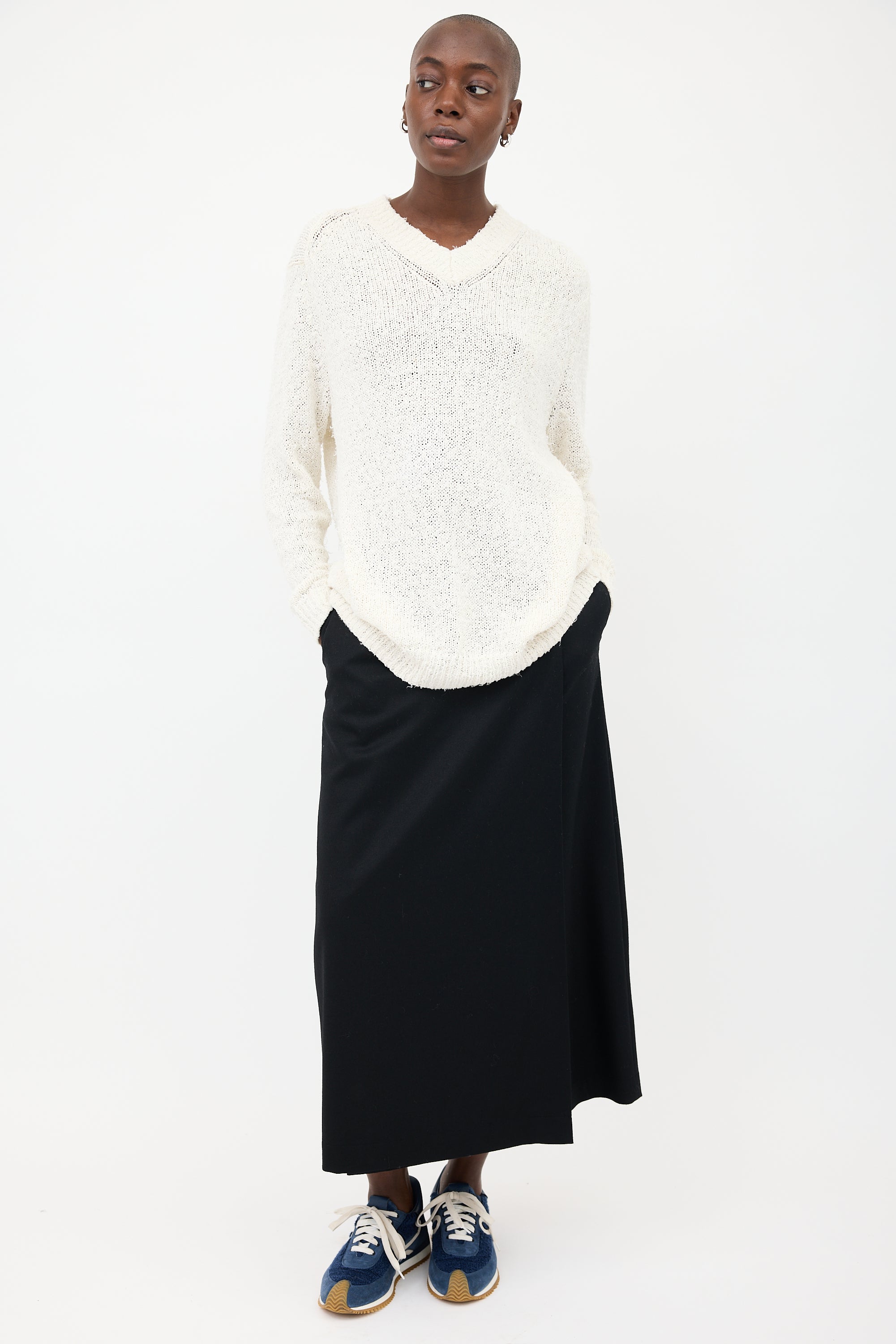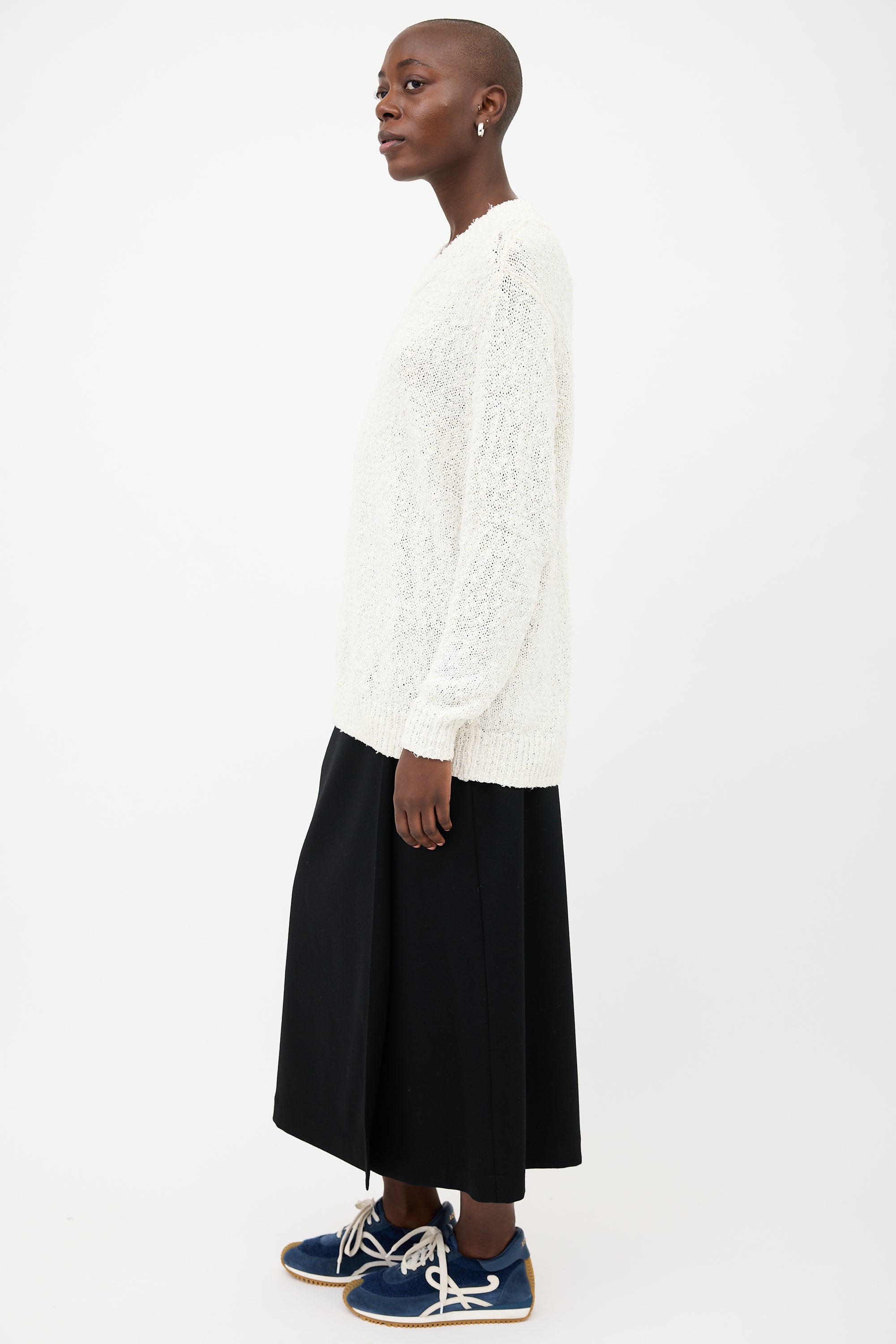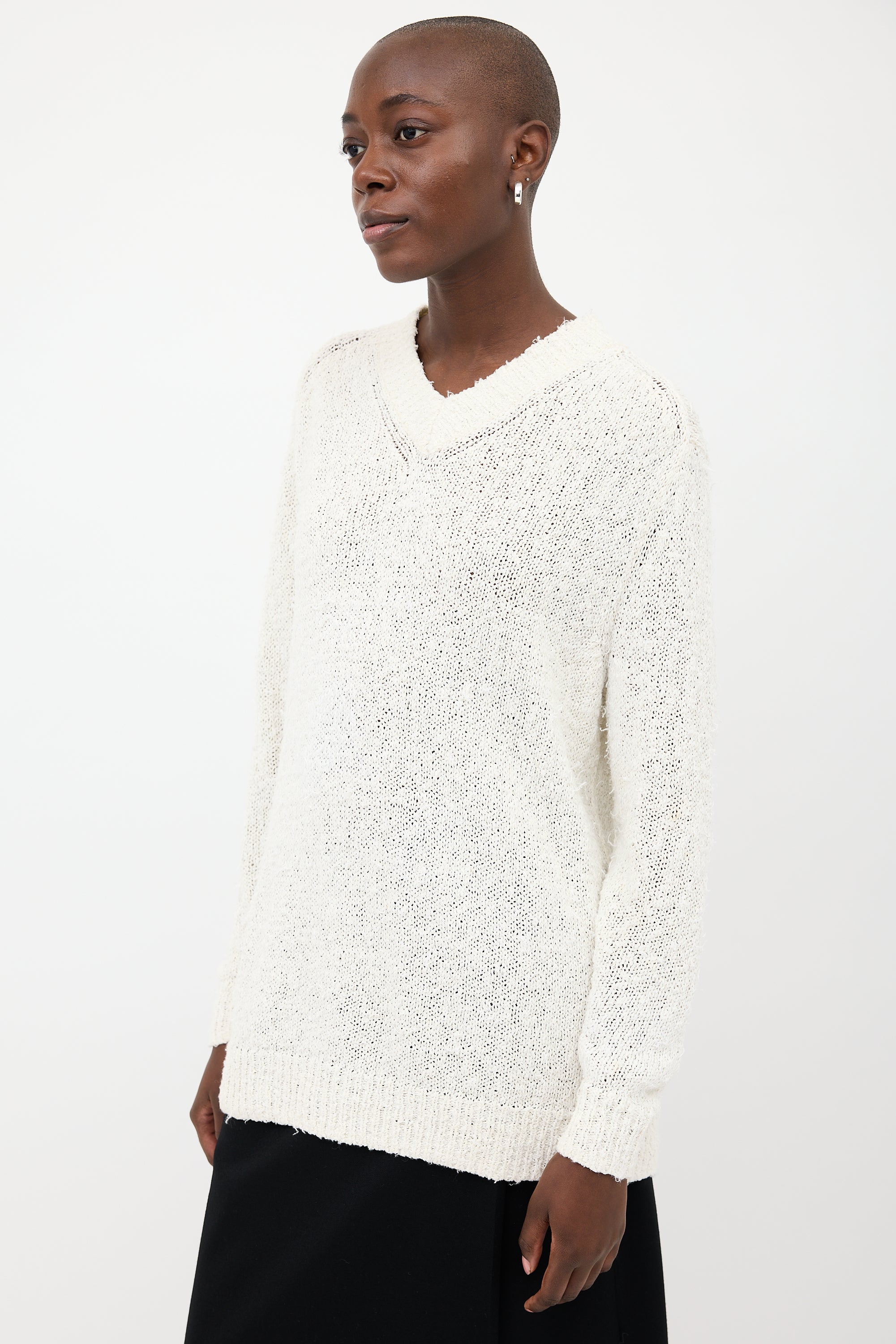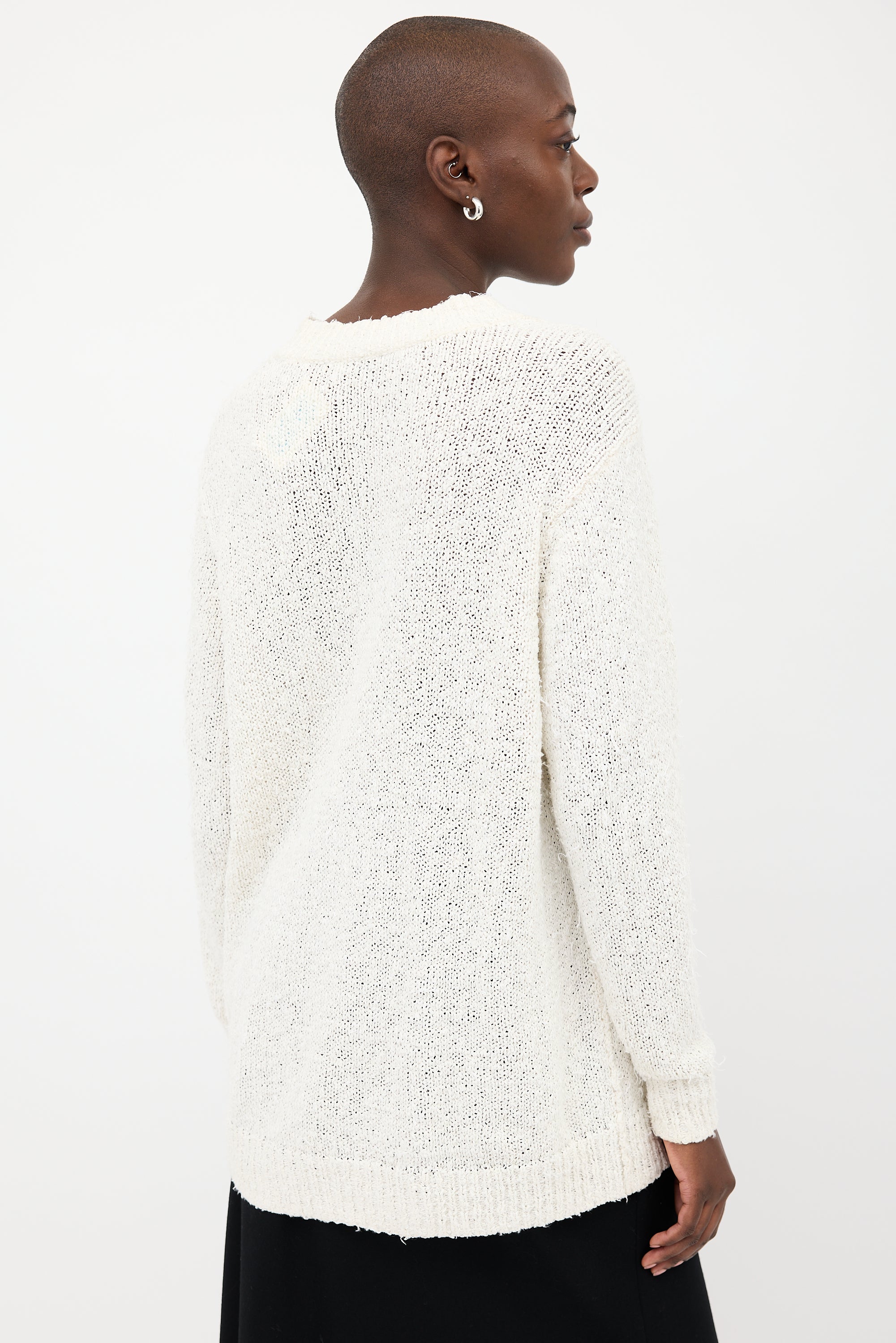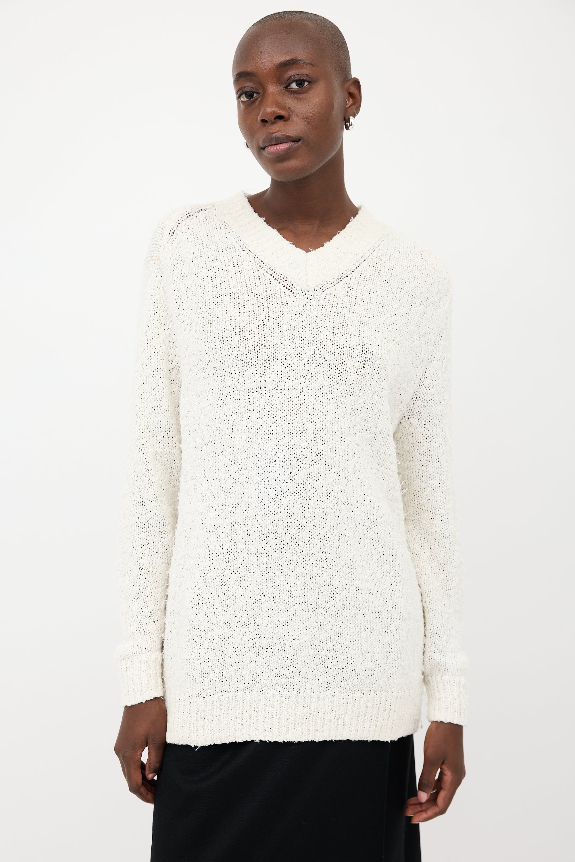 Pre-owned Acne Studios white textured cotton sweater featuring V-neckline, drop shoulders, and ribbed hem.