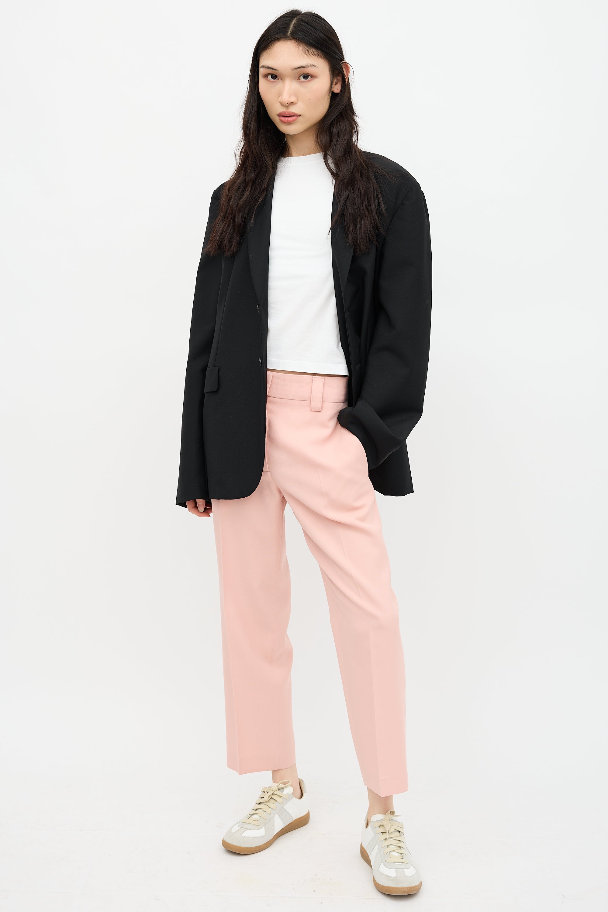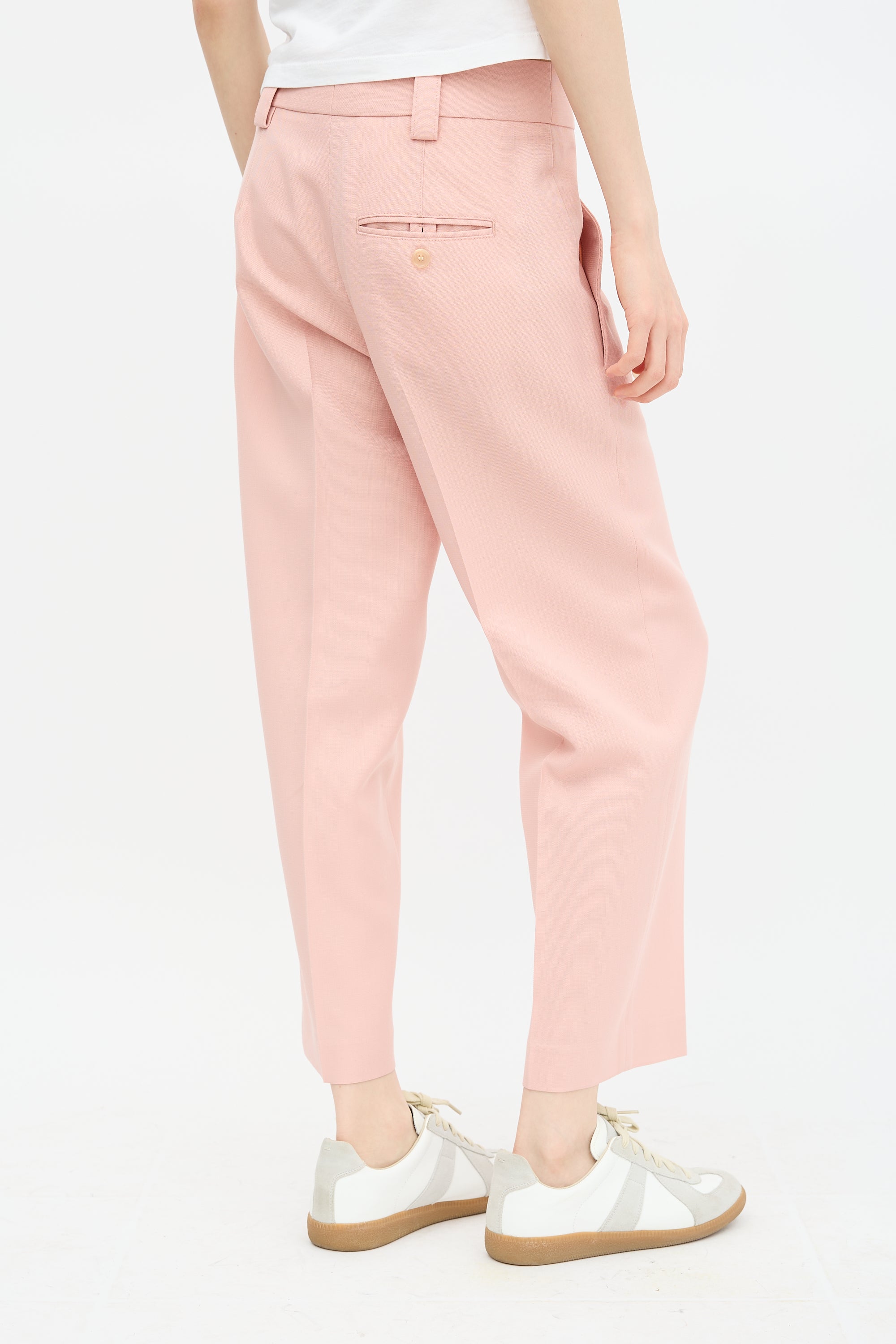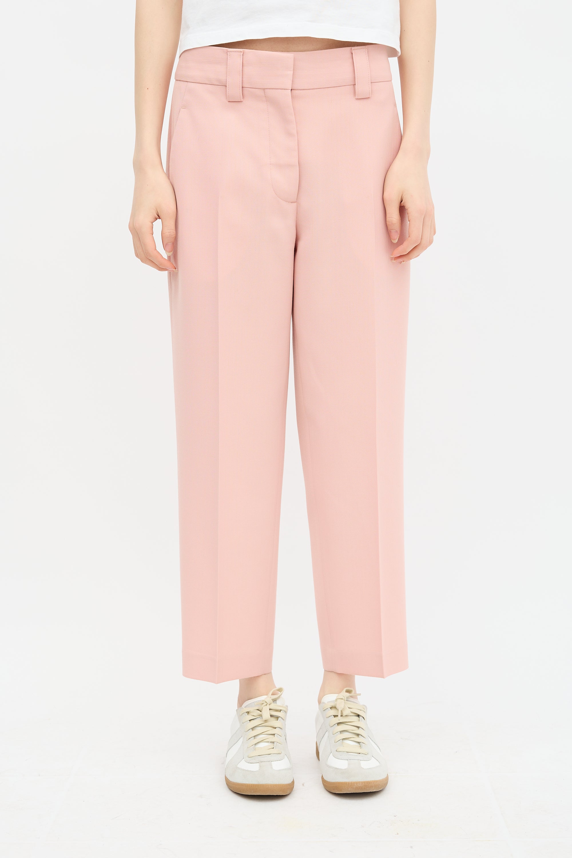 Pre-owned Acne Studios pink wool blend trousers featuring high rise, zip fly, three pocket styling, and straight leg. Unlined.