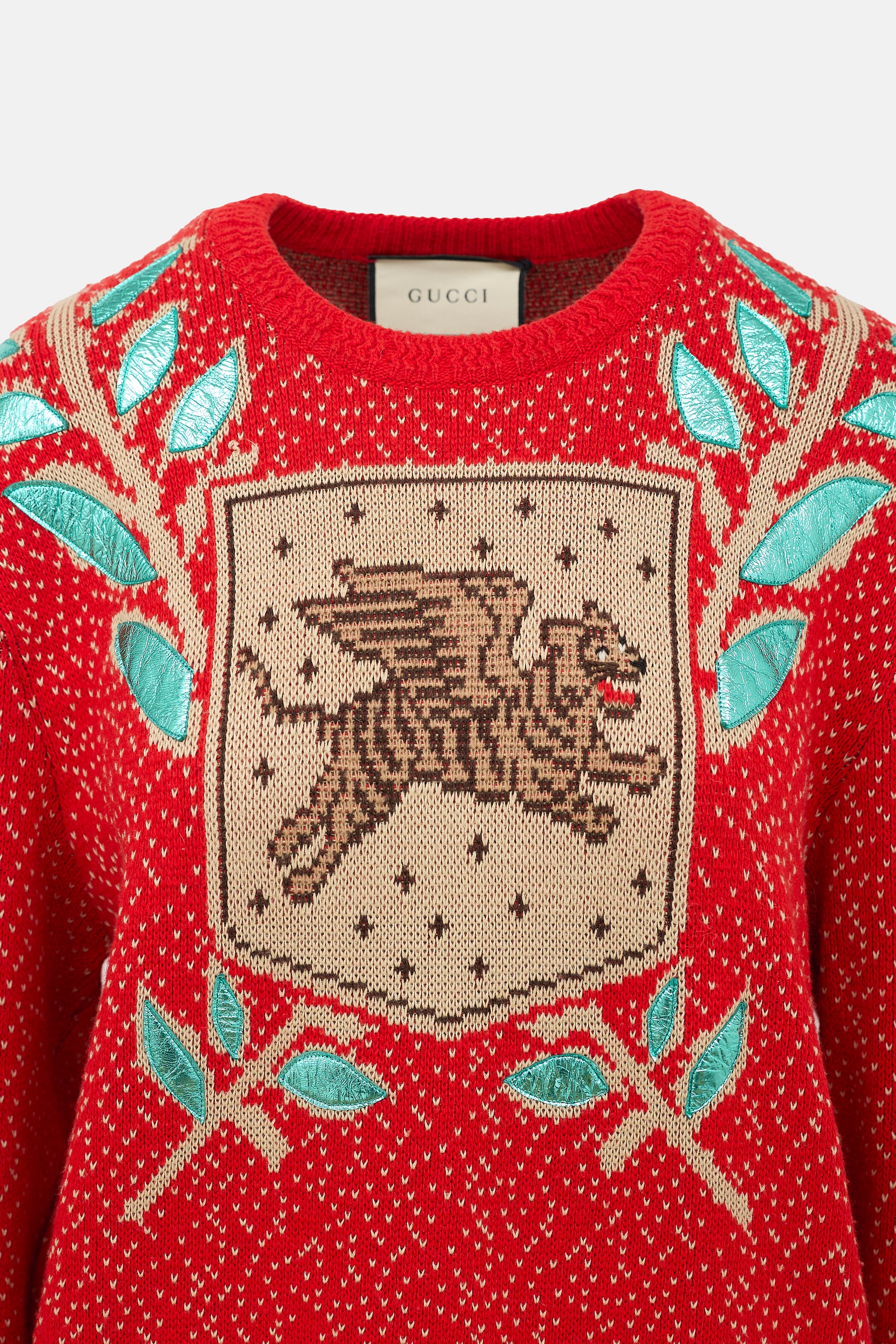 Gucci 2017 red knit sweater featuring Flying Tiger intarsia, crew neckline, metallic leaf patches, and beige speckle motif.