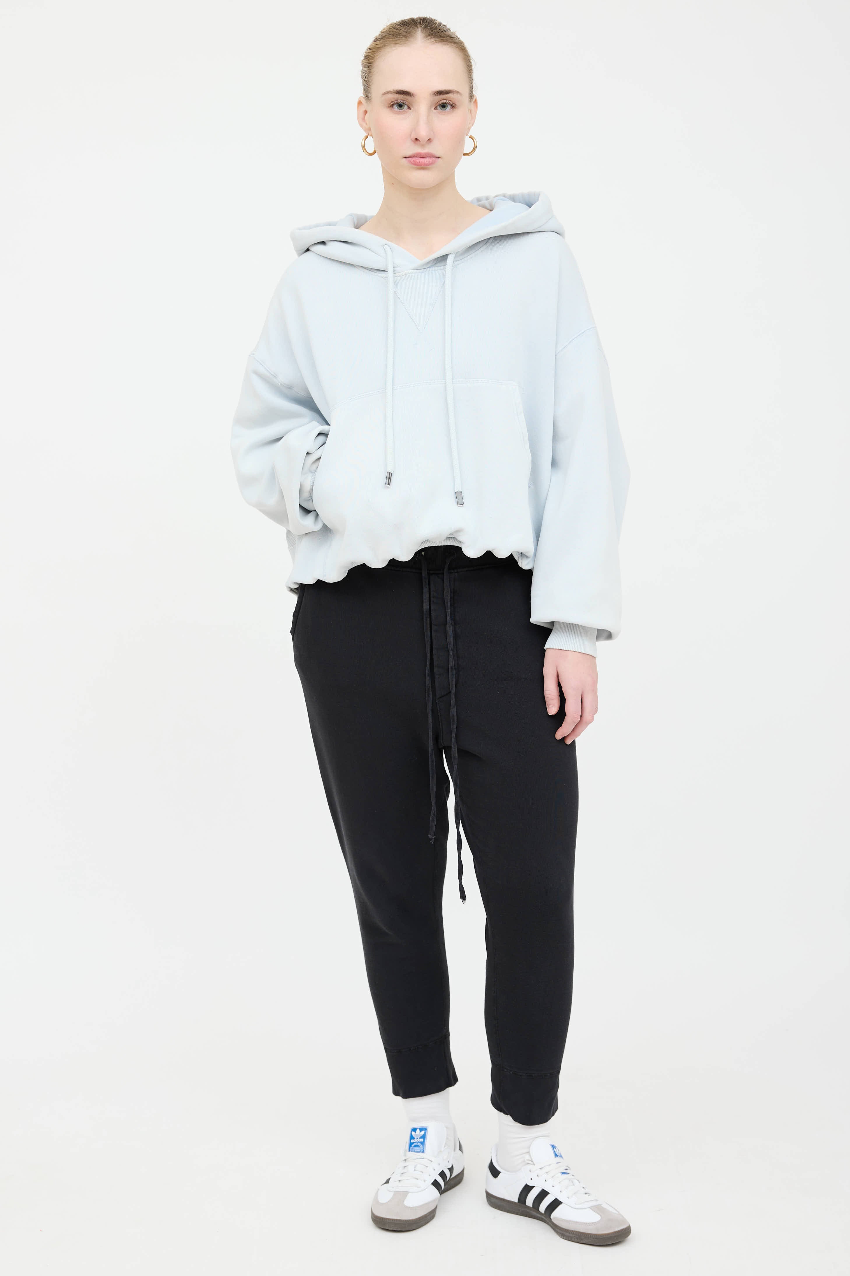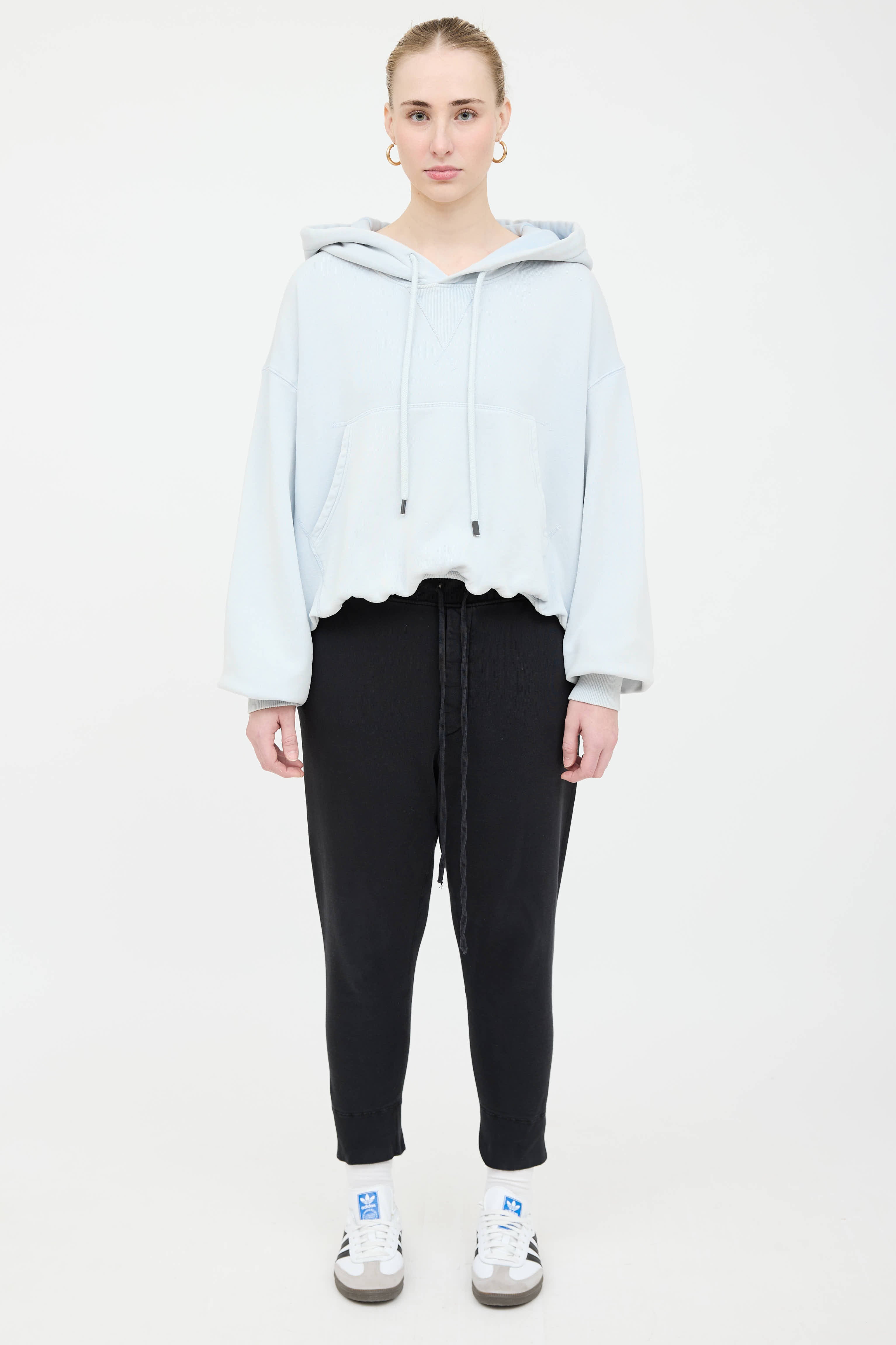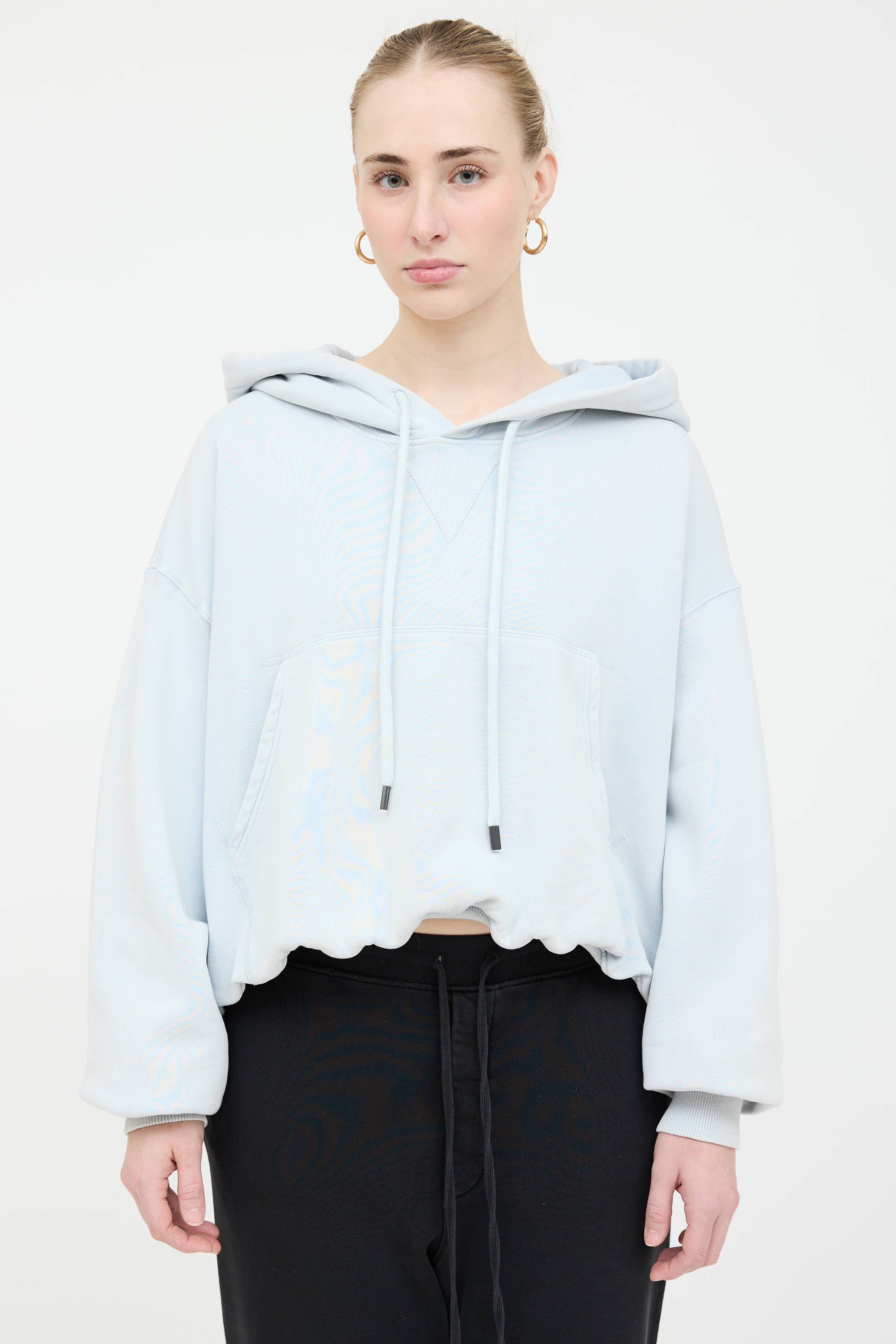 Pre-owned R13 blue long sleeve hoodie featuring drawstring hoodie, kangaroo pocket, bubble hem, dropped shoulders, and ribbed trims.
