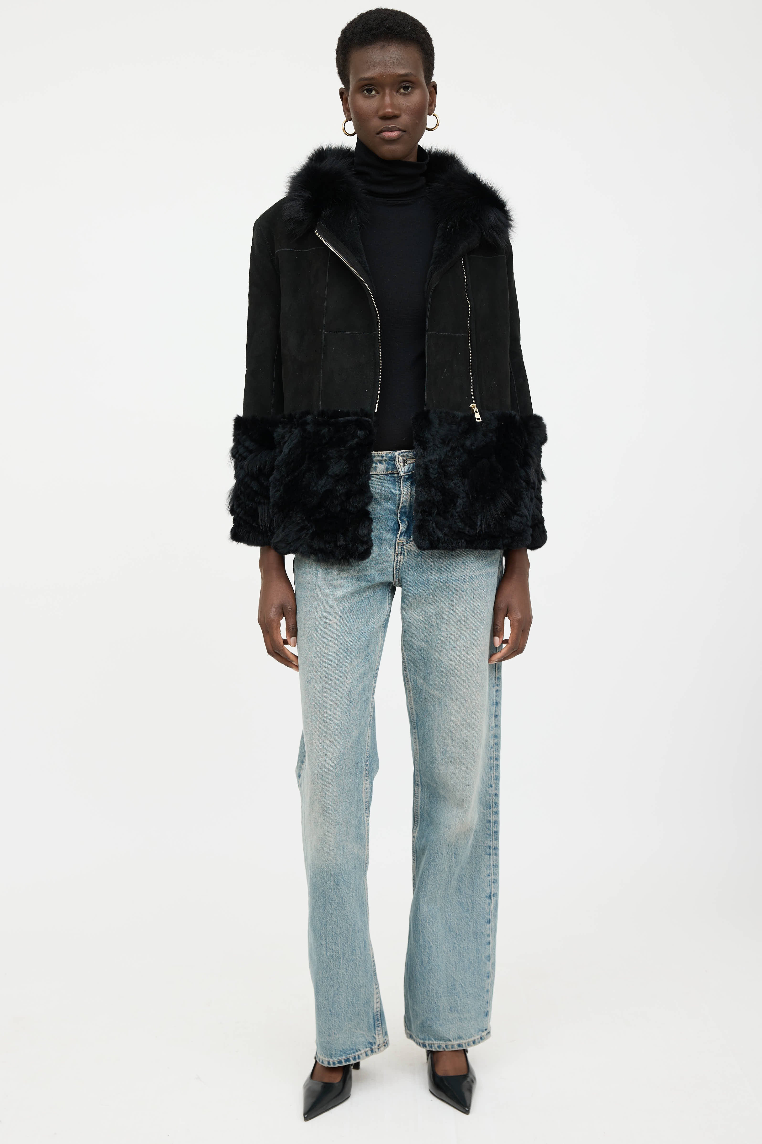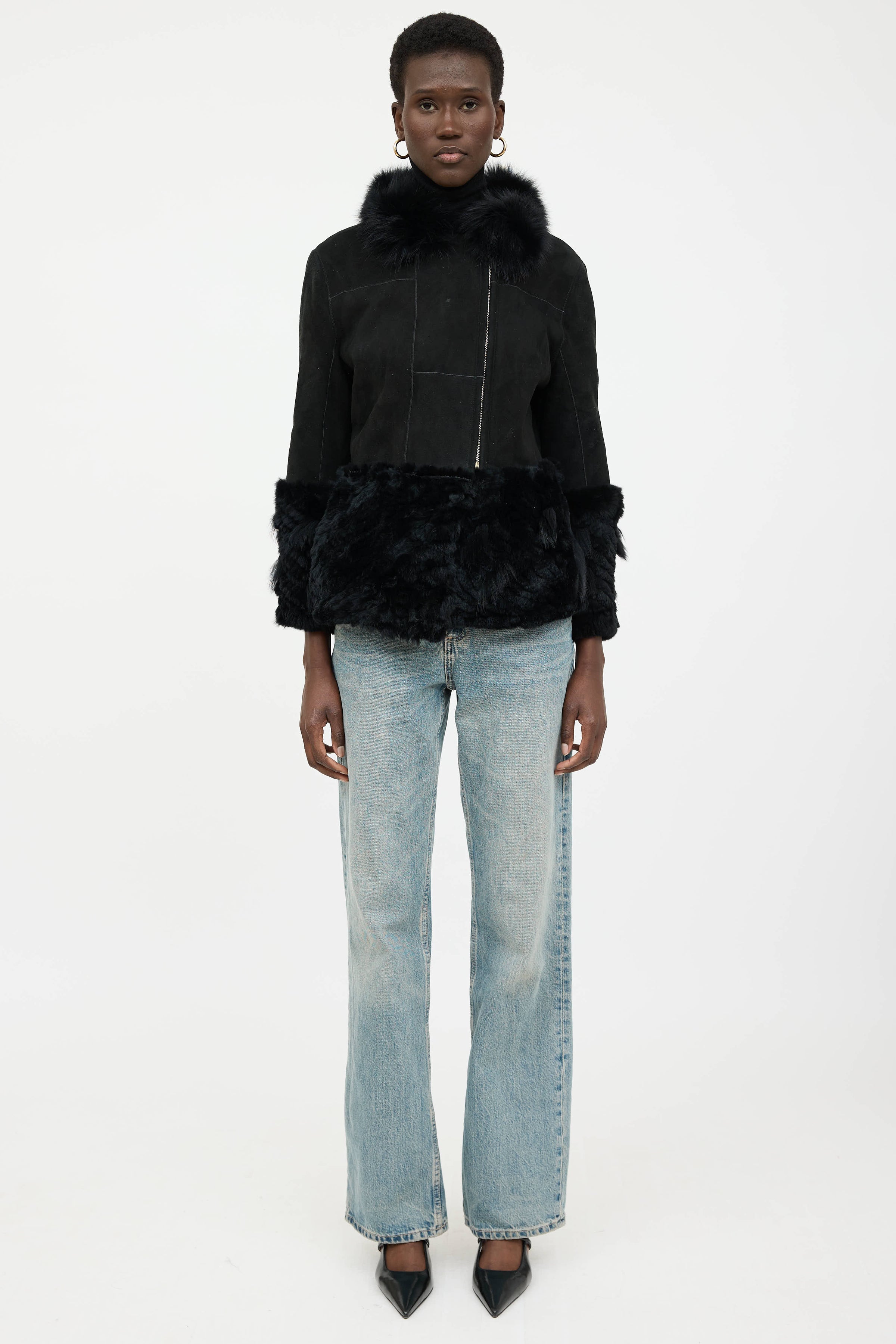 Pre-owned Blue Duck black suede jacket featuring fur collar, zip front, rabbit fur hem and cuffs, and shearling lined.