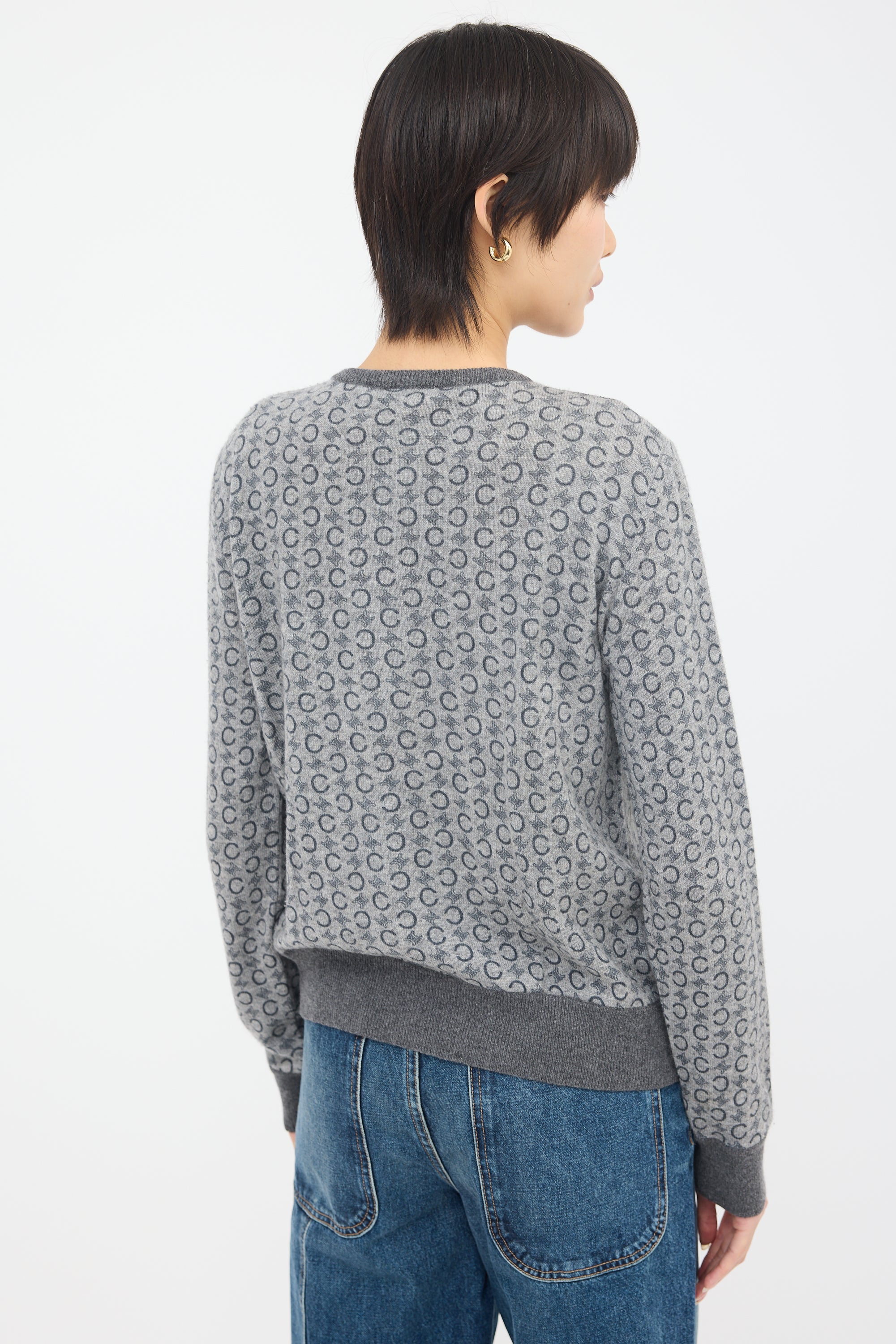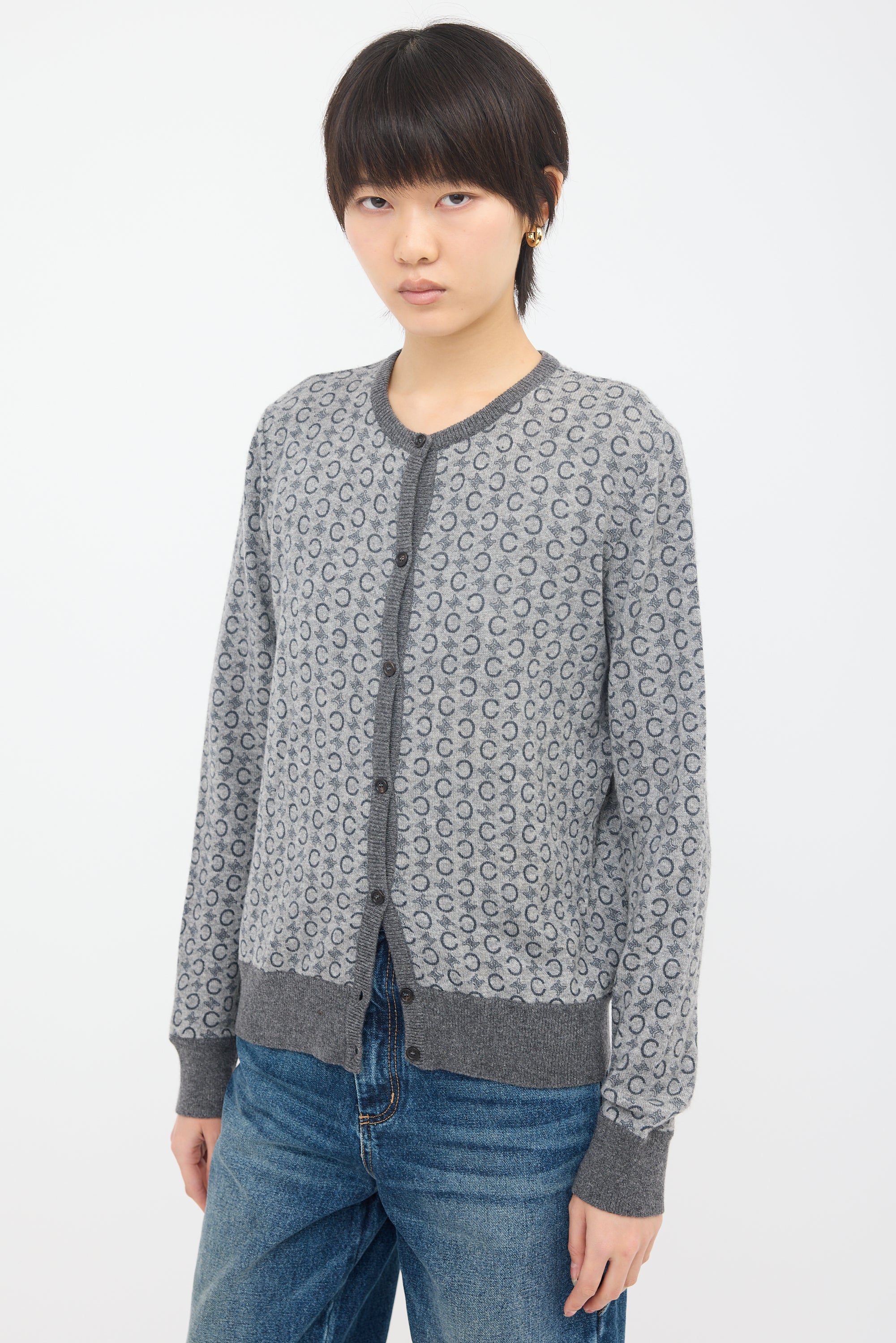 Pre-owned Celine vintage grey cardigan featuring a tonal Triomphe and "C" motif pattern, round neckline, button front, and ribbed trim.