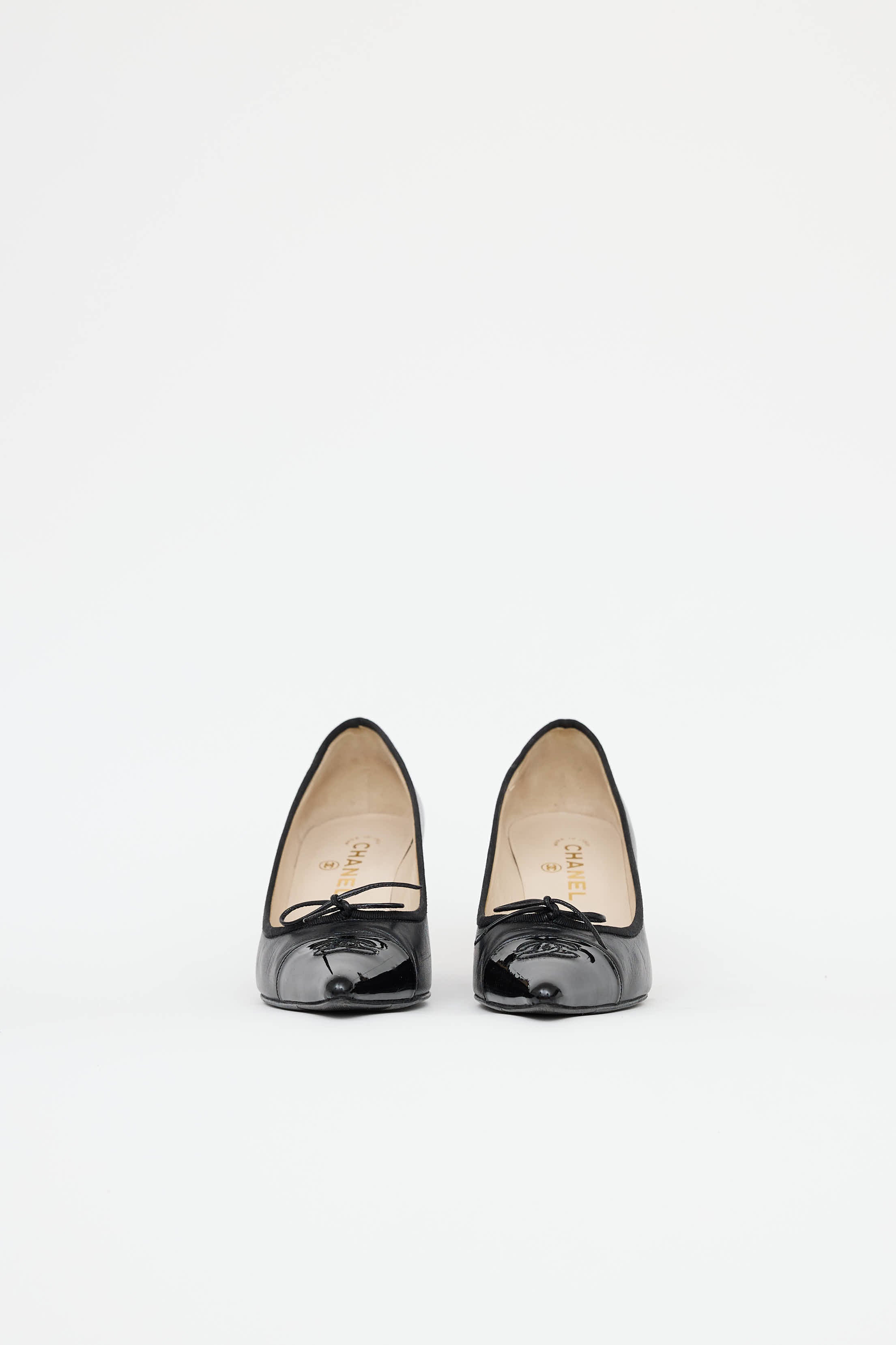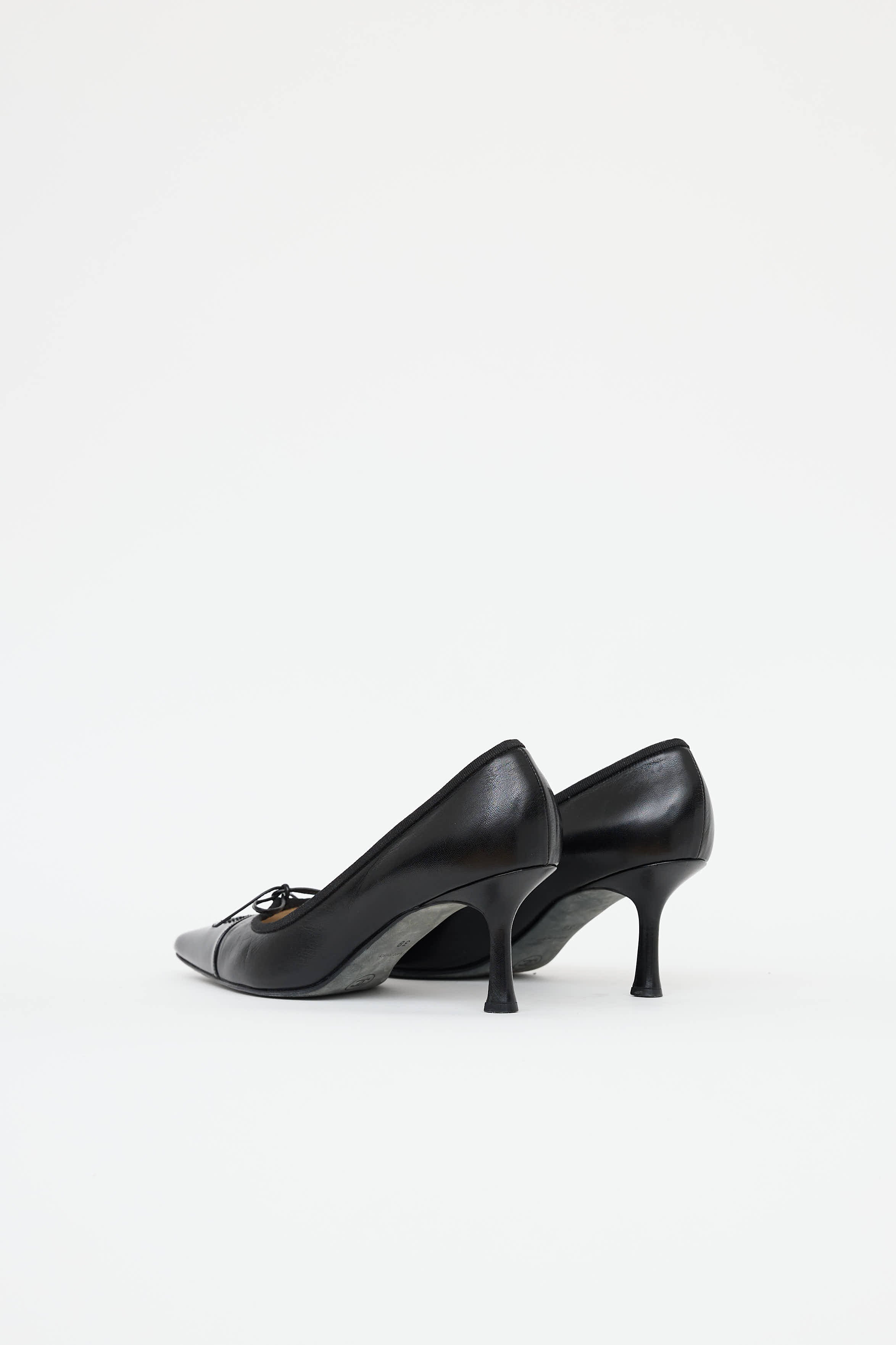 Pre-owned Chanel vintage black leather CC pumps featuring a pointed toe, patent leather toe box with stitched interlocking CC logo, bow at collar, and covered heel.