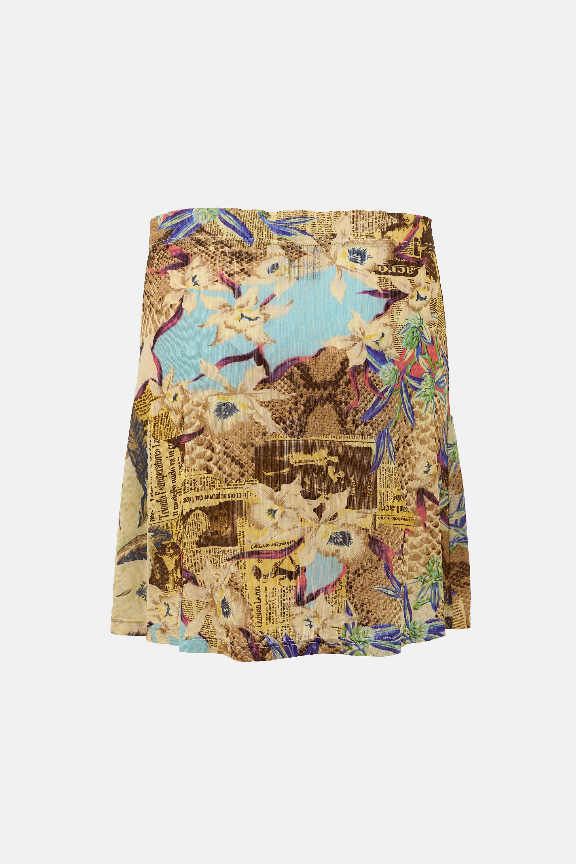 Pre-owned Bazar de Christian Lacroix 1990s multicolour mini skirt featuring allover graphic snakeskin, floral, and newspaper print, elasticized waistband, and A-line silhouette. Unlined.