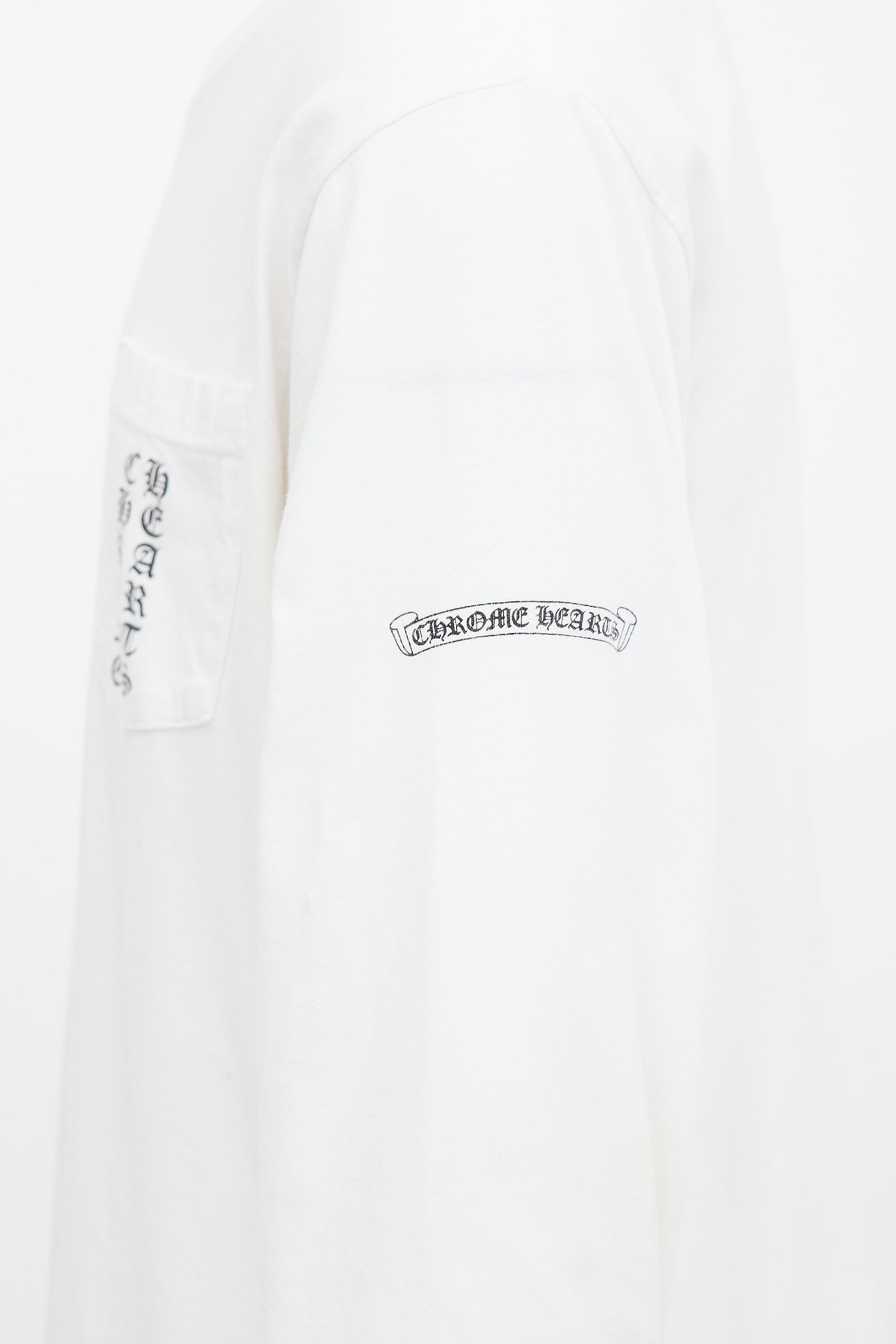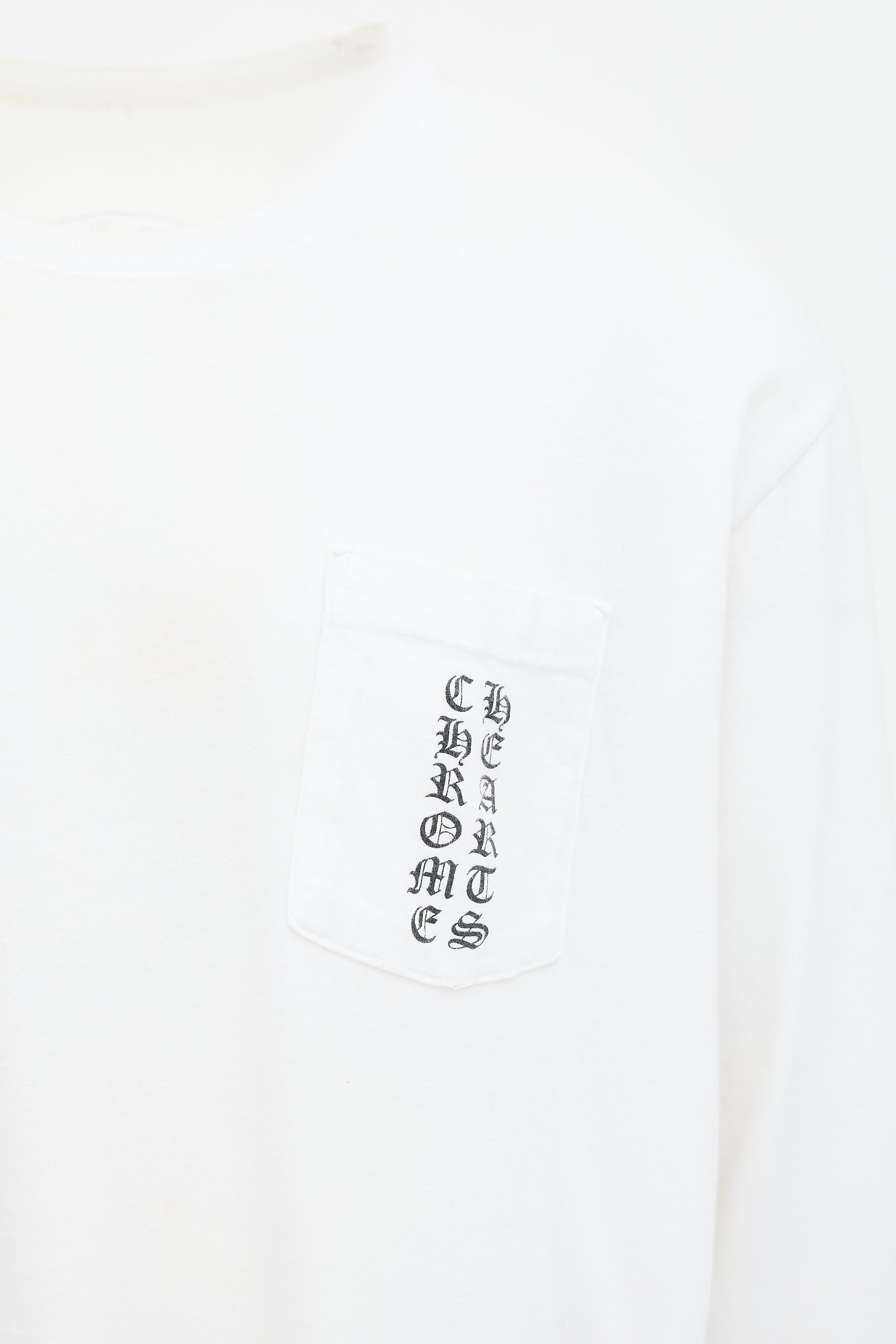 Pre-owned Chrome Hearts white T-shirt featuring crew neckline, chest pocket, and logo at chest, back, left sleeve, and right hip.