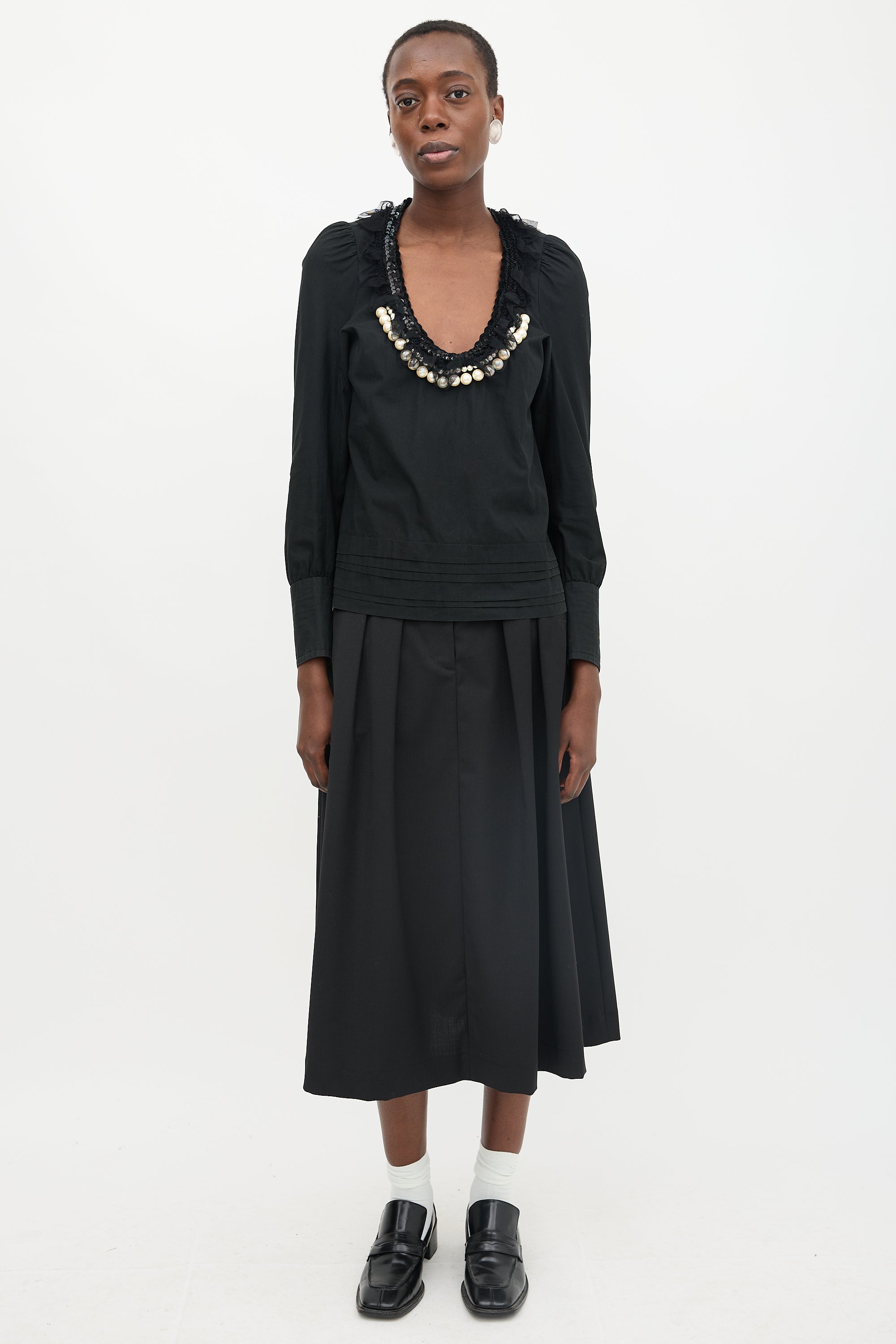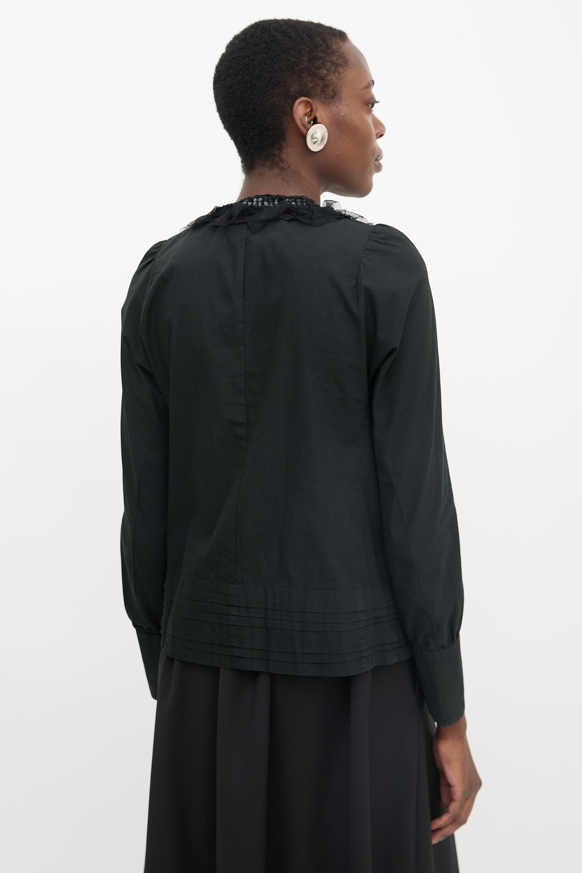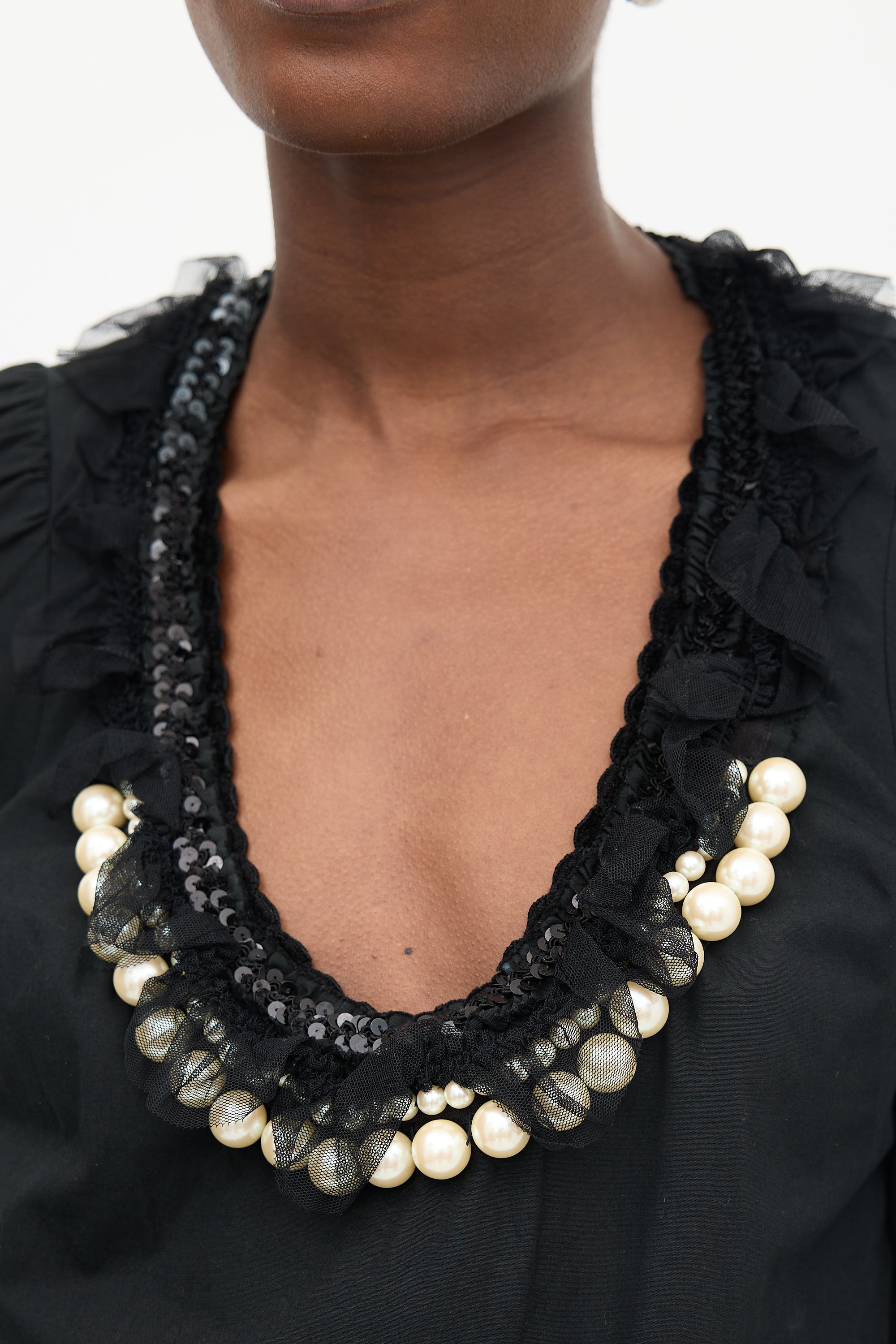 Pre-owned Comme des Garçons Tricot Fall/Winter 2006 black poplin blouse featuring scoop neckline, tulle, sequin, and pearl embellishment, pleated hem, puff sleeves, and flip cuffs.