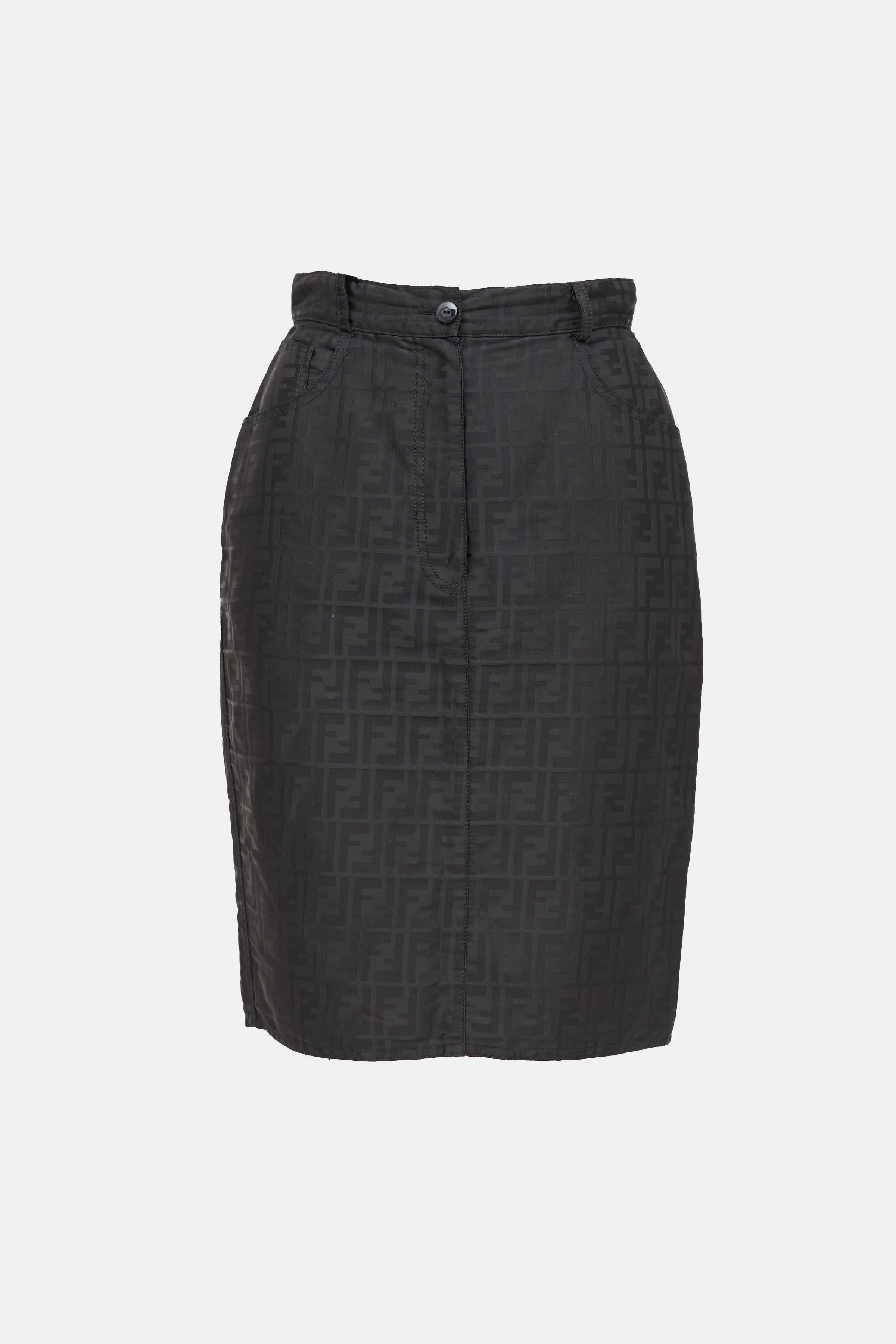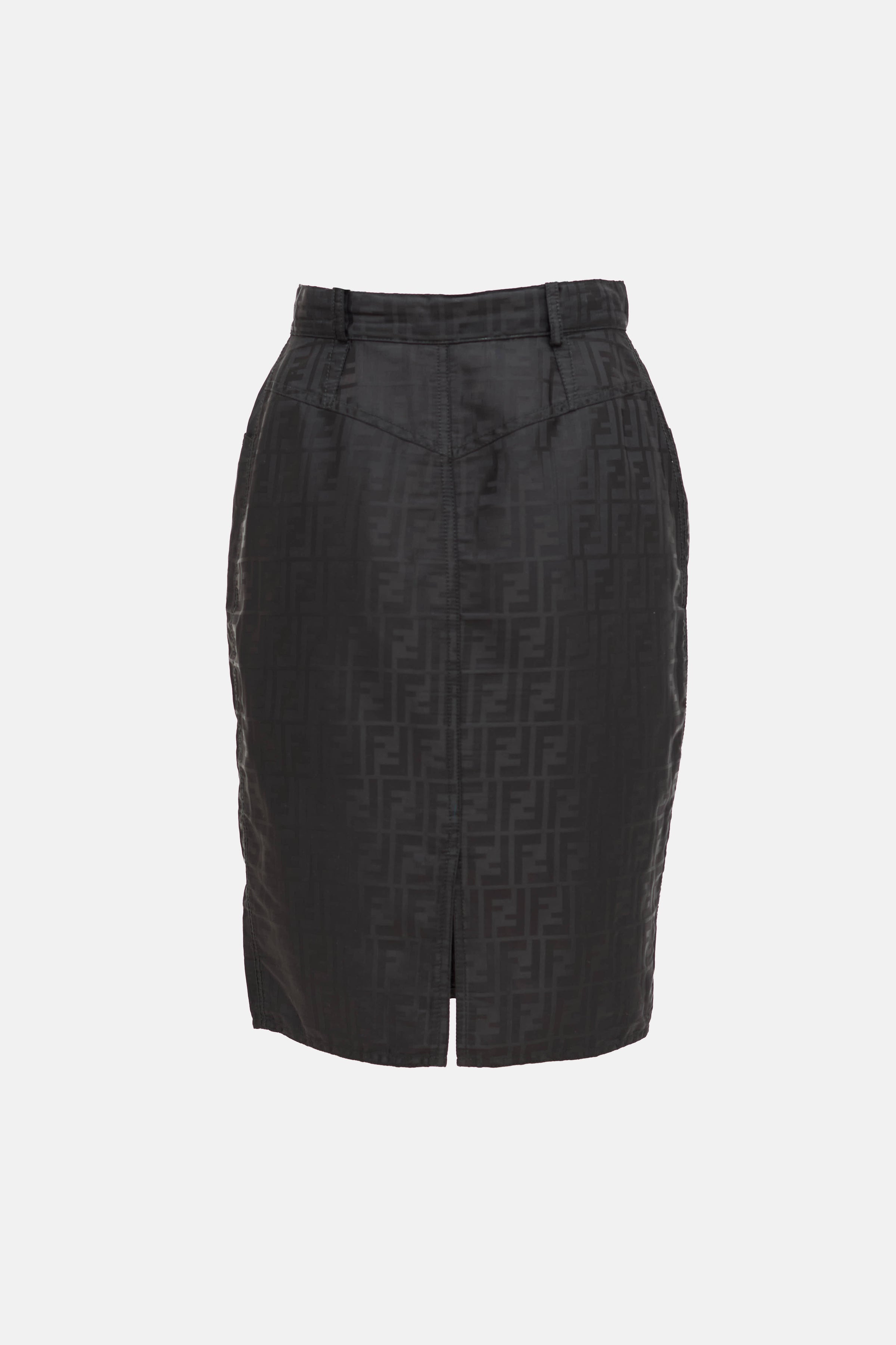 Pre-owned Fendi black nylon pencil skirt featuring a tonal ff Zucca monogram throughout, three pocket styling, slit at hem, and zip fly with button closure.