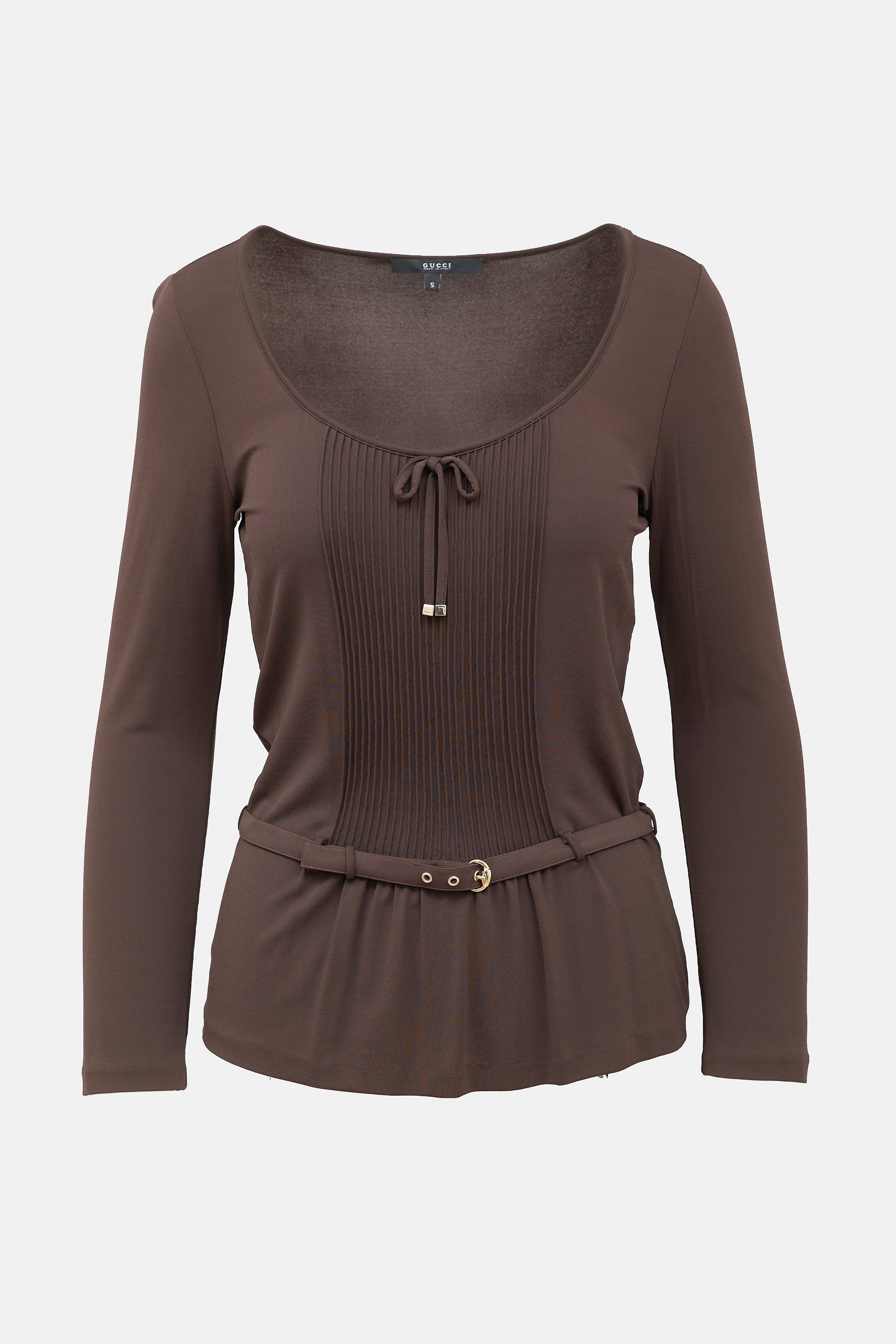 Pre-owned Gucci 2006 brown viscose jersey top featuring a scoop neck, bow at chest with gold tone hardware, pleated front, adjustable belt at drop waist, and flared hem. Frida Giannini era design.