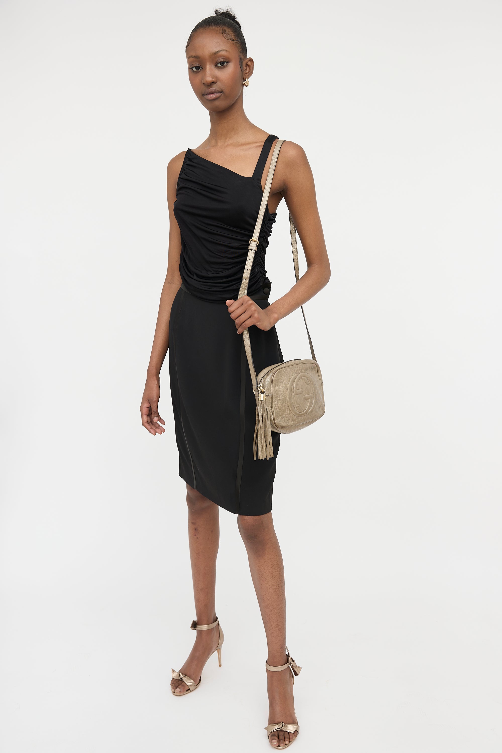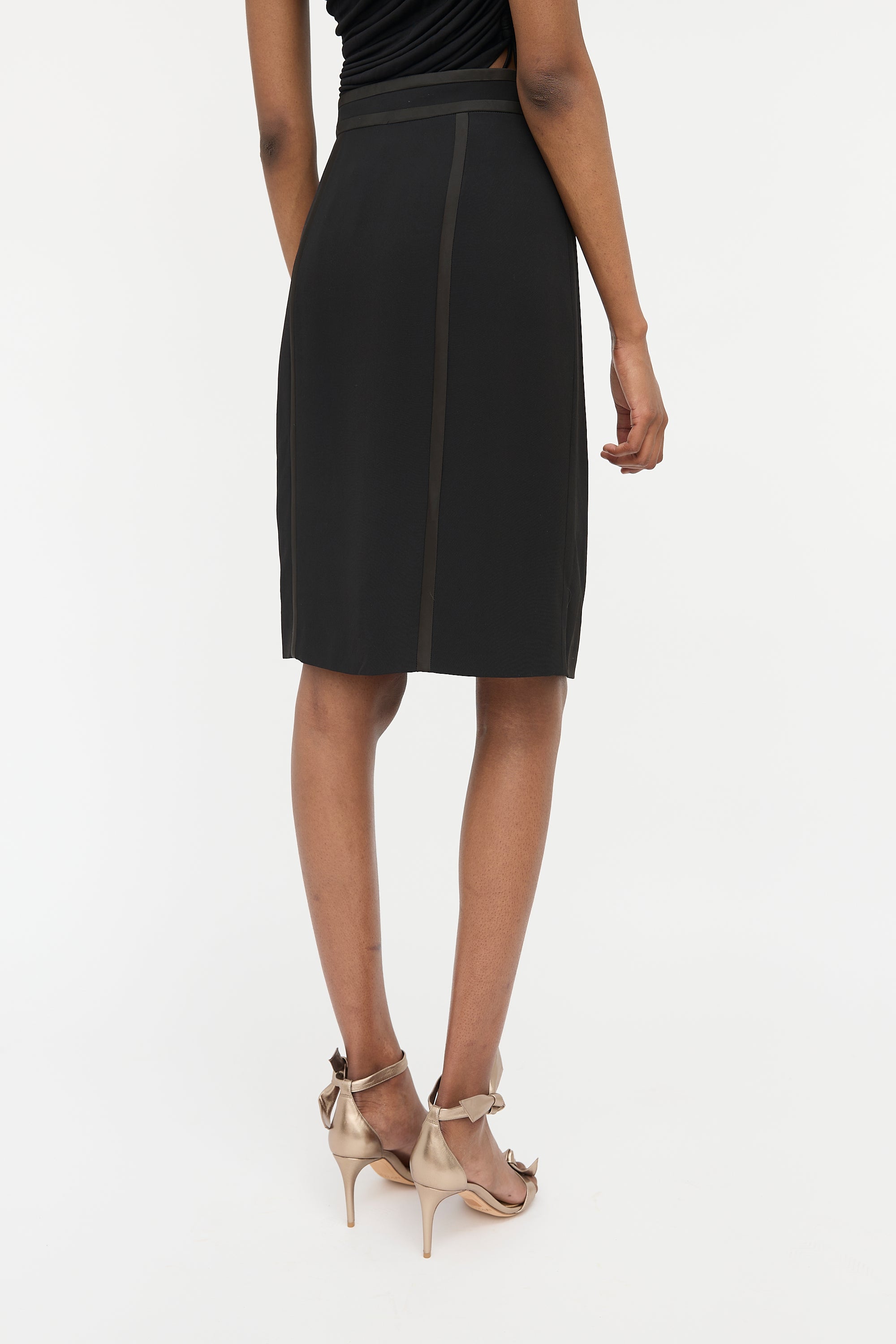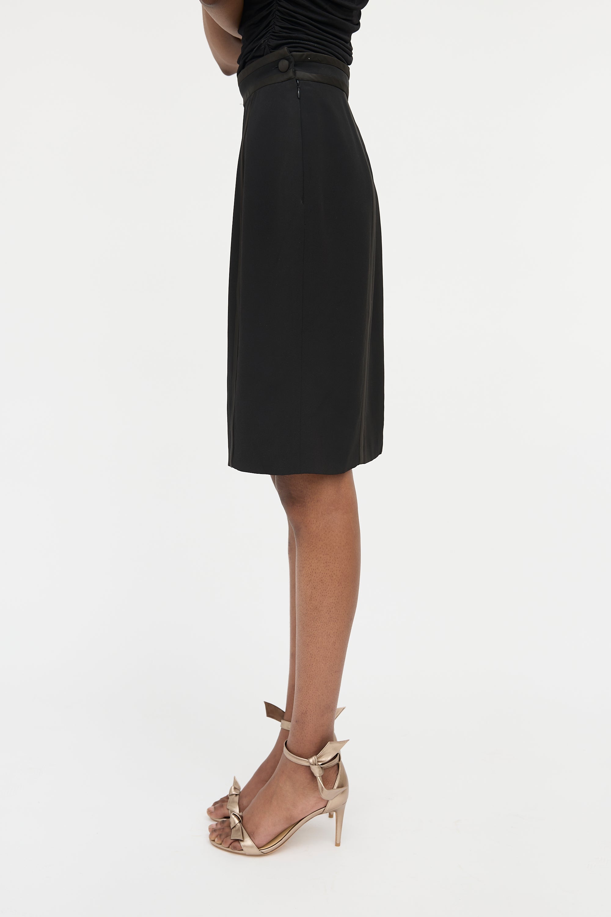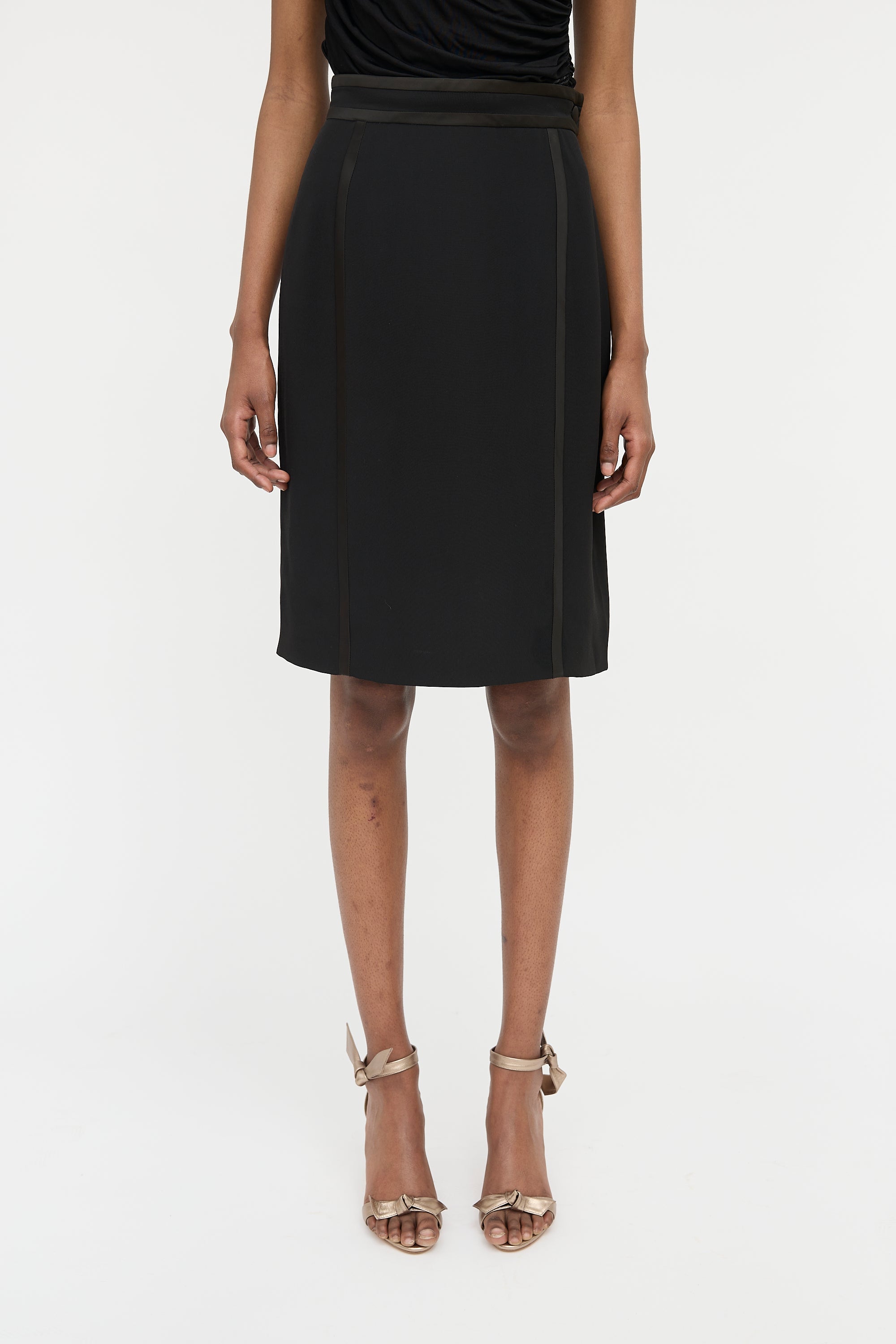 Pre-owned Gucci vintage black silk blend midi skirt featuring high waist, tonal satin tuxedo stripe trim, and concealed side zip. Lined. Clipped to fit model. c. 1990s.