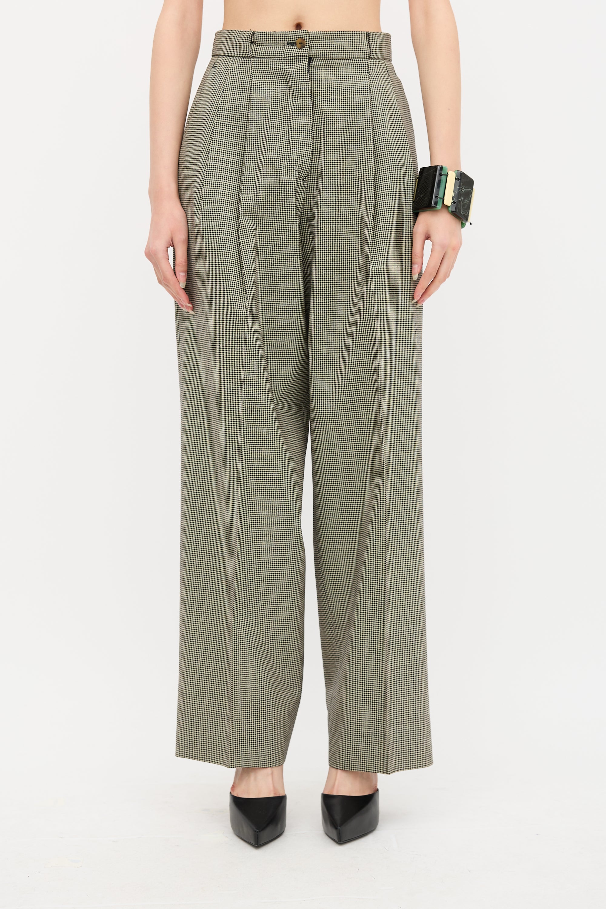 Pre-owned Jean Paul Gaultier pour Gibo vintage late 1980's black and cream check pattern trousers featuring a zip fly, belt loops, pleated front, two slip pockets at front hip, and pressed seams at a wide leg.